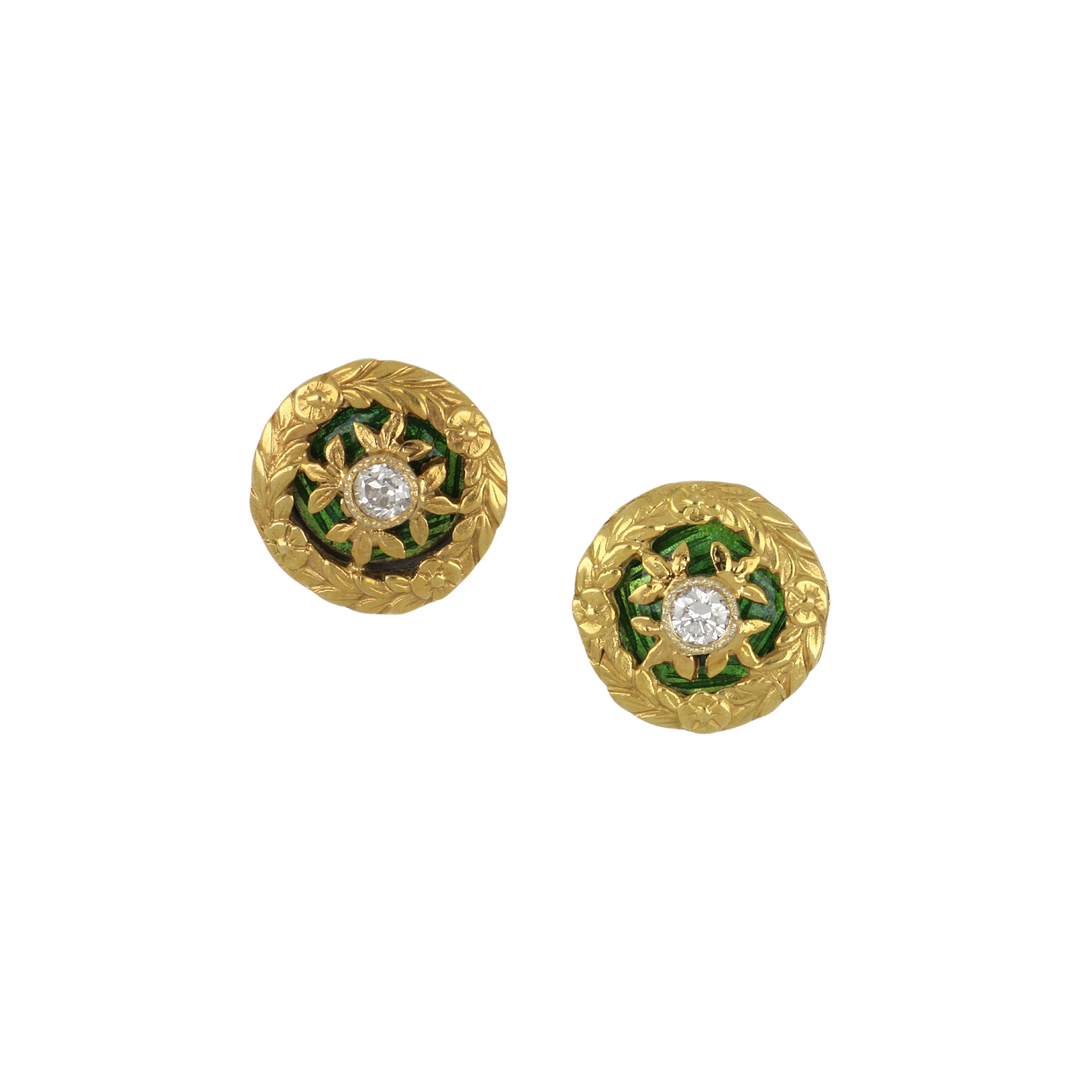 A pair of Art Nouveau guilloche green enamel garland stud earrings with Old Euroopean-cut diamond centers, set in 18K yellow gold. Circa 1900.