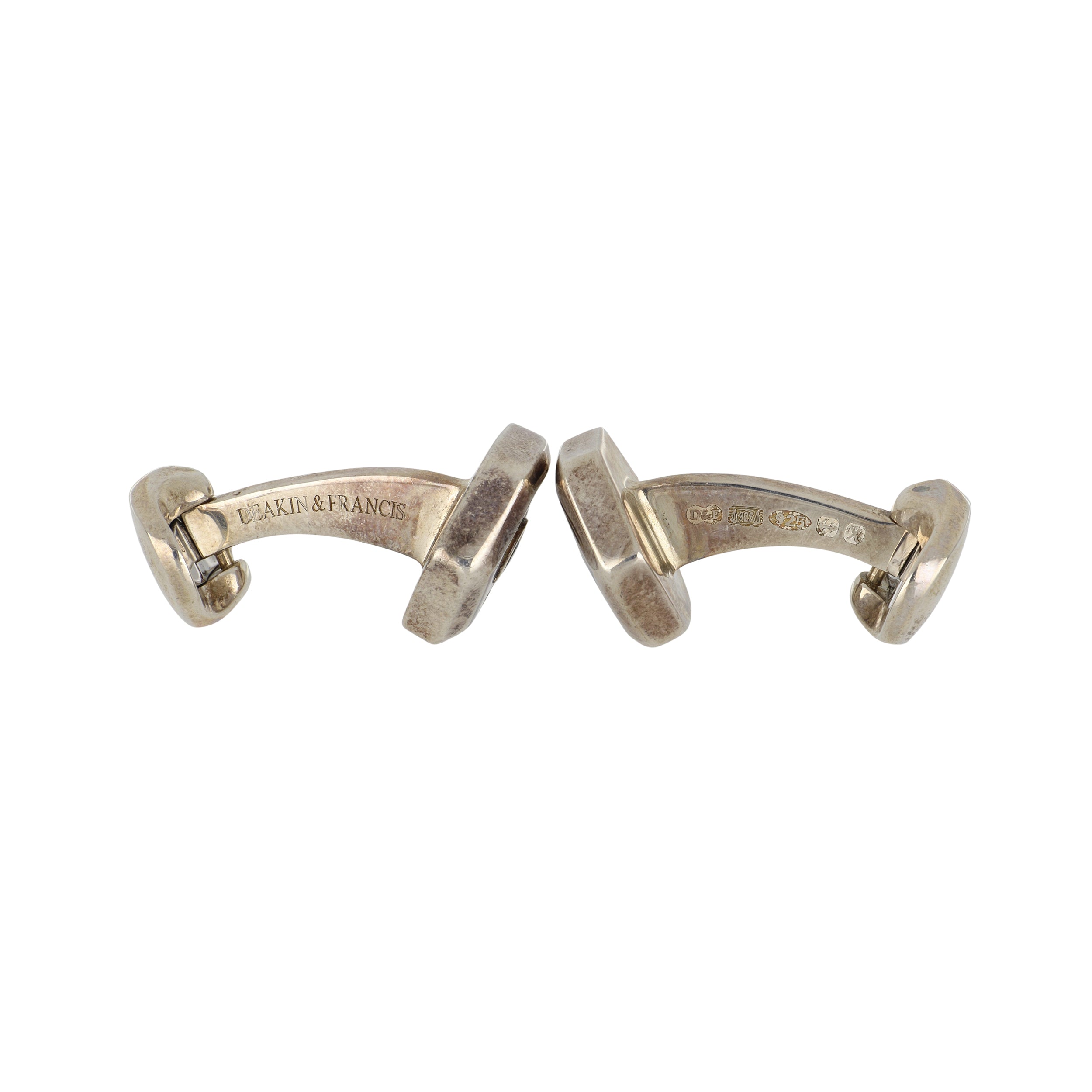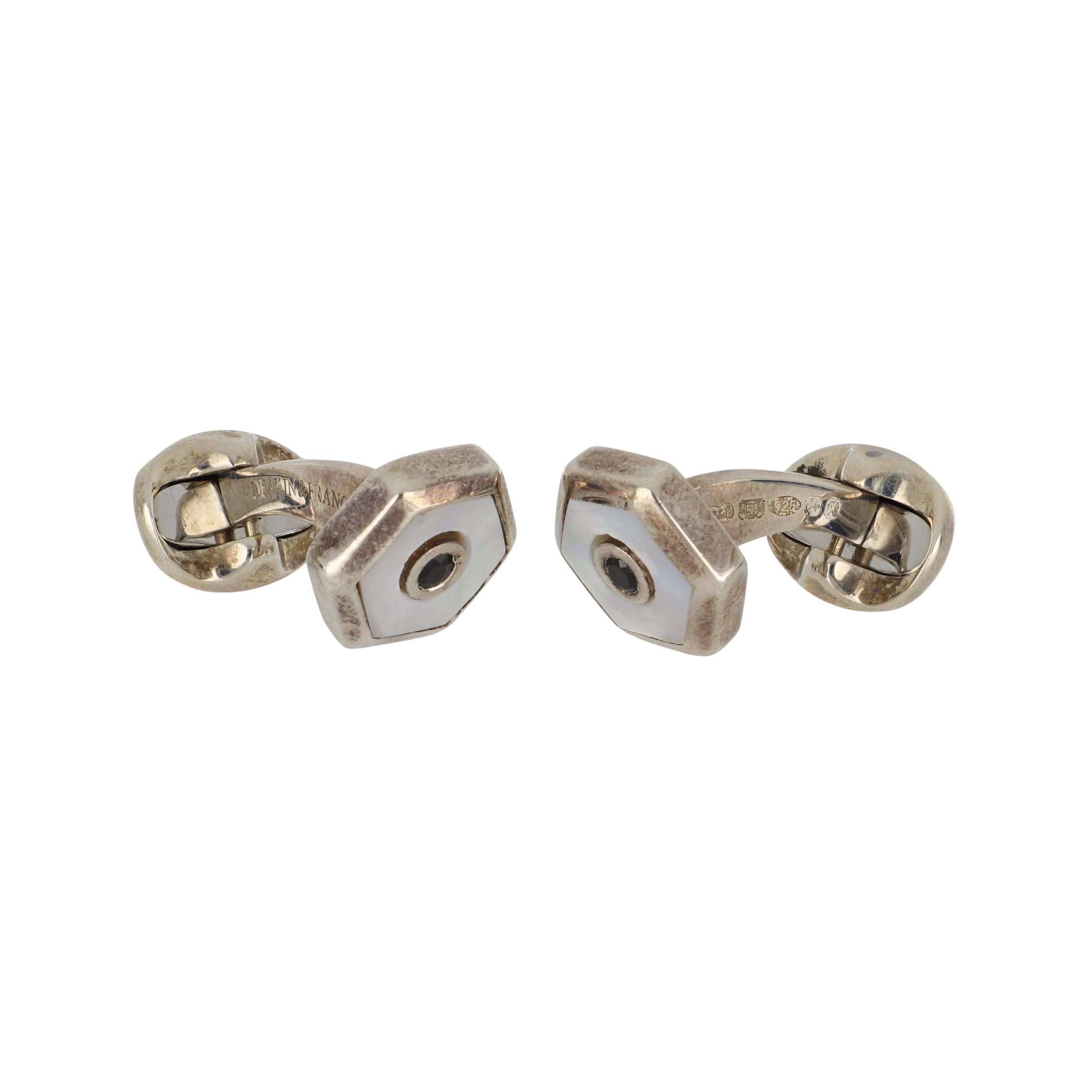A pair of Deakin & Francis sterling silver hexagonal white mother of pearl and black spinel cufflinks.