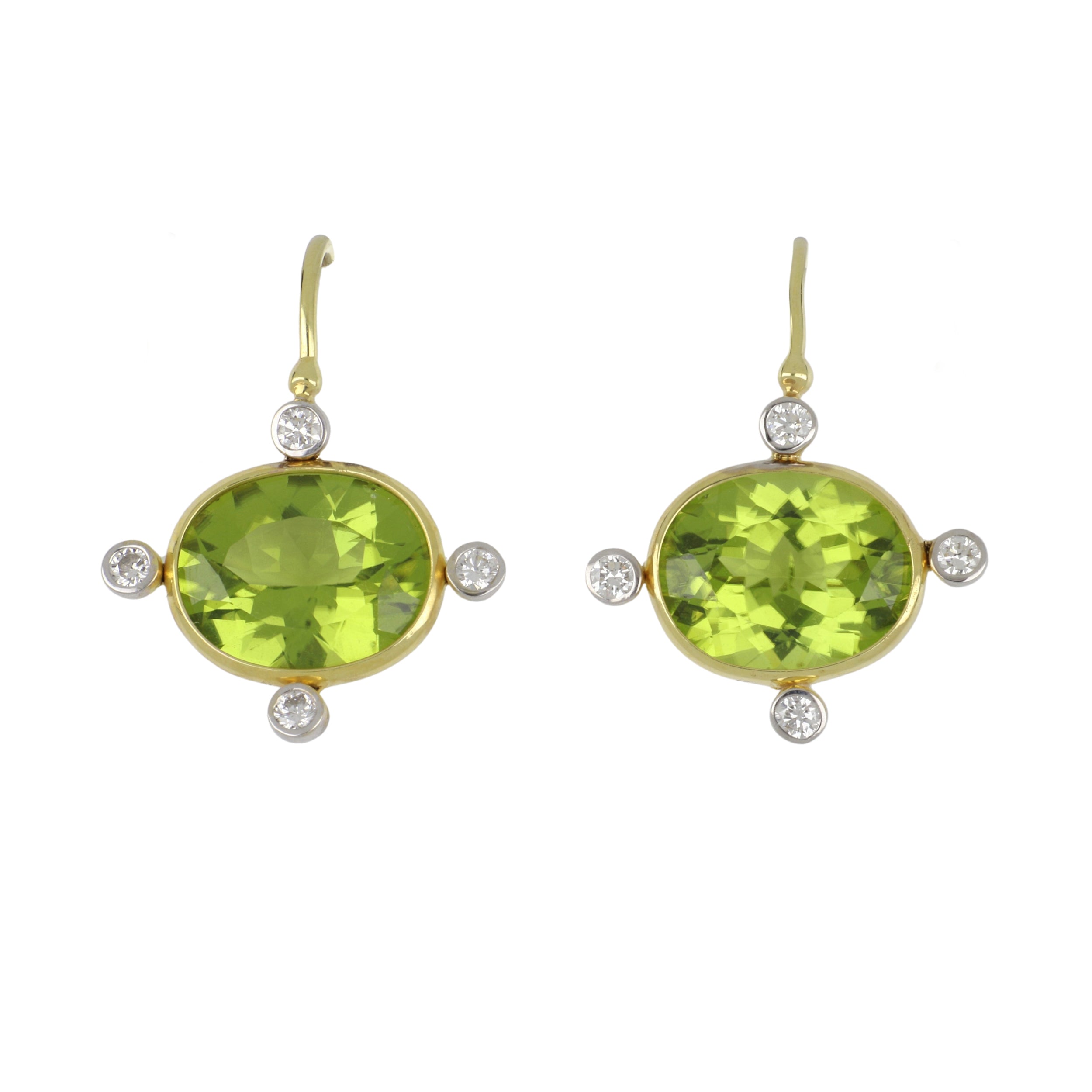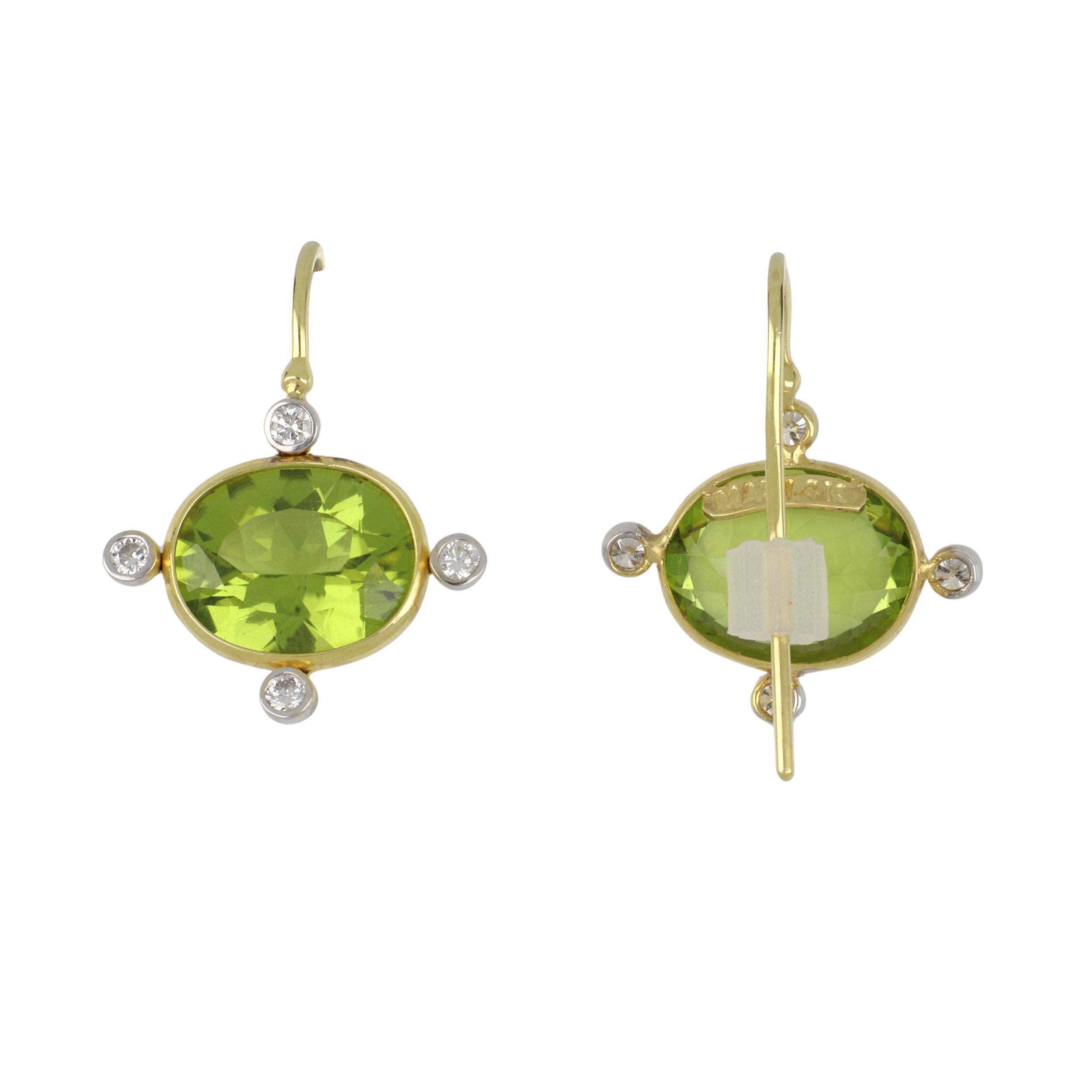 A pair of Mazza faceted peridot drop earrings with diamond accents, set in 14K yellow gold.