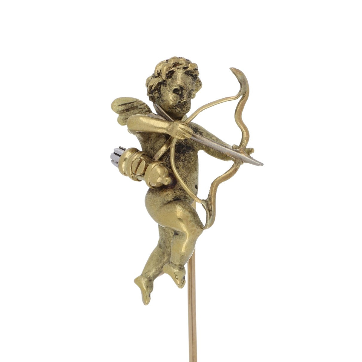 An antique18K yellow gold cupid pin with bow & arrow & quiver with 18K white gold arrows. France, circa 1910.