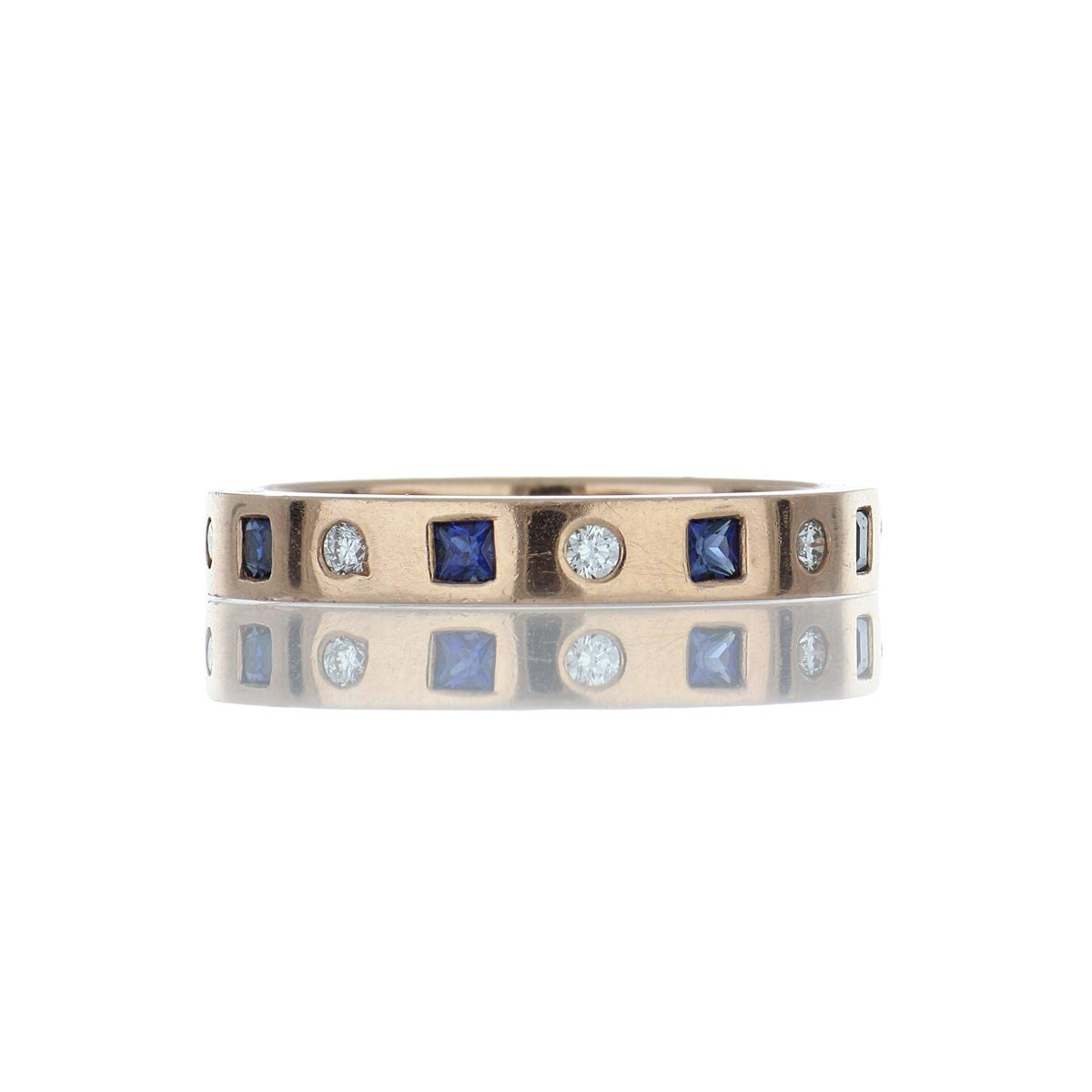 An estate modern, alternating square-cut sapphire and round brilliant-cut diamond band in 18k rose gold.