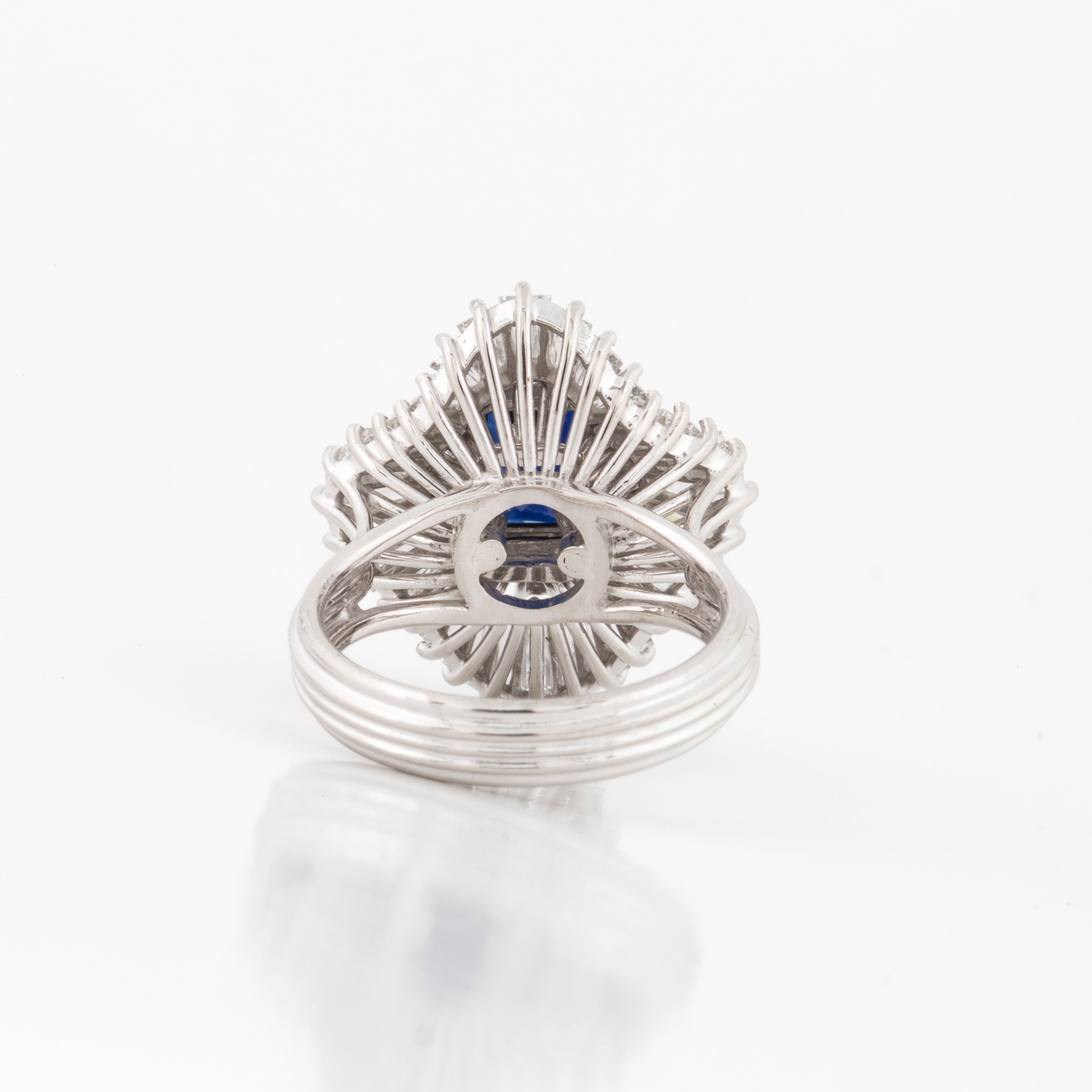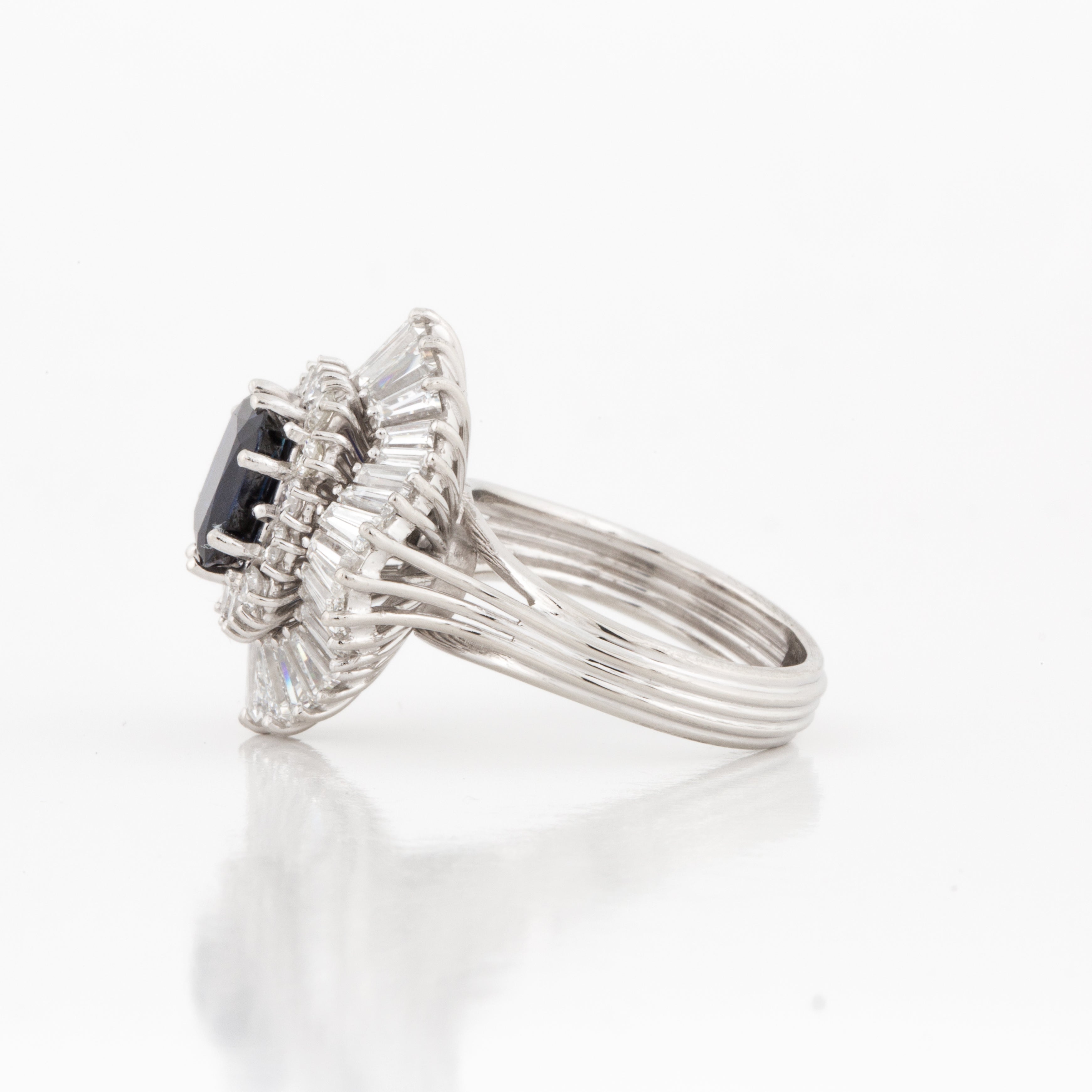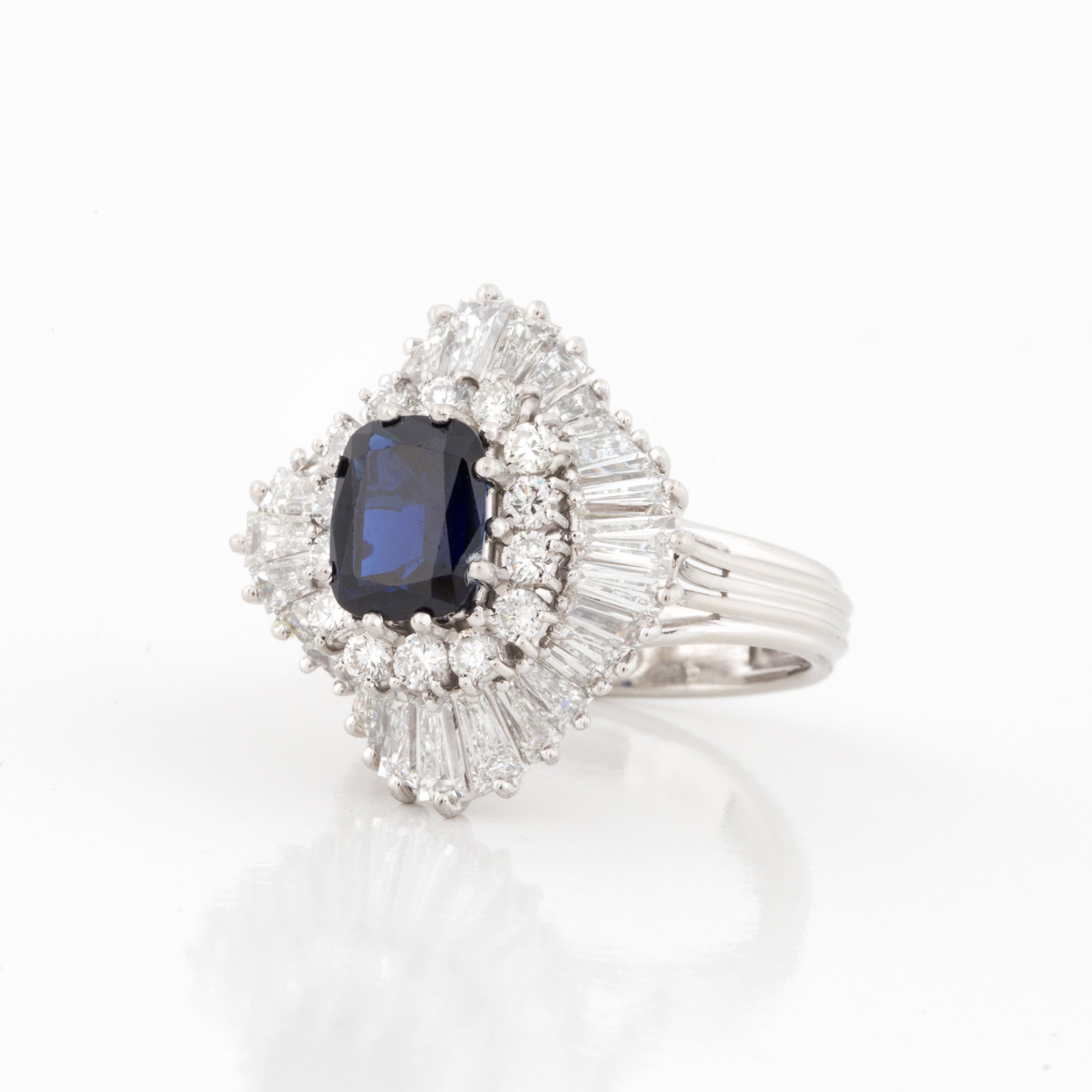 A vintage ballerina ring featuring a cushion-cut sapphire with round and baguette-cut diamonds, set in platinum. Circa 1970.