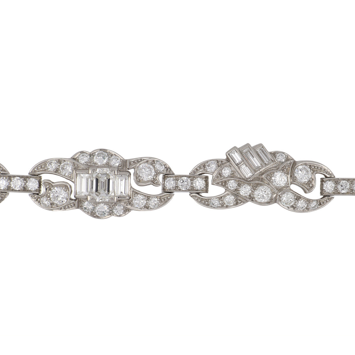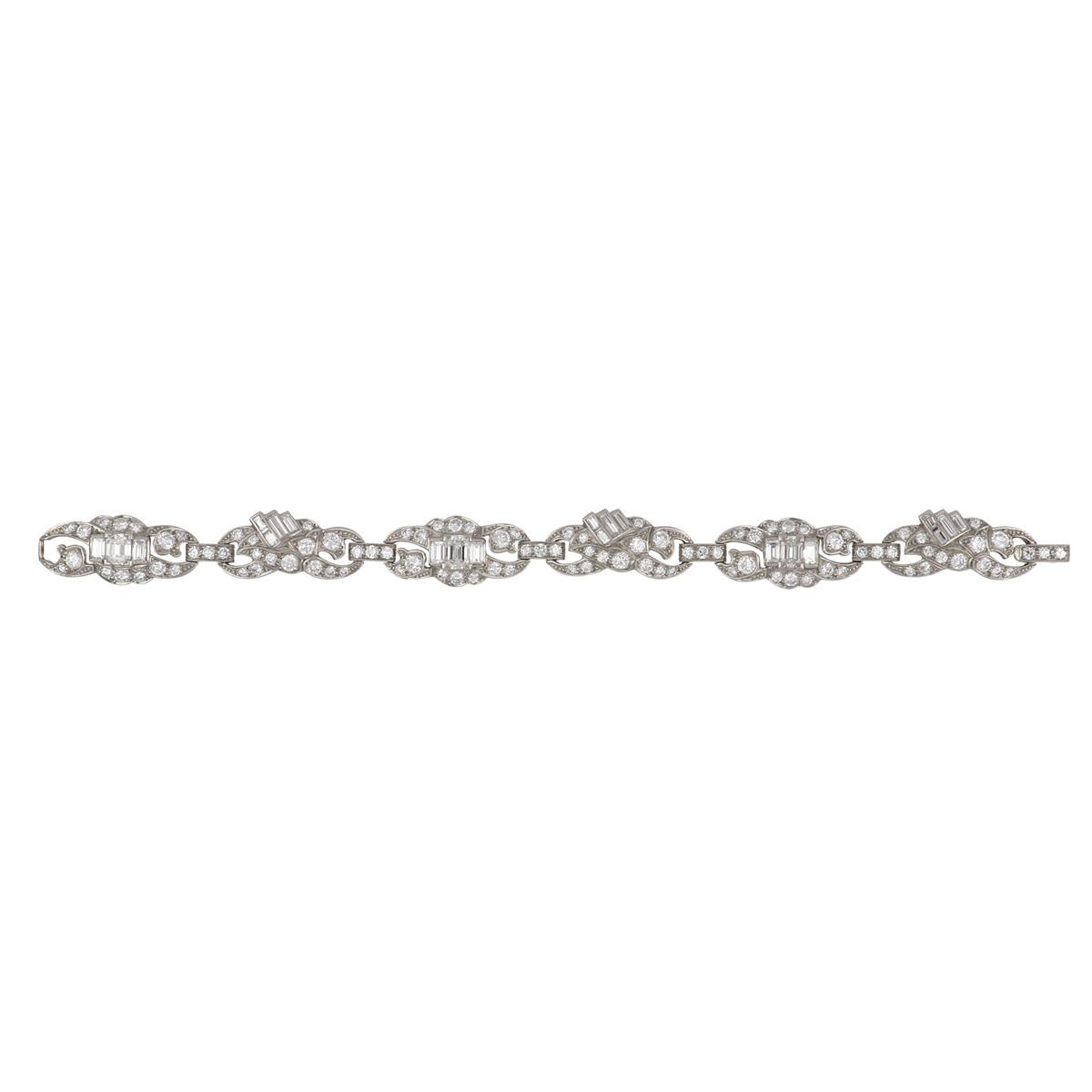 An Art-Deco openwork step-cut and transitional round brilliant-cut diamond plaque bracelet in platinum. Signed: Mathey Tissot, Circa 1935.