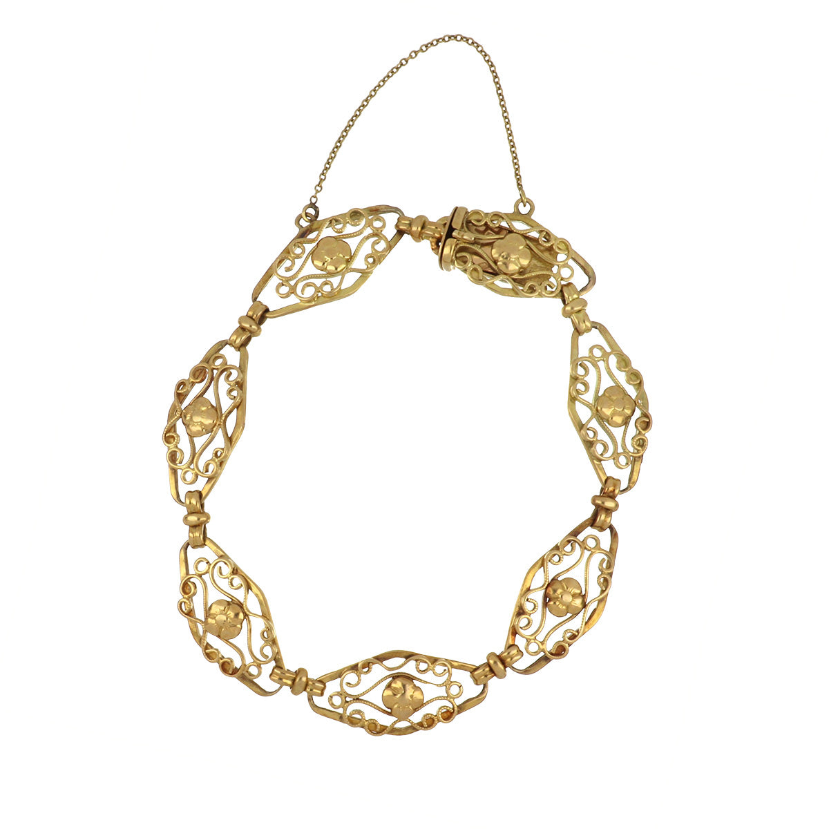 An Art Nouveau 18K yellow gold openwork floret navette-shaved link bracelet. Circa 1900, with french hallmarks.