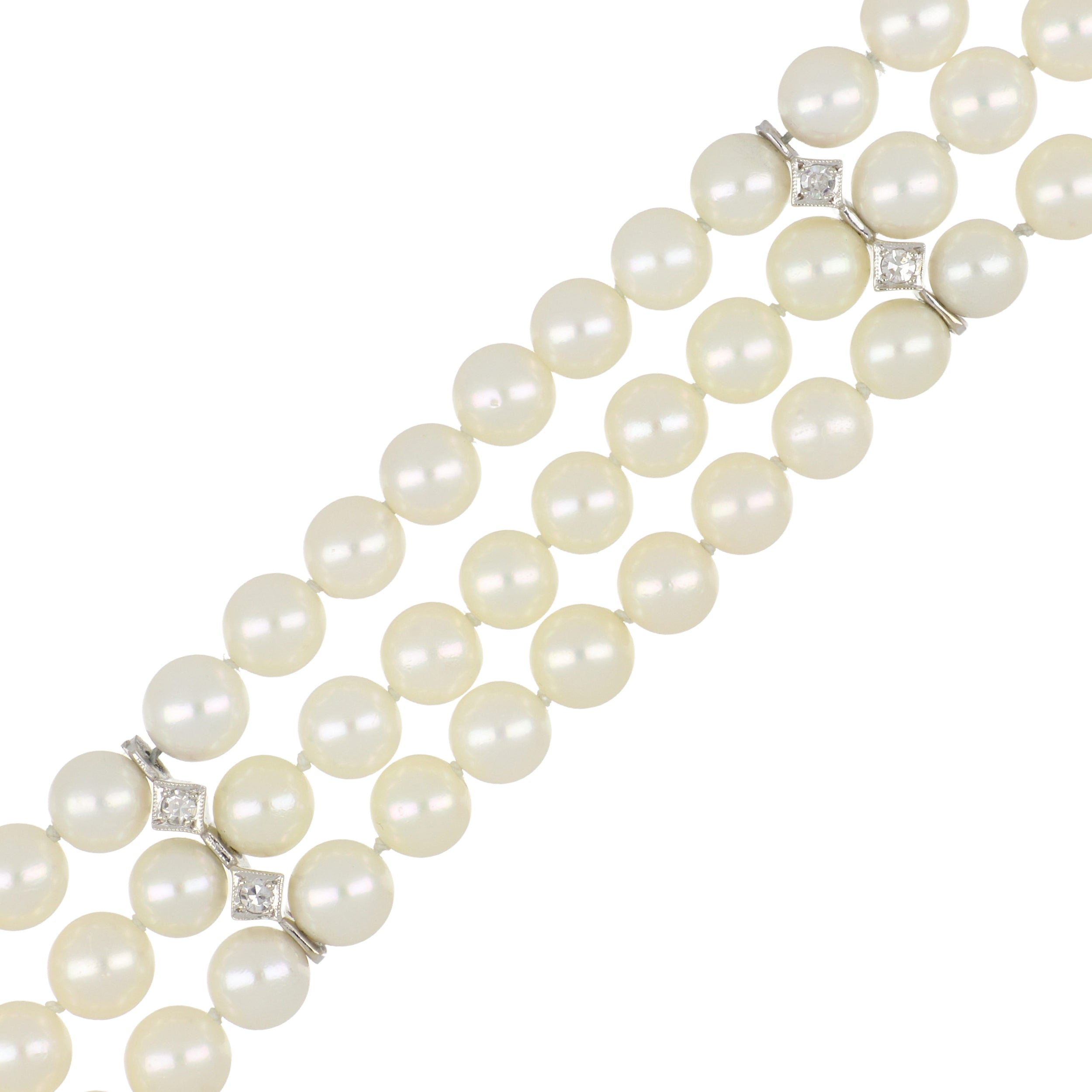 A Mid-Century triple strand cultured pearl bracelet with single-cut diamonds, set in 14K white gold. Circa 1950.