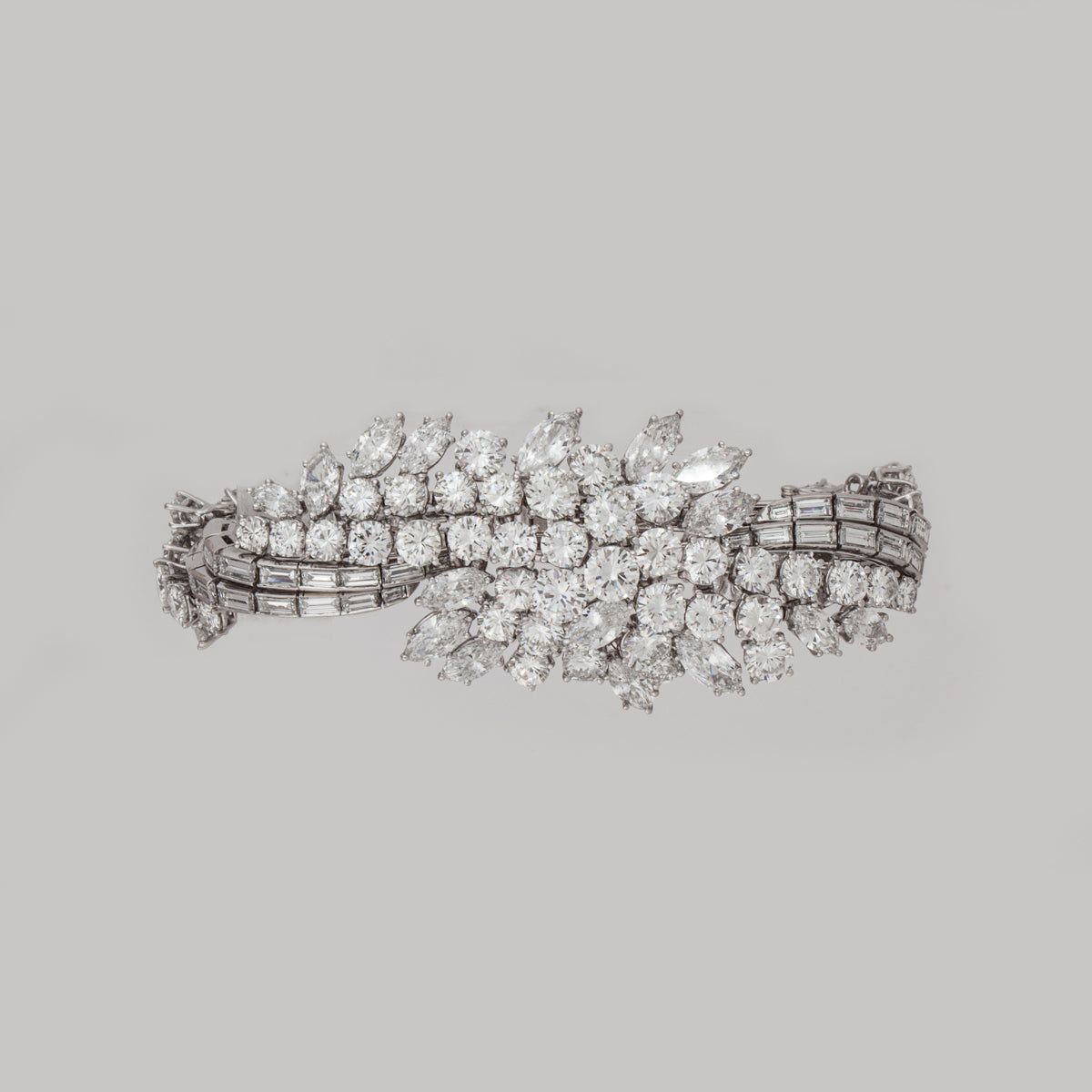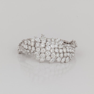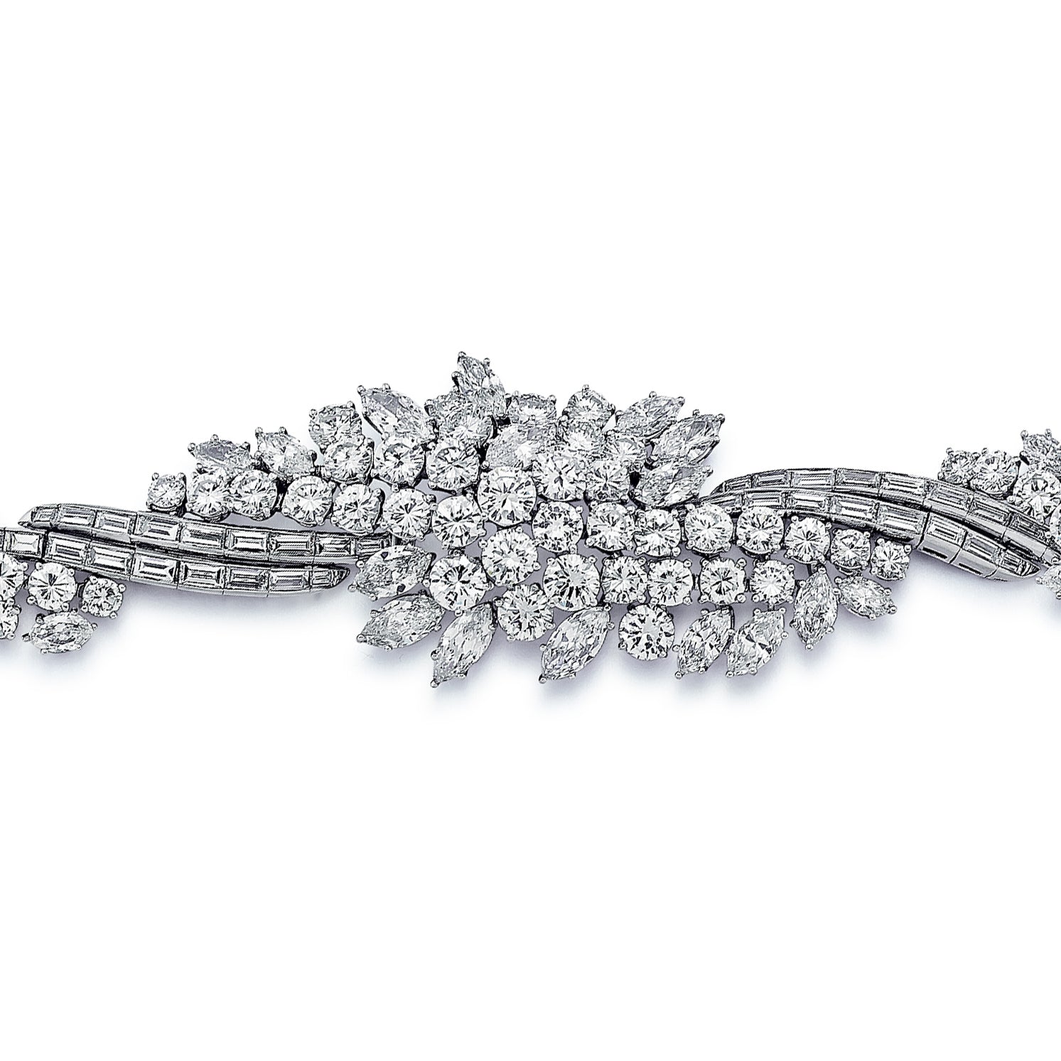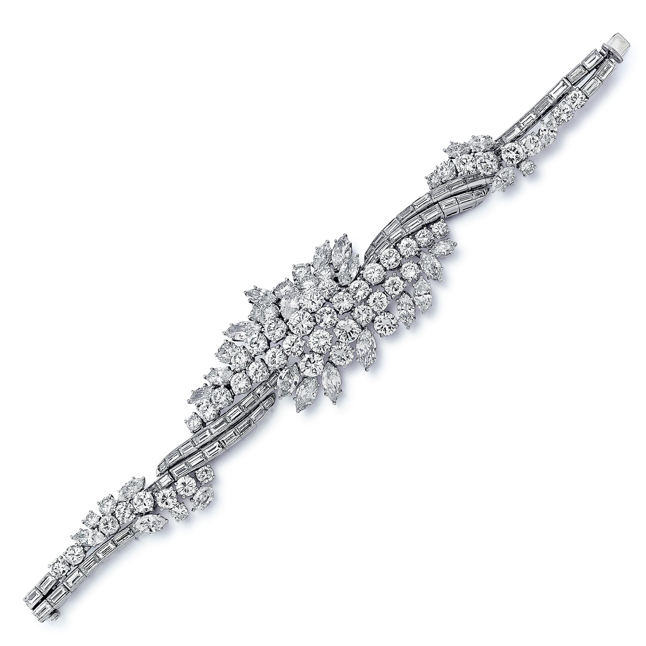 A Mid-Century marquise-cut, baguette-cut, and round brilliant-cut diamond stylized floral bracelet with an undulating cluster design, set in platinum. Circa 1950.