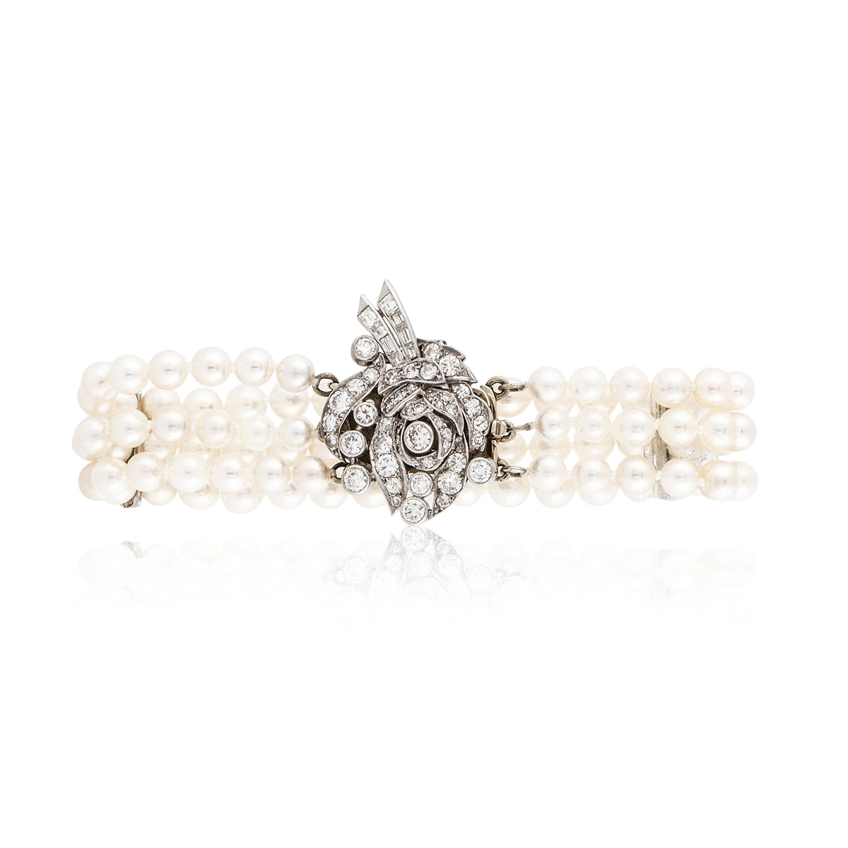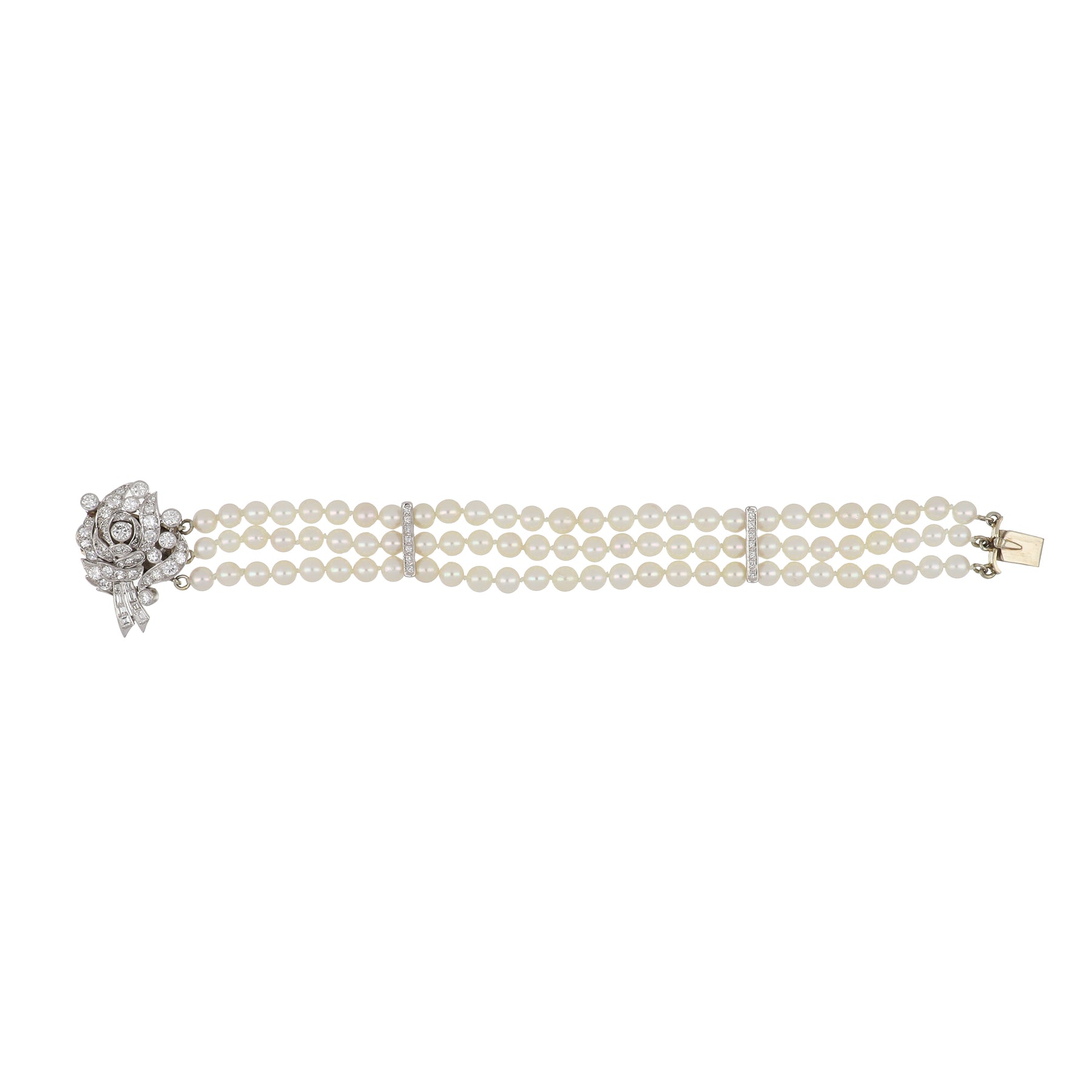 A Retro three strand pearl bracelet with a round brilliant-cut and baguette-cut diamond clasp and spacers, set in platinum and 14K white gold. Circa 1940.