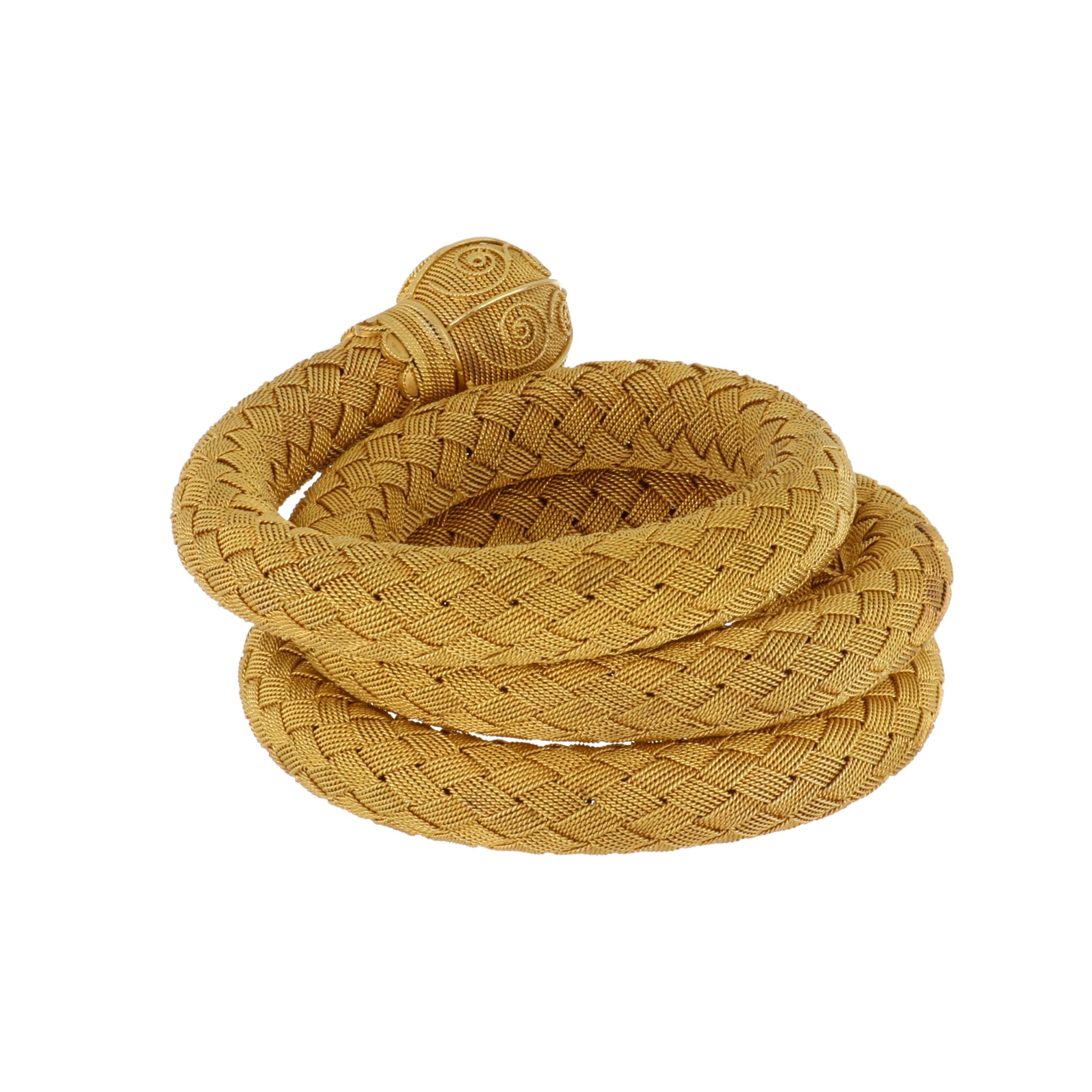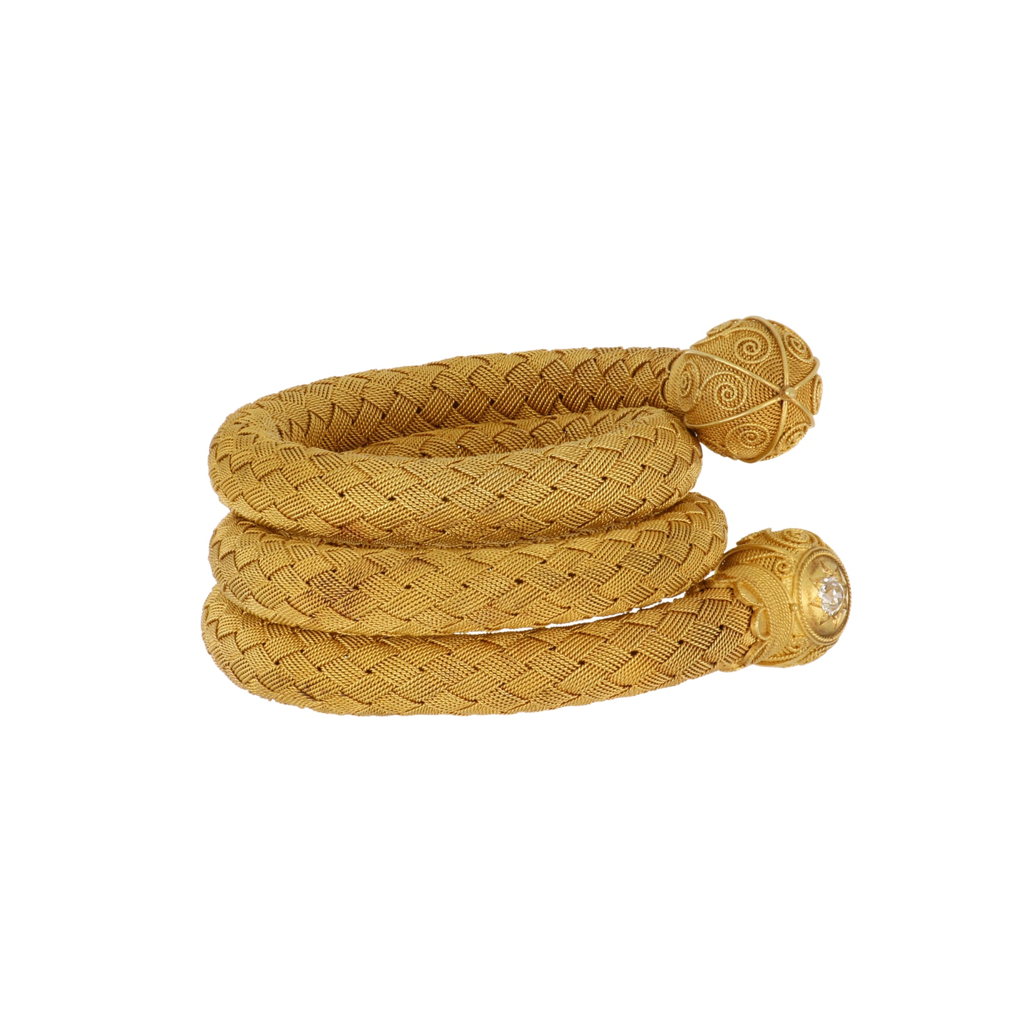 A Victorian Etruscan Revival woven triple wrap bracelet with a single starburst setting containing an Old European-cut round diamond, set in 14K yellow gold. Circa 1860.