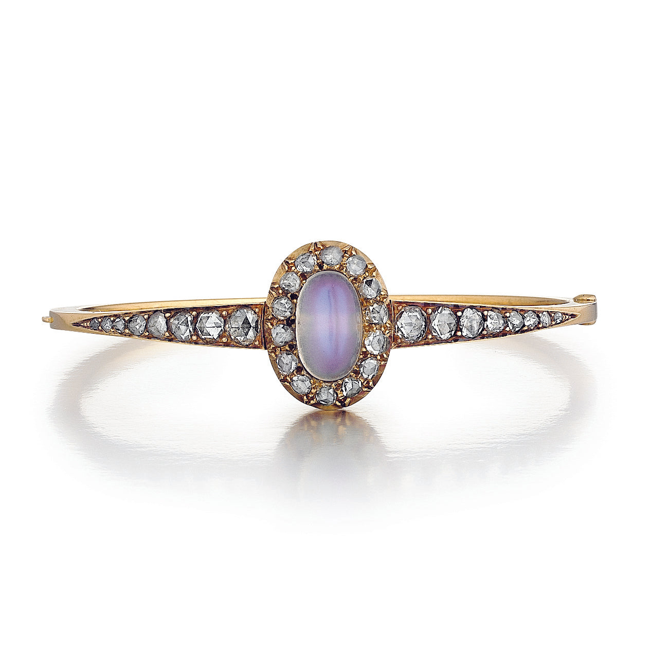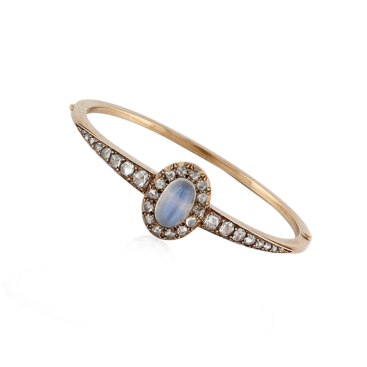 A Victorian oval cabochon moonstone and rose-cut diamond bangle bracelet, in 18K yellow gold. Circa 1890.Antique CollectionDiamonds: 2.30 total carat weightSize: 6.50