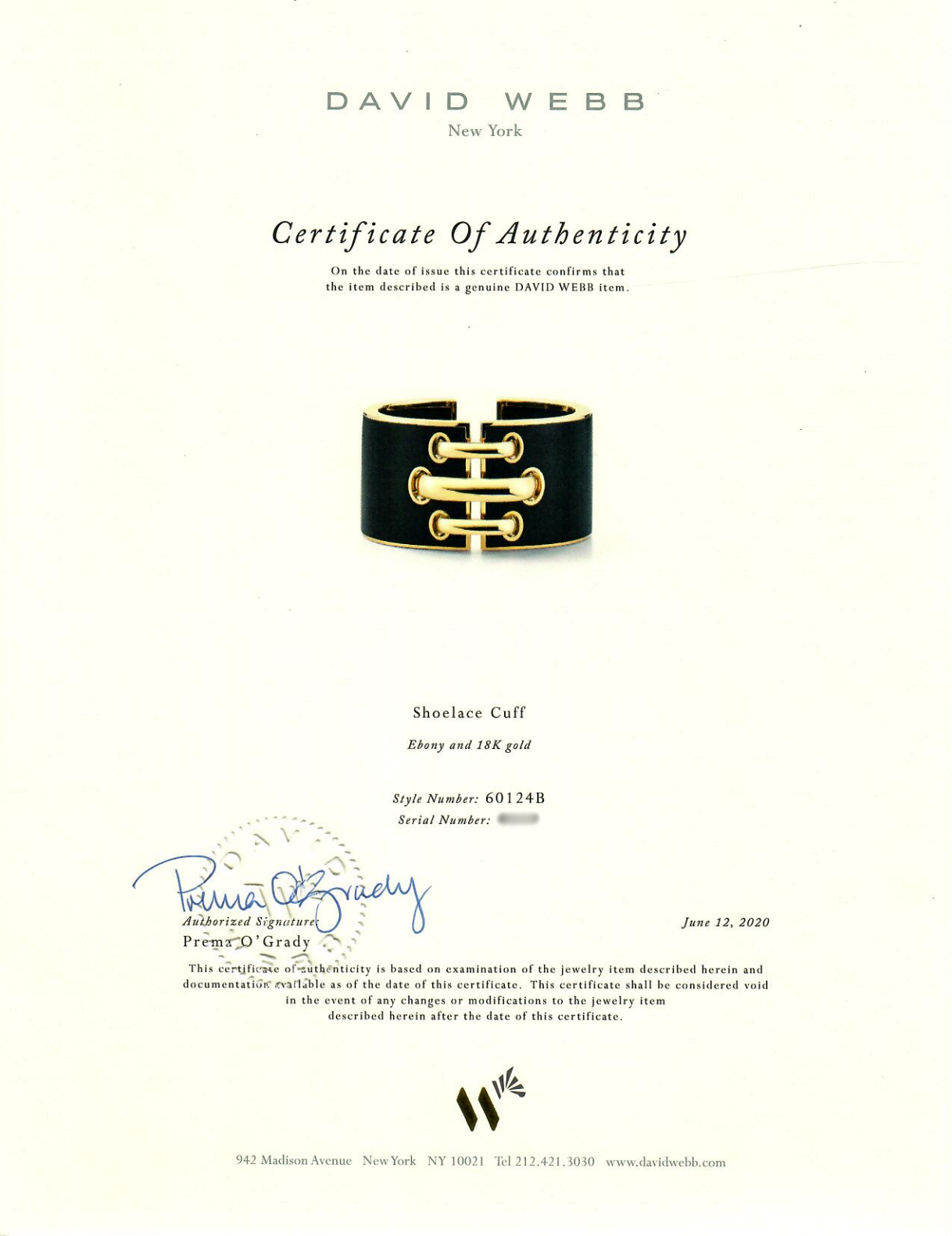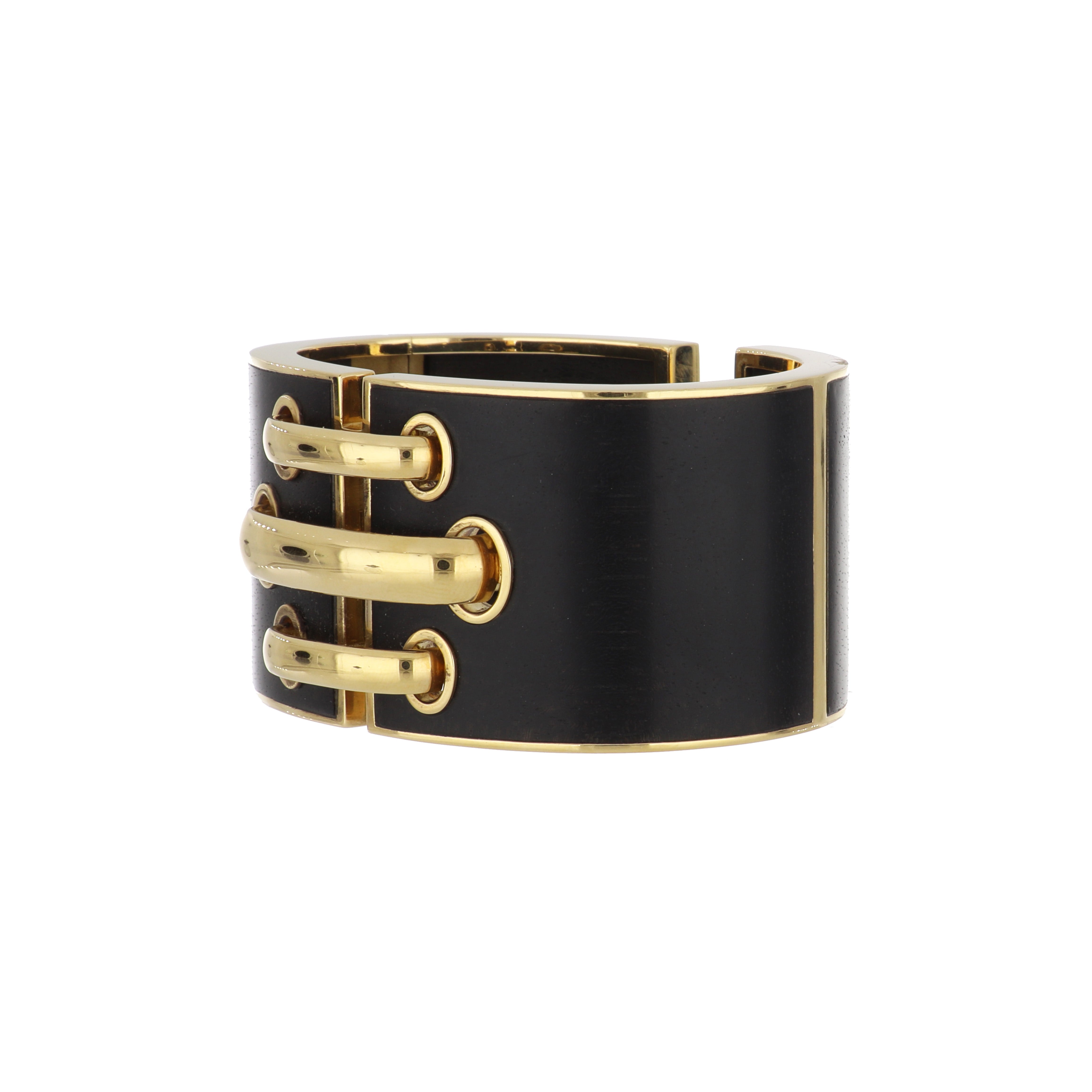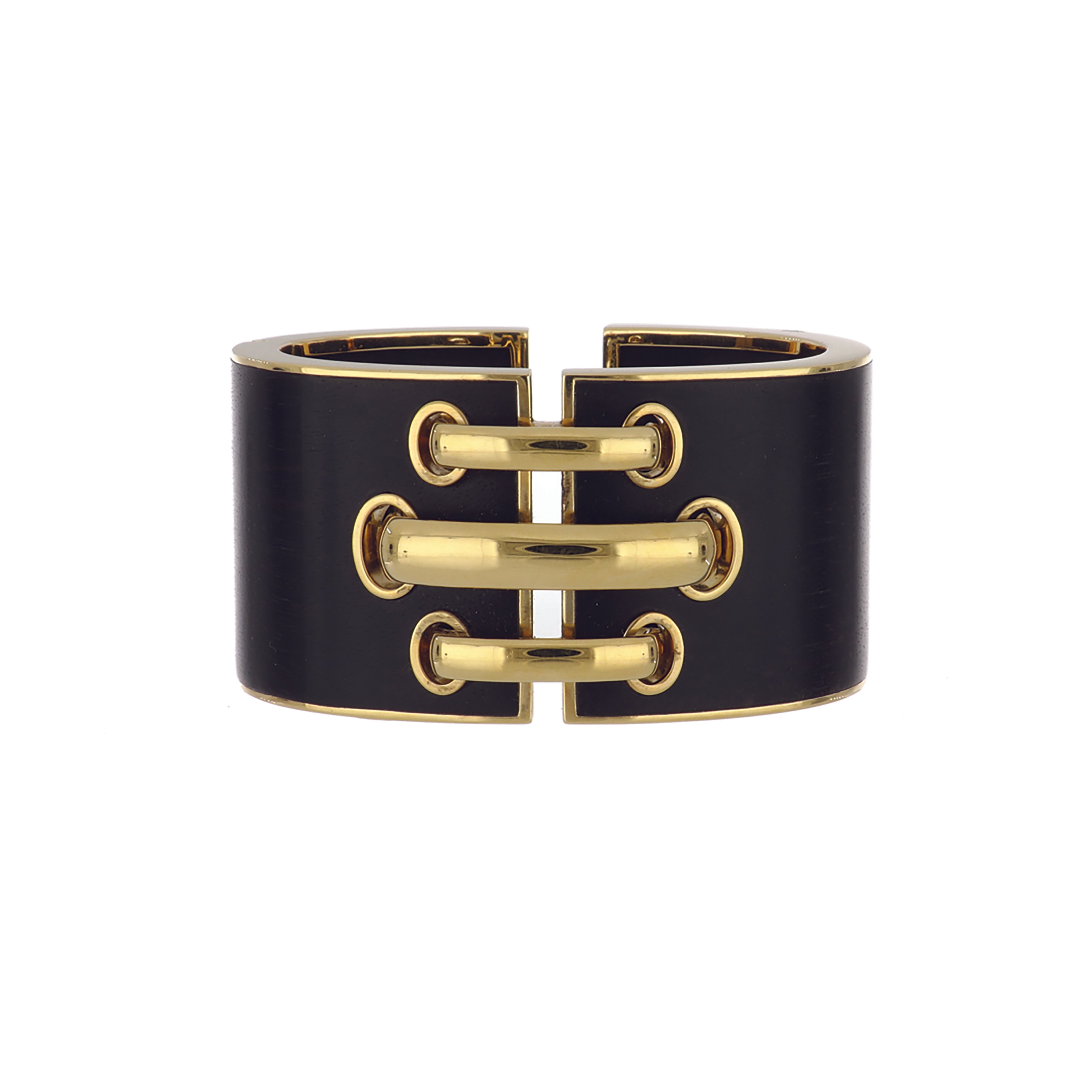 A classic David Webb polished ebony shoelace cuff, set in 18K yellow gold.