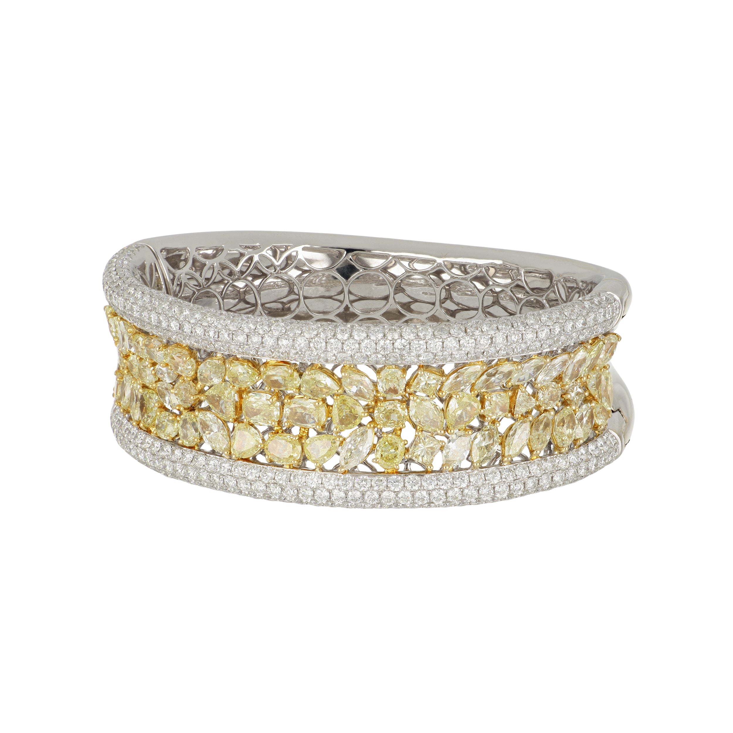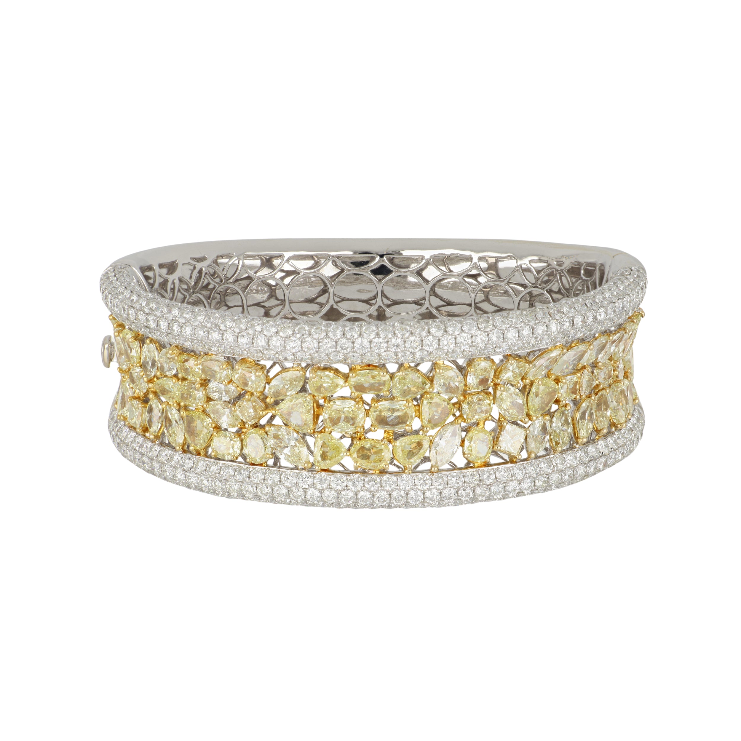 An estate latticed cobblestone bangle bracelet with fancy shape, fancy yellow diamonds and pave white round diamonds, set in 18K white and yellow gold. Circa 2010.