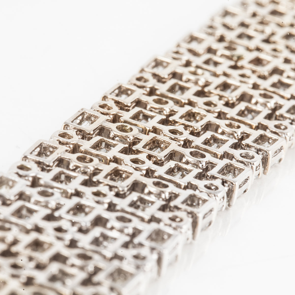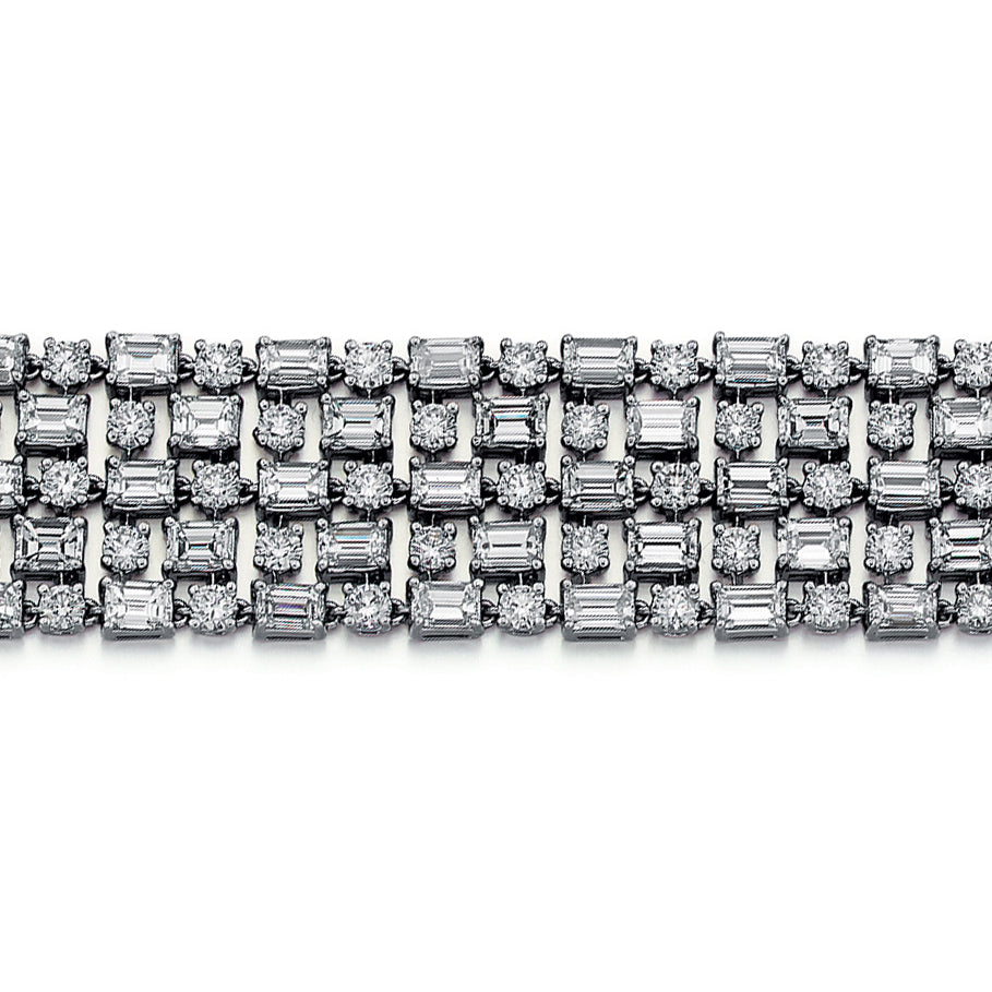 An estate emerald-cut and round brilliant-cut diamond wide articulated bracelet, set in 18K white gold. Circa 2000.