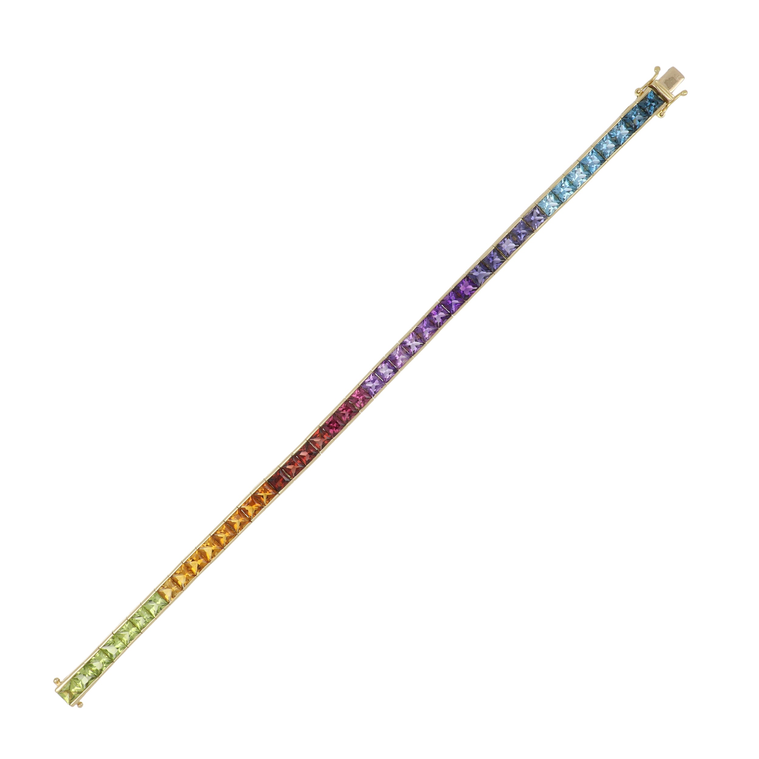 An estate H.Stern princess-cut multi-gem ombre rainbow line bracelet, set in 18K yellow gold. Stones include peridot, citrine, garnet, amethyst, iolite and topaz. Circa 2000. Signed: H.S