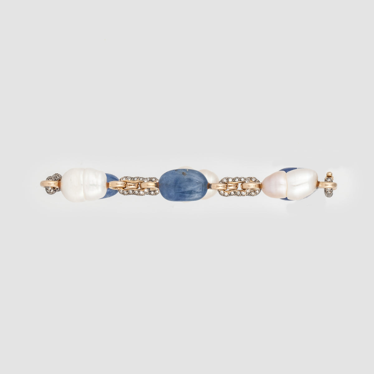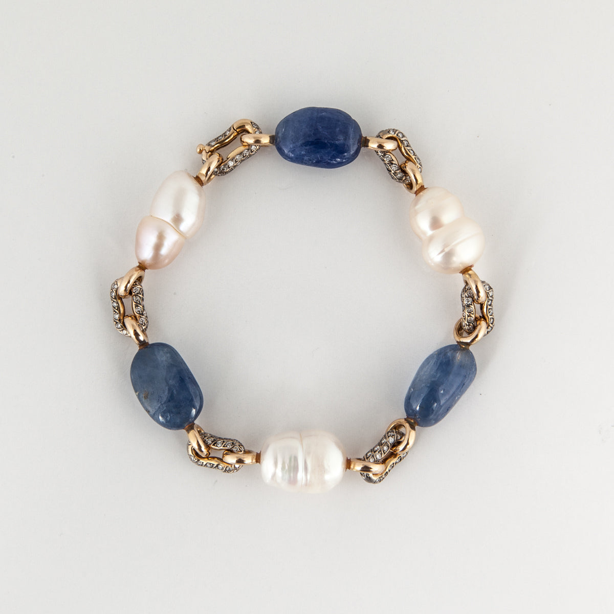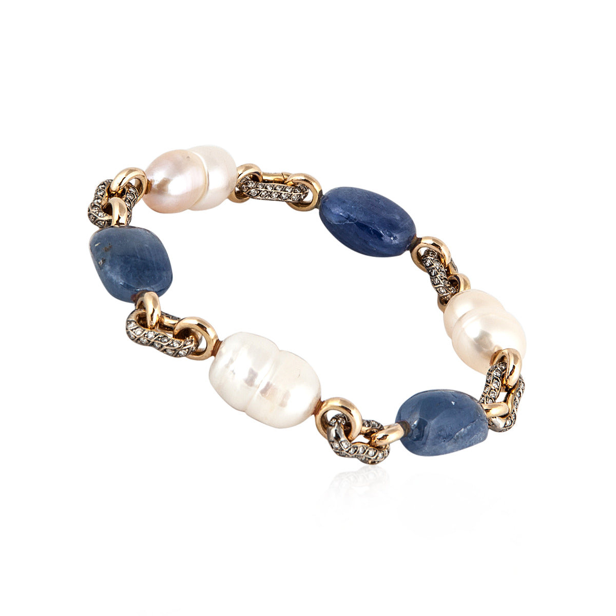 An estate Zorab sapphire pebble and South Sea baroque pearl bracelet with round-cut diamond accents, set in 18K yellow gold. Circa 2000.