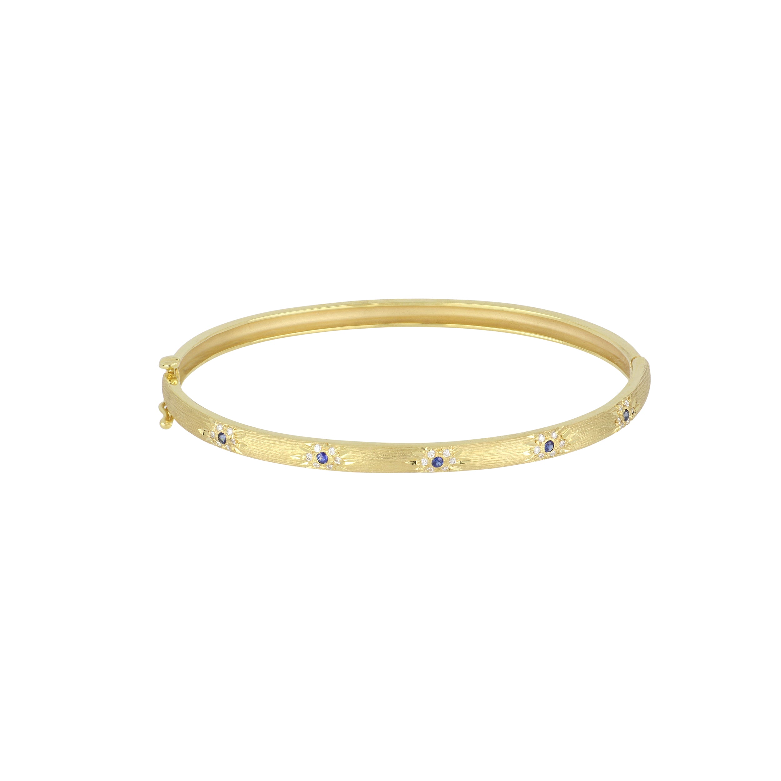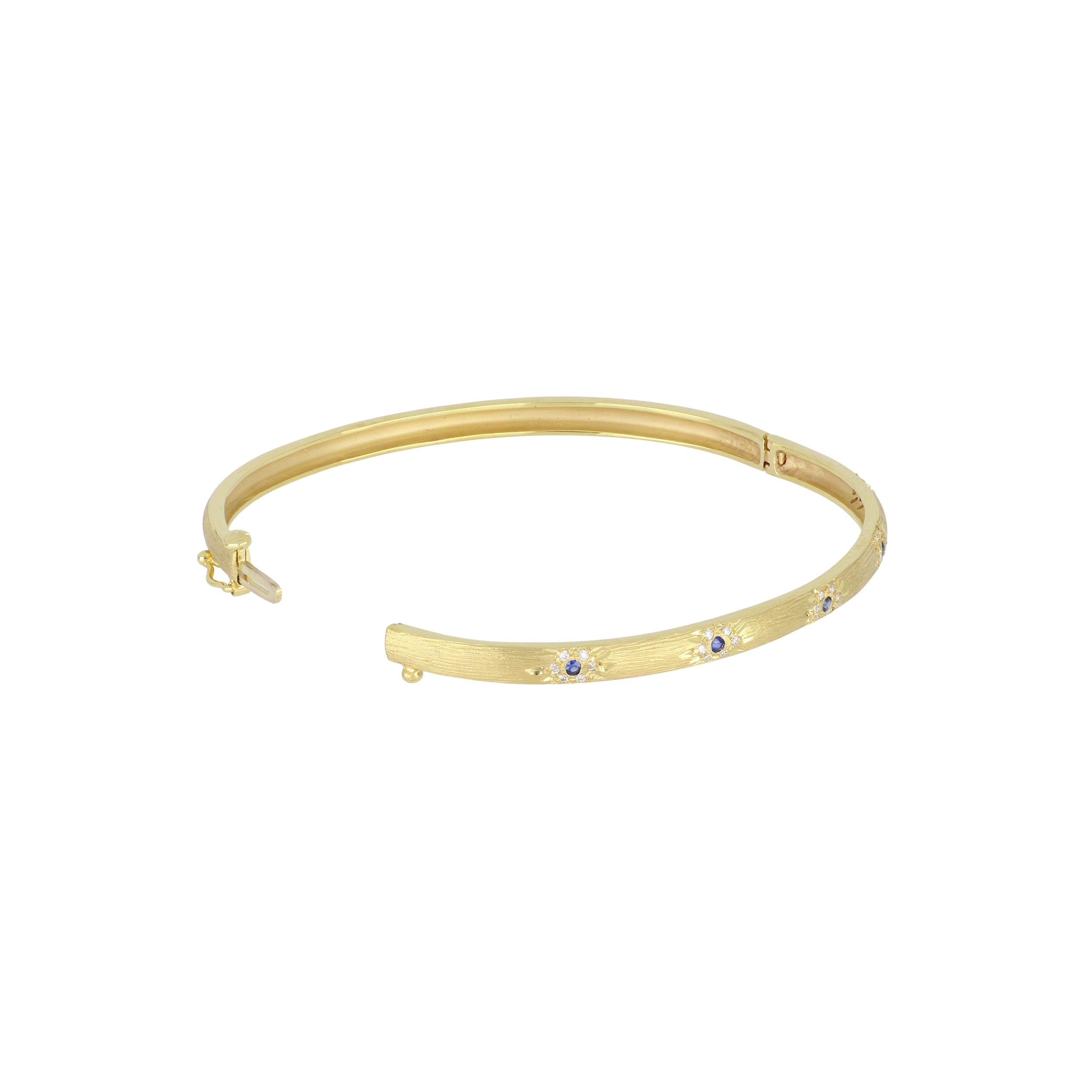 A Mazza bangle bracelet with a florentine finish with inset sapphires and diamonds, set in 14K yellow gold.