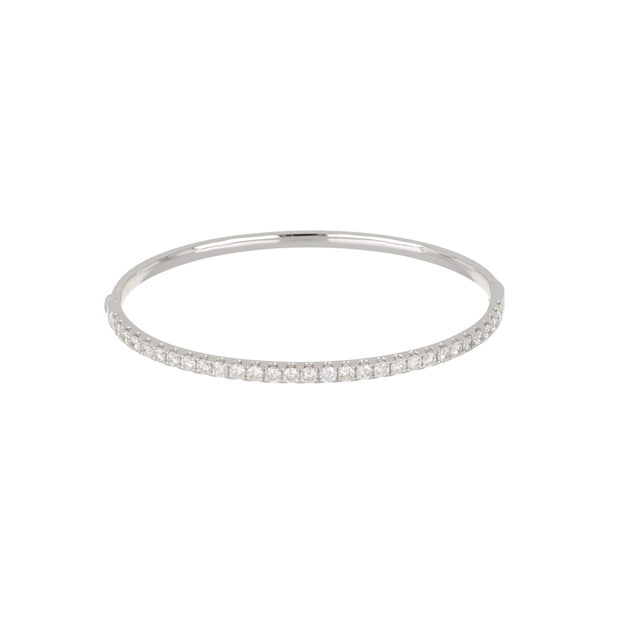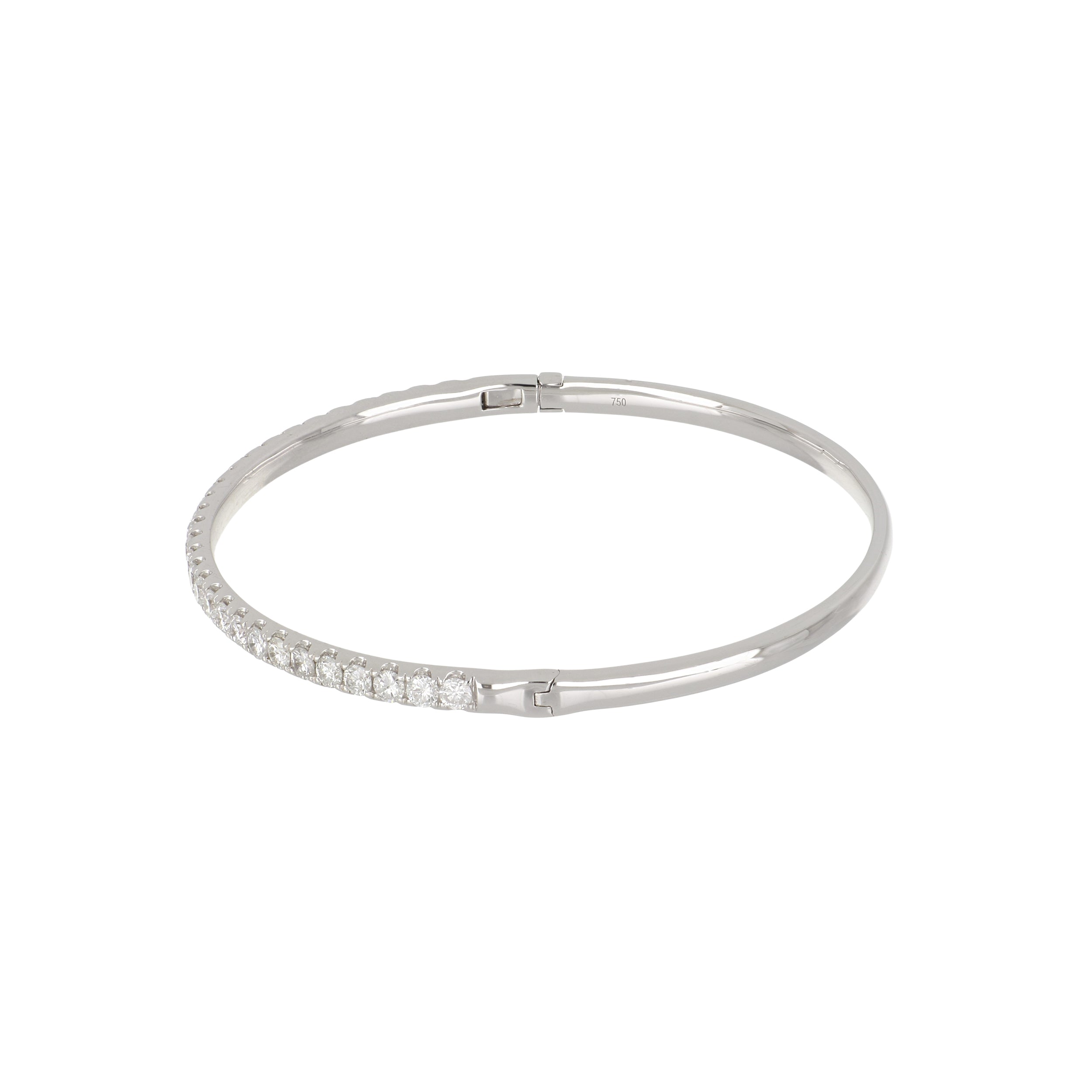 A round-cut diamond hinged bangle bracelet, set in 18K white gold.