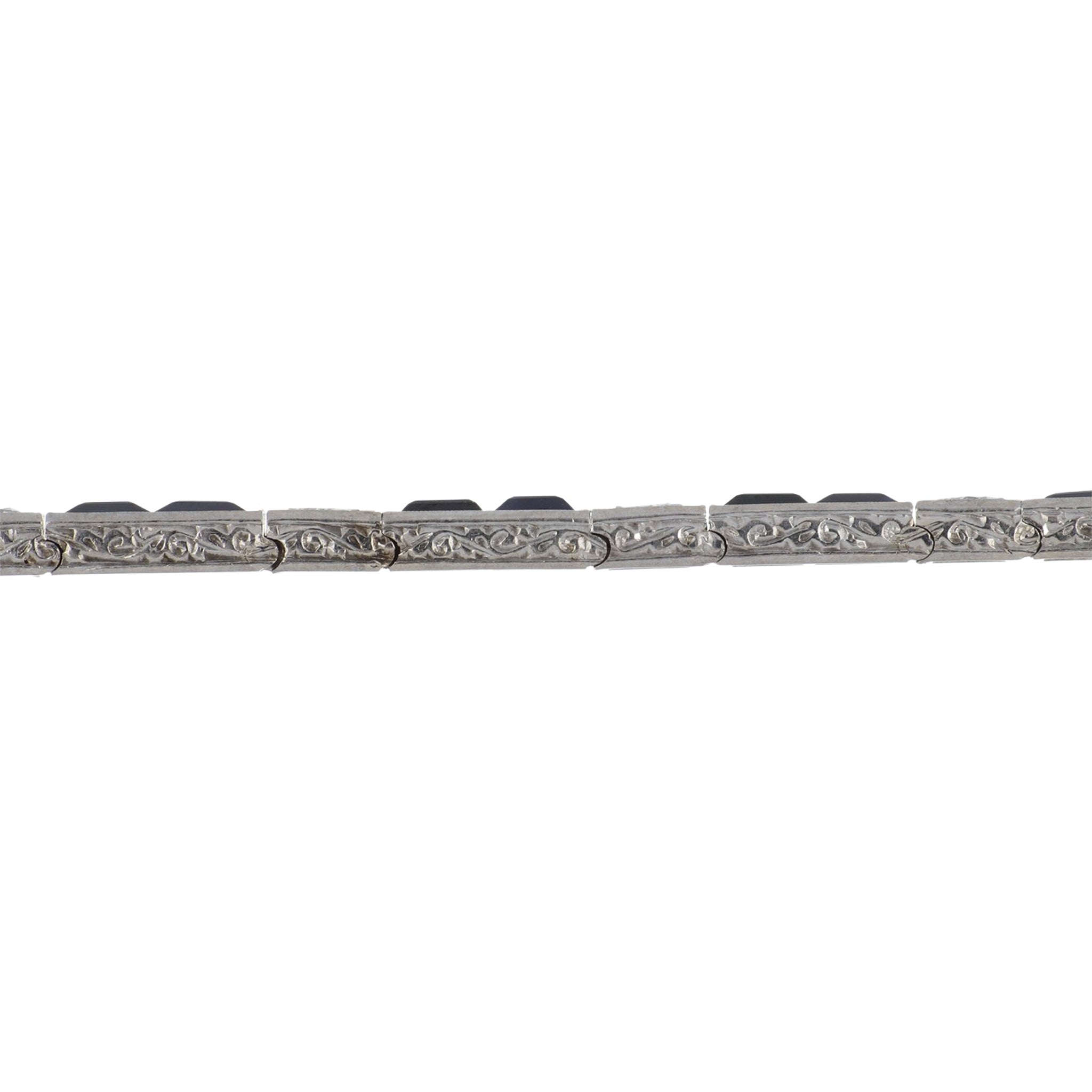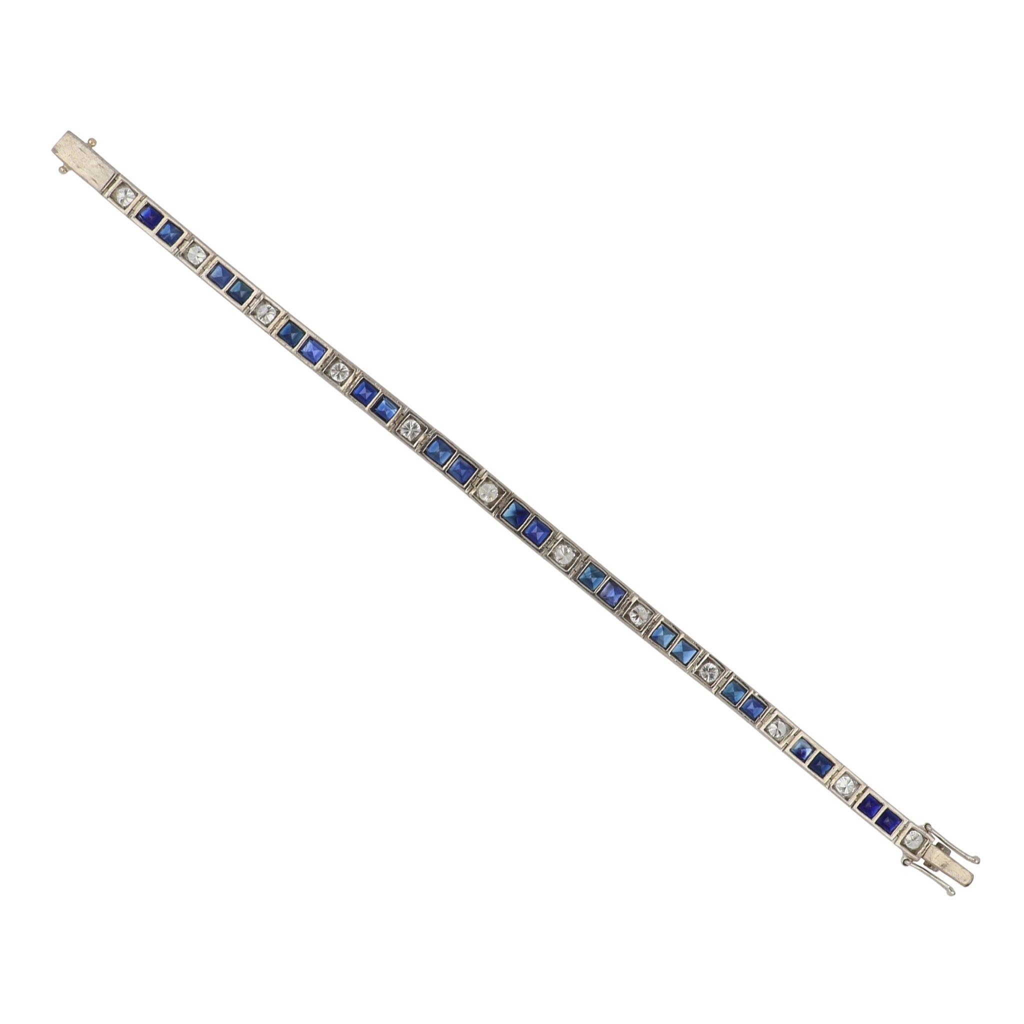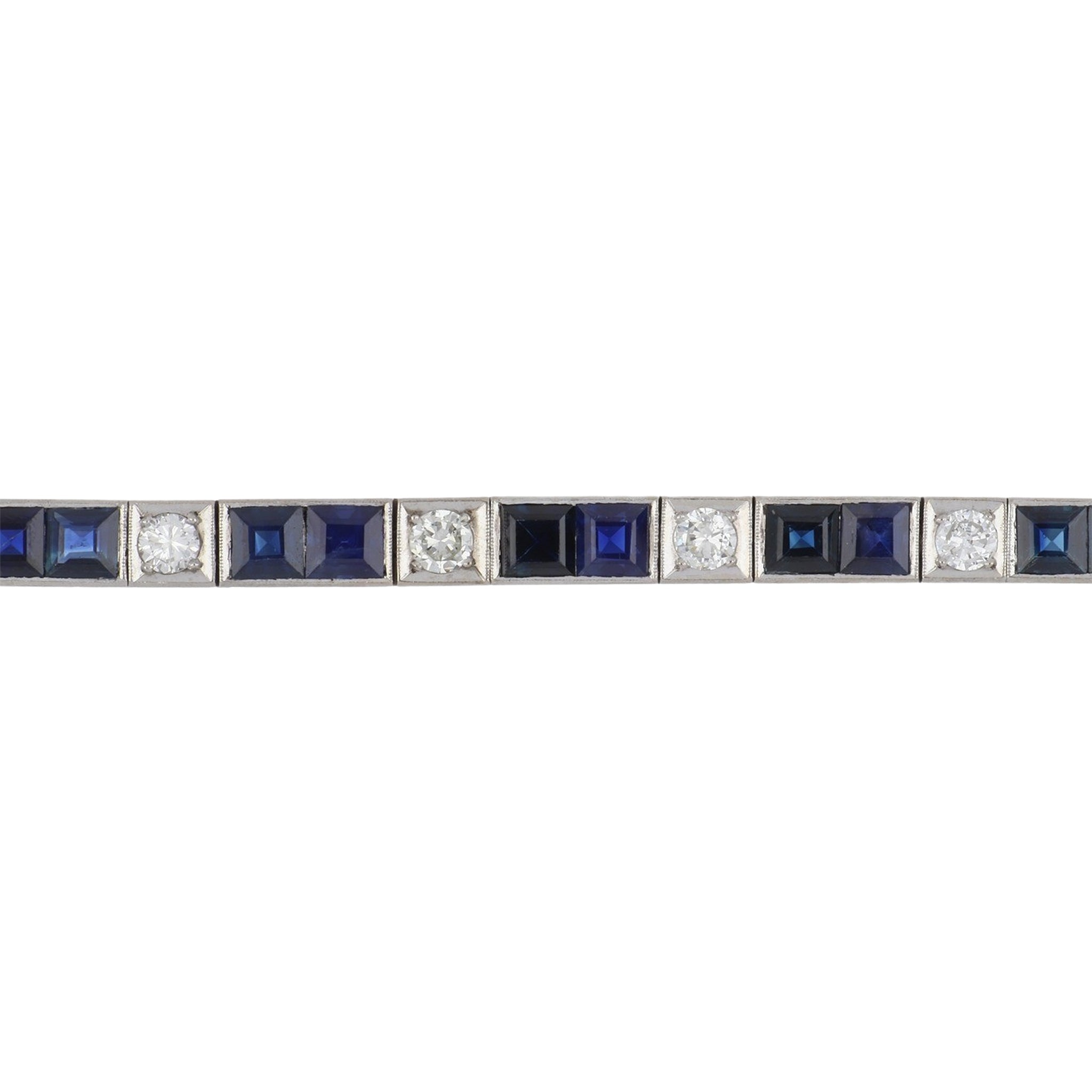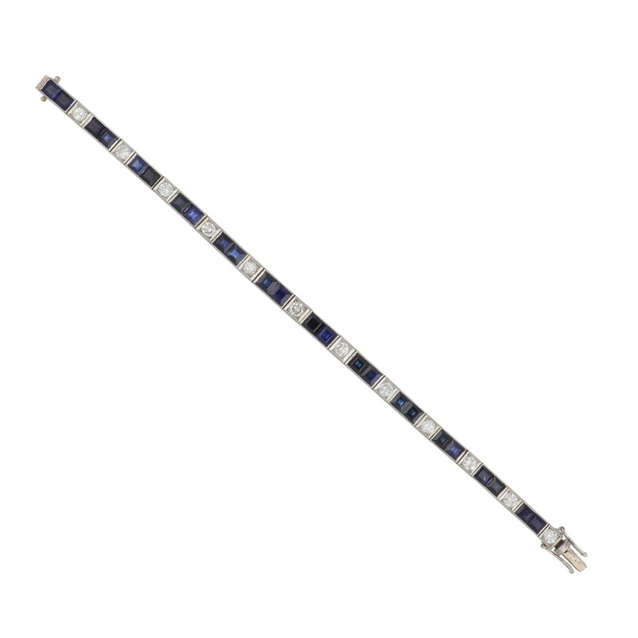 A vintage Art Deco–style line bracelet featuring channel-set square sapphires and round brilliant-cut diamonds, set in 14K white gold. Circa 1980.