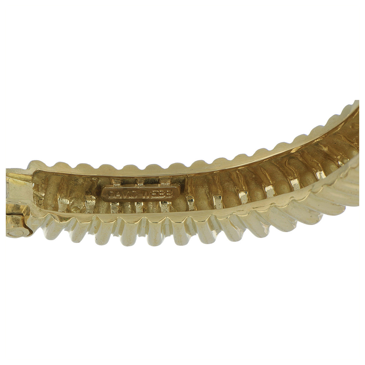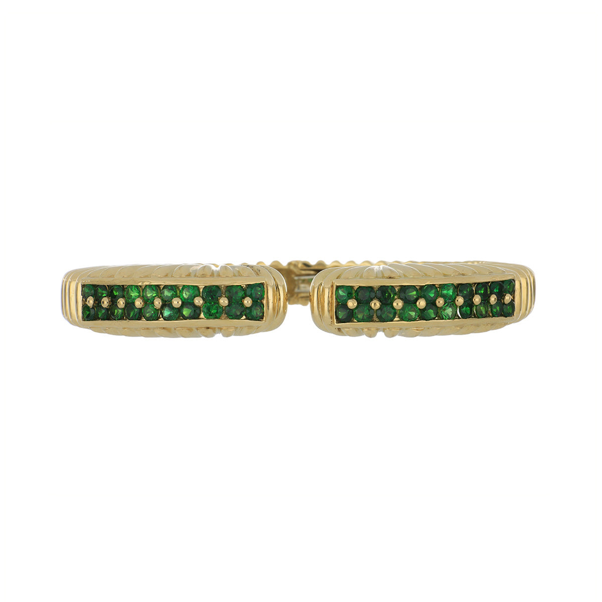 A vintage David Webb polished ridged cuff with round green tsavorite garnet in 18K yellow gold. Circa1980.