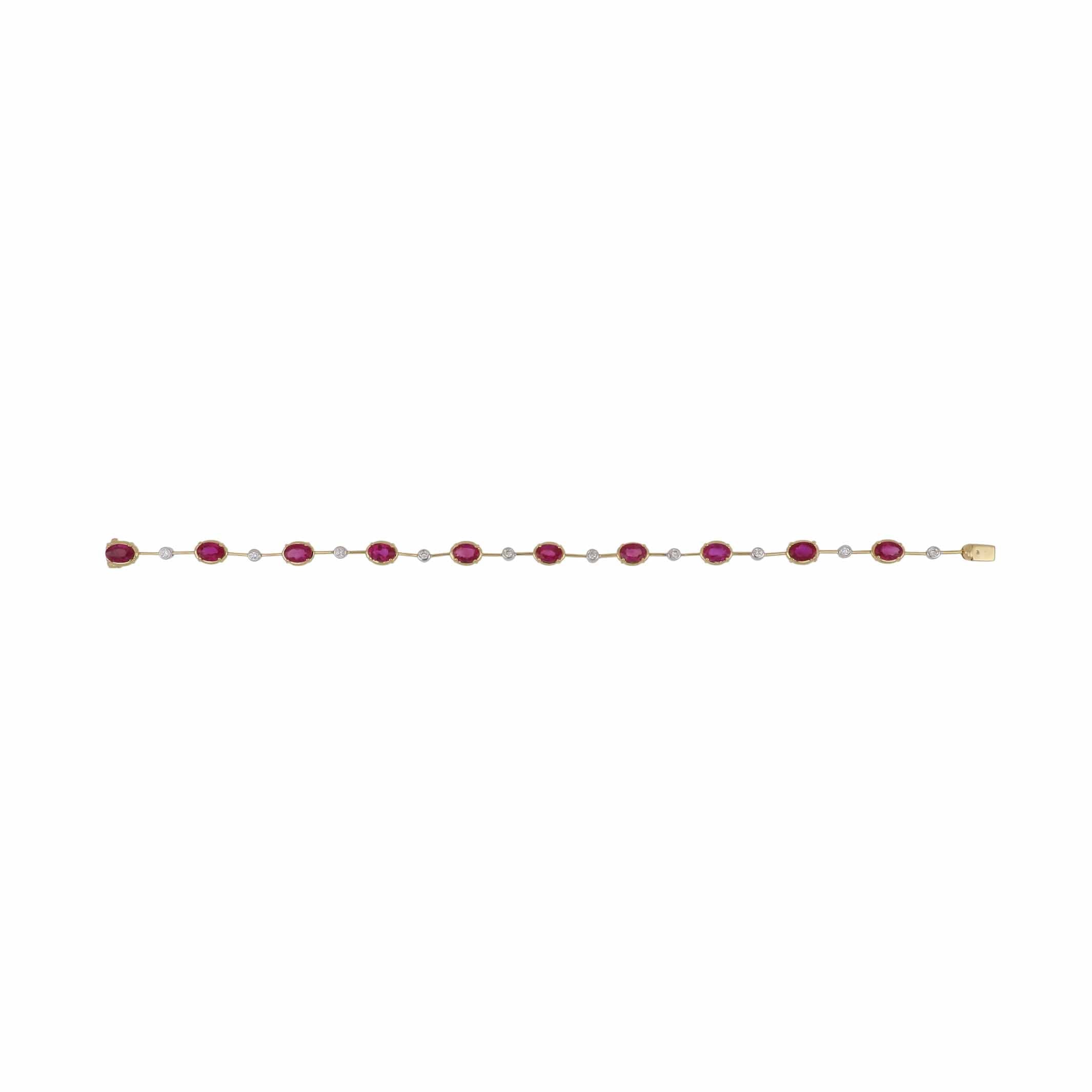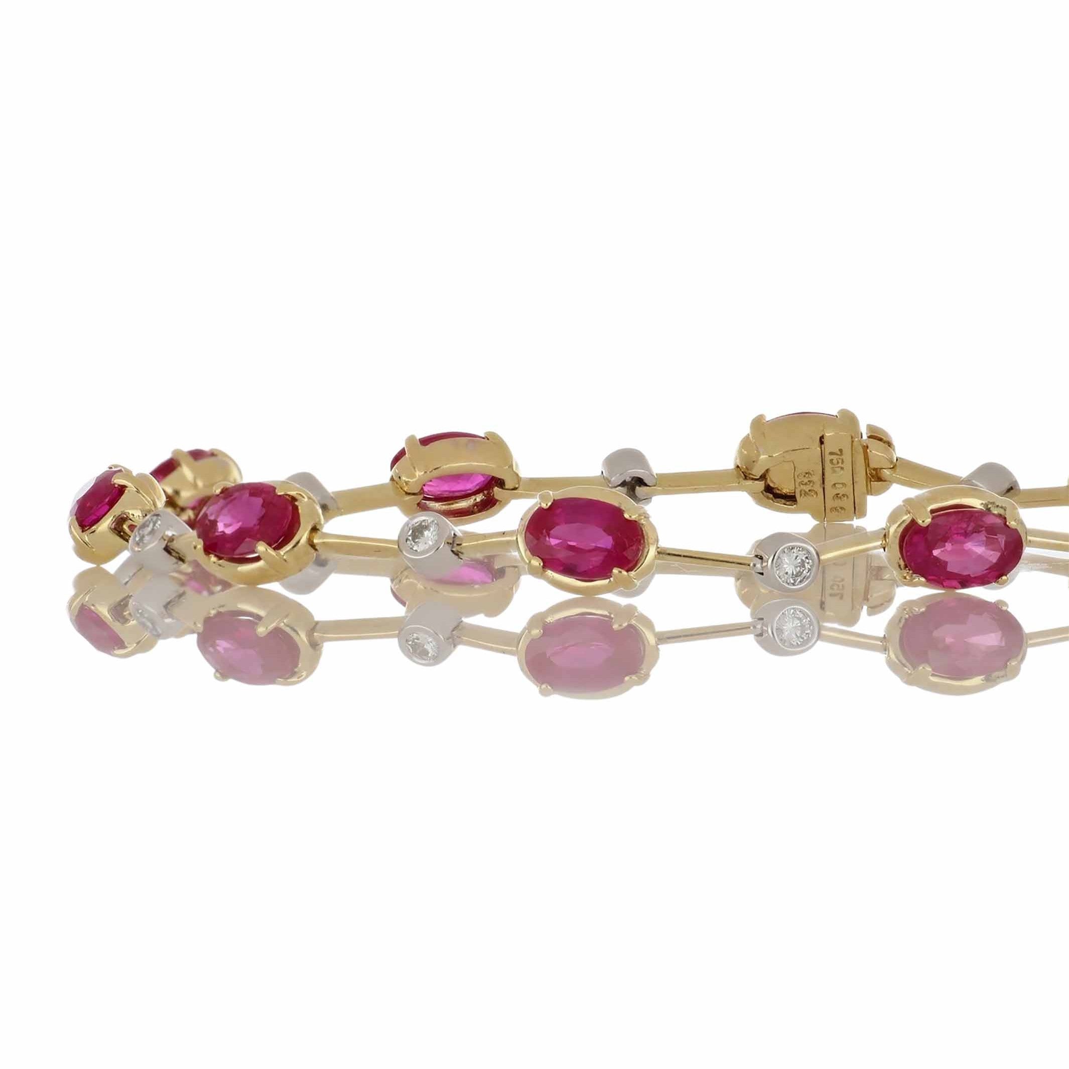 A vintage knife-egde, alternating oval-cut ruby and round brilliant-cut diamond bracelet set in 18K white and yellow gold. Circa 1990.