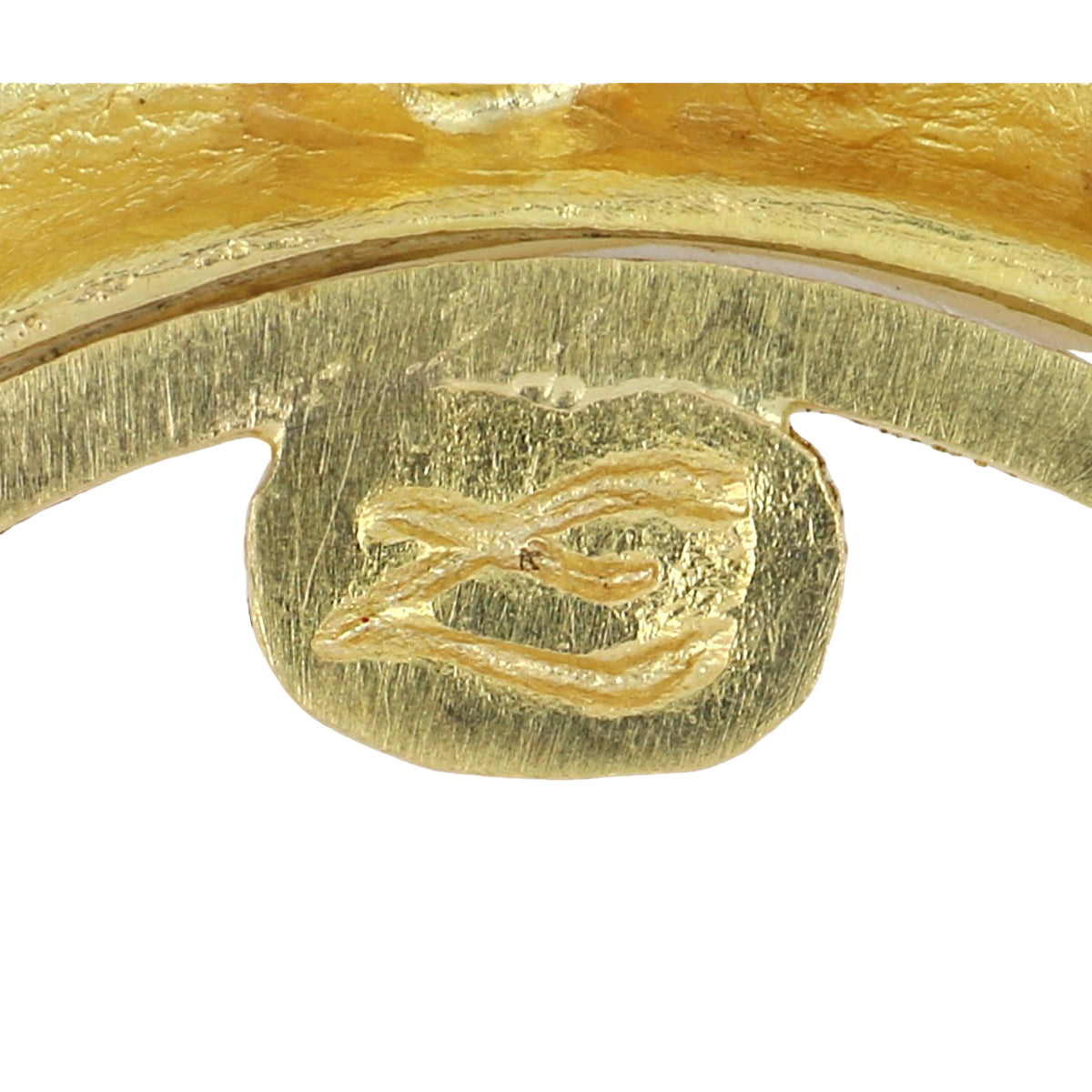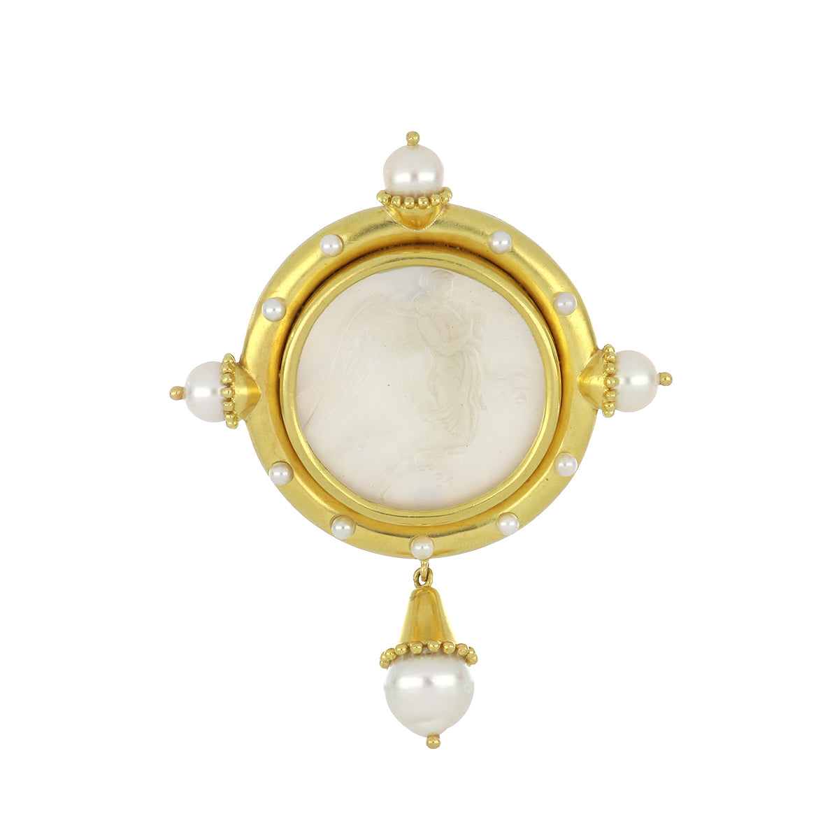 An estate Elizabeth Locke white Venetian glass angel intaglio pin with pearls, set in 18K yellow gold. Circa 2000.