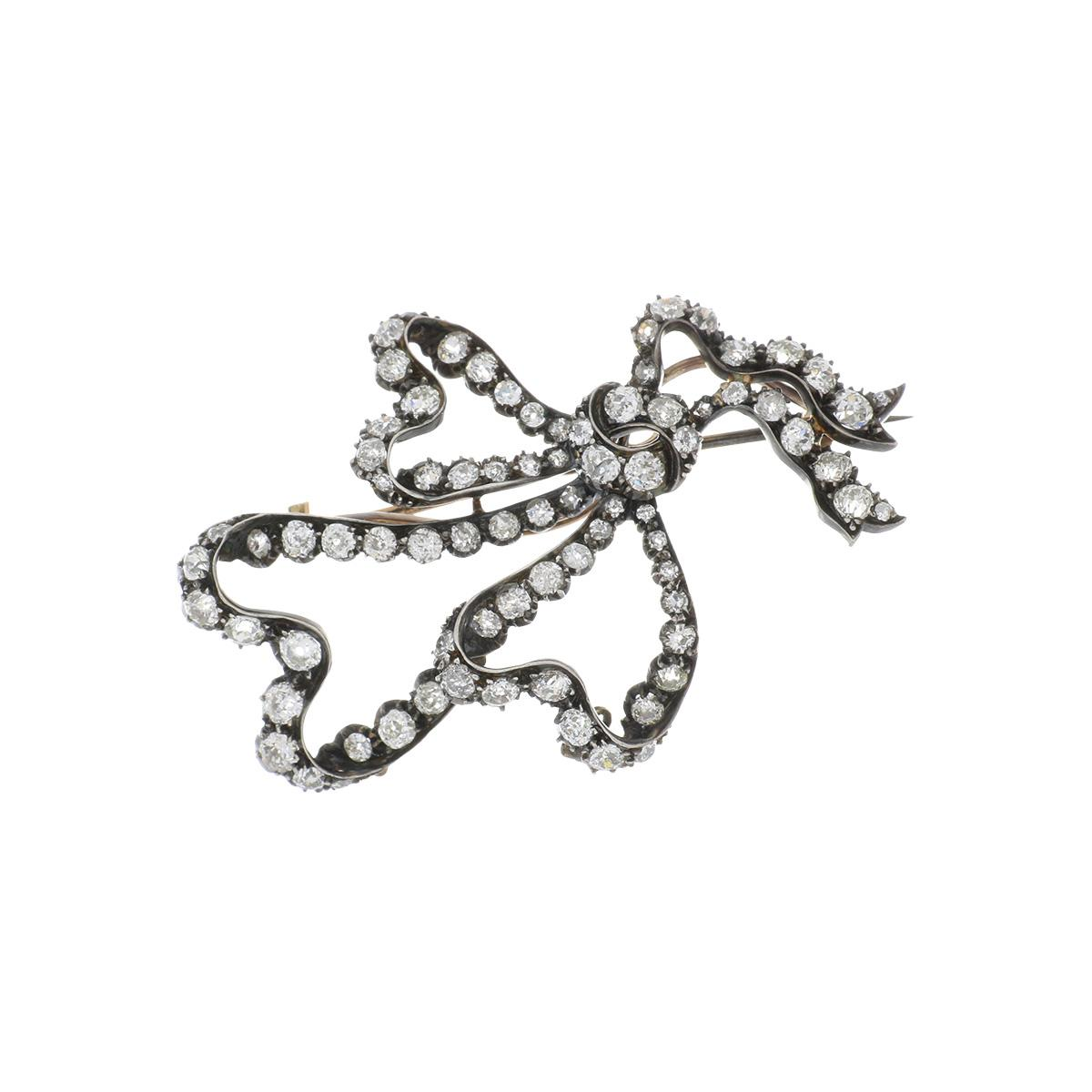 An antique classic Georgian 14 karat yellow gold topped with silver triple heart ribbon bow diamond brooch. Circa 1820.