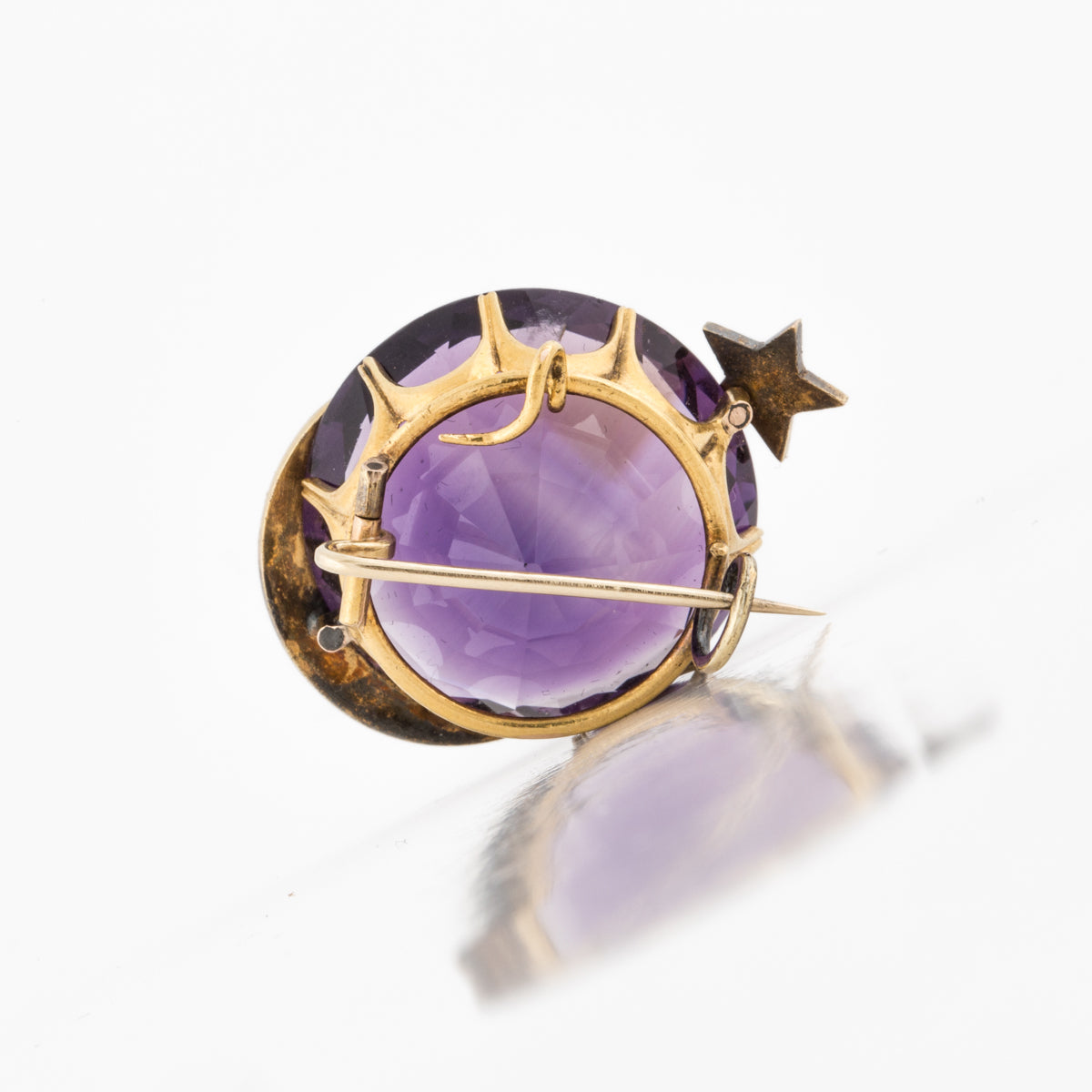 A Victorian round amethyst pin with split pearl moon and star charms, set in 15K yellow gold. Circa 1890.