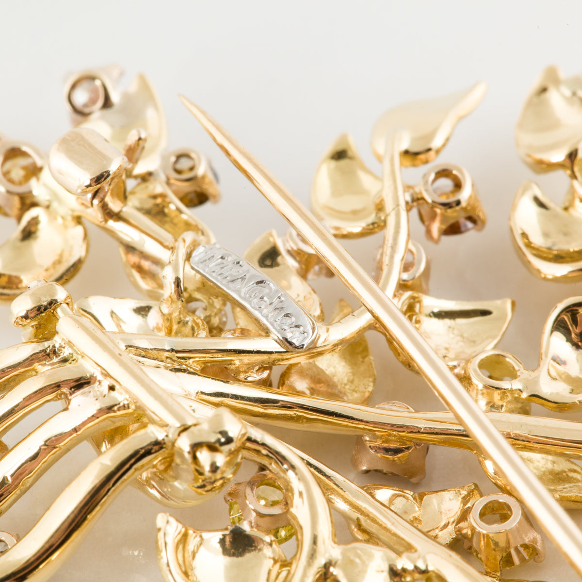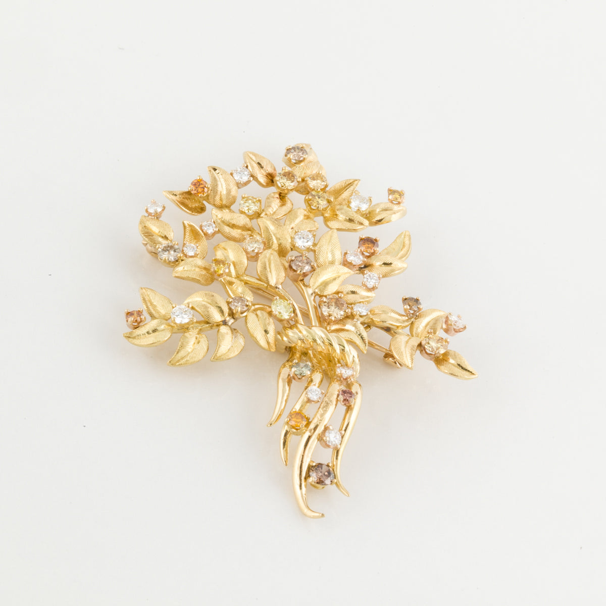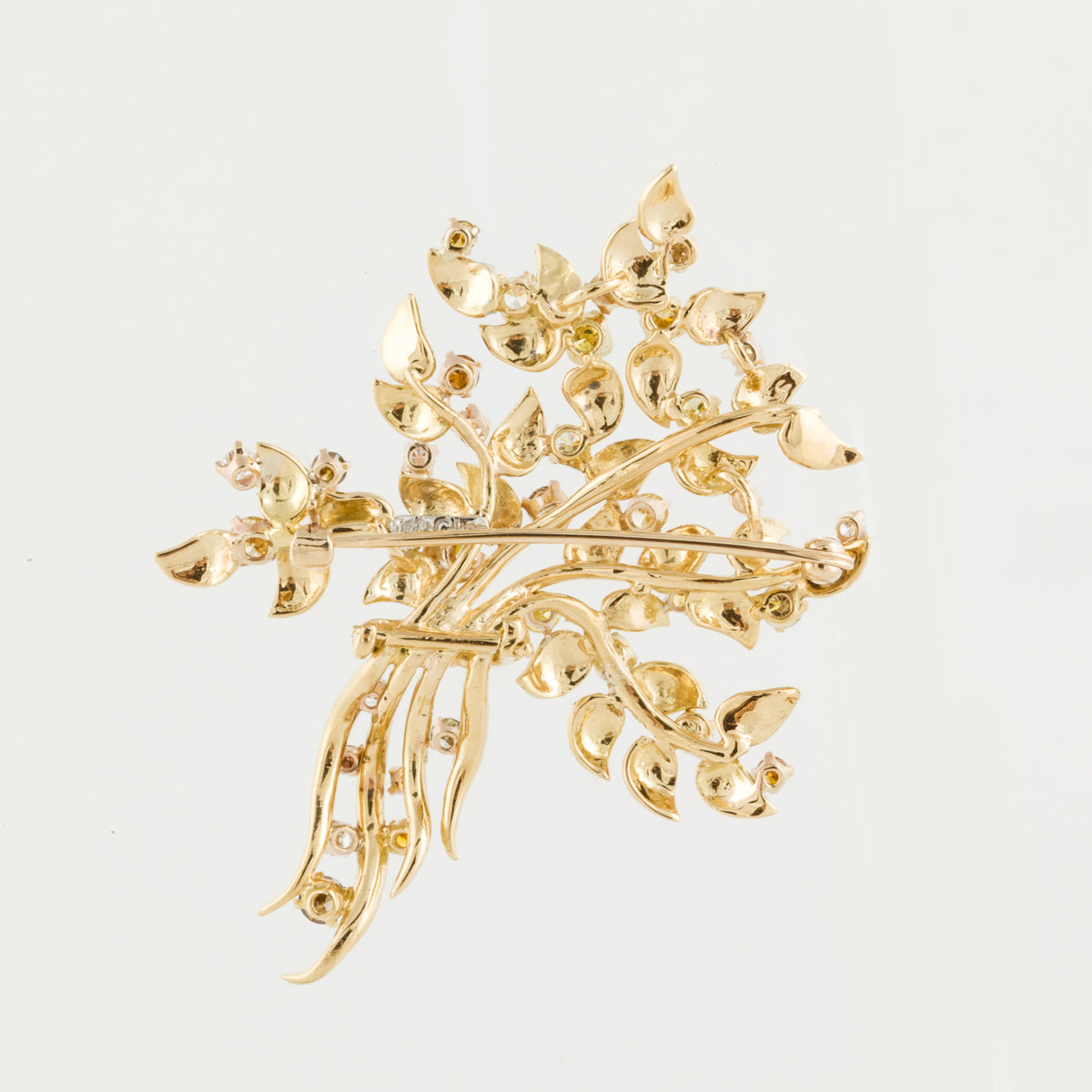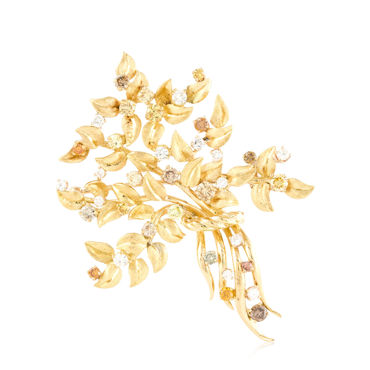 A vintage, Julius Cohen colored round brilliant-cut diamond floral brooch set in 18K yellow gold. Circa 1980.