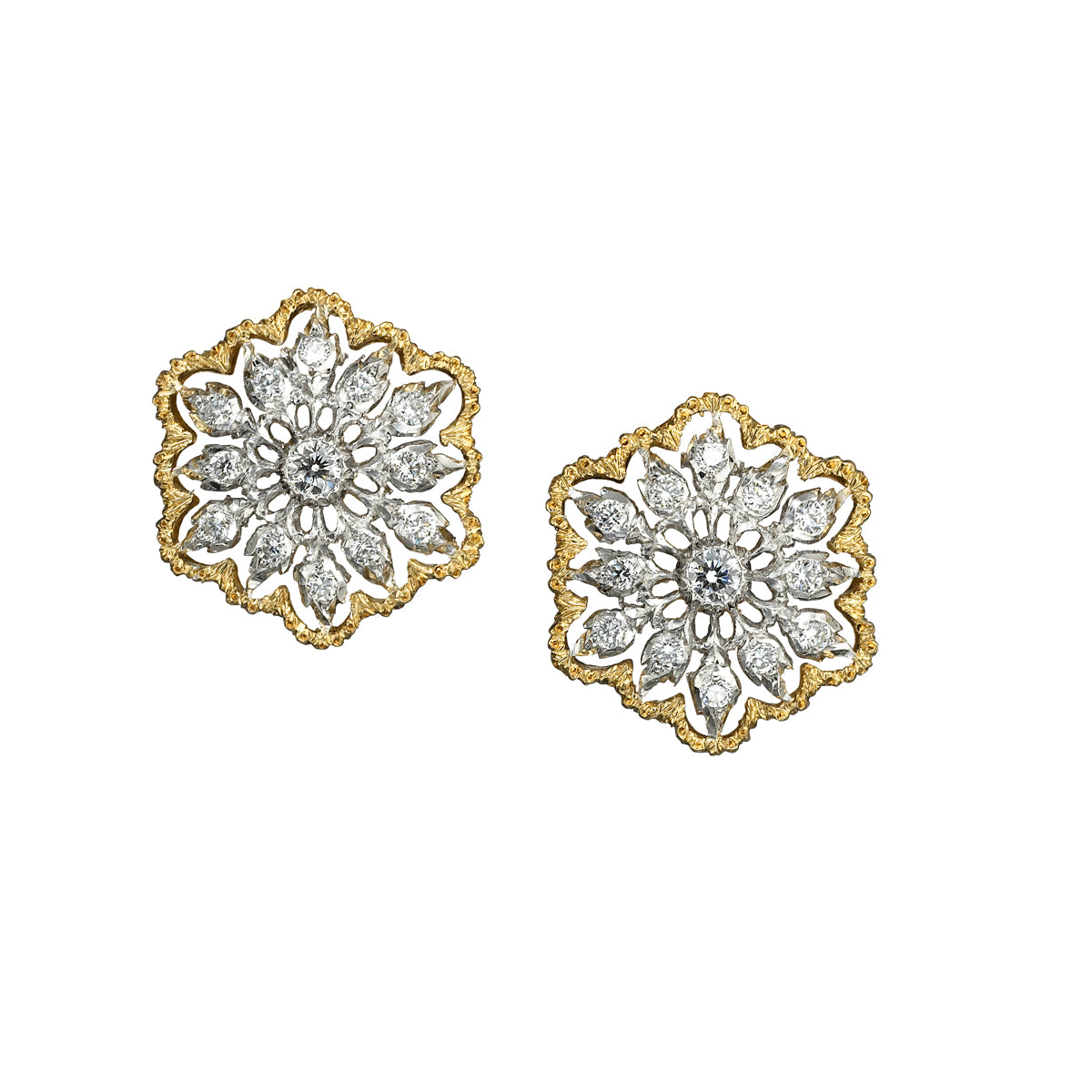 A pair of Buccellati Cassiopea openwork button earrings with diamonds, set in 18k white & yellow gold.Official Retailer Diamonds: 0.42 total carat weight F-G color / VS clarity
