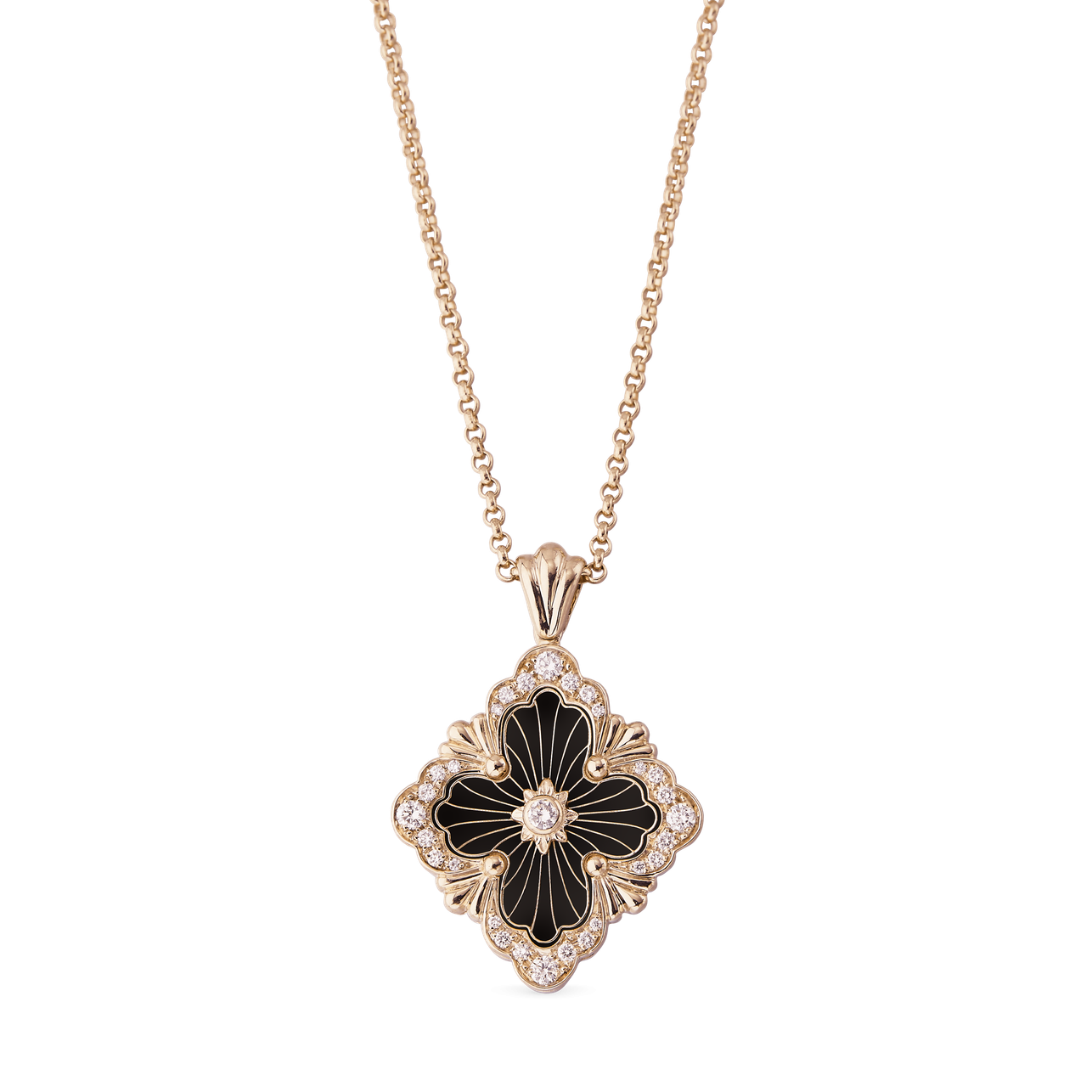 A Buccellati Opera Tulle pendant necklace composed of a rose gold logo element, onyx background topped with a radial tulle centering a rose gold rosette with diamond, set in 18K rose gold.