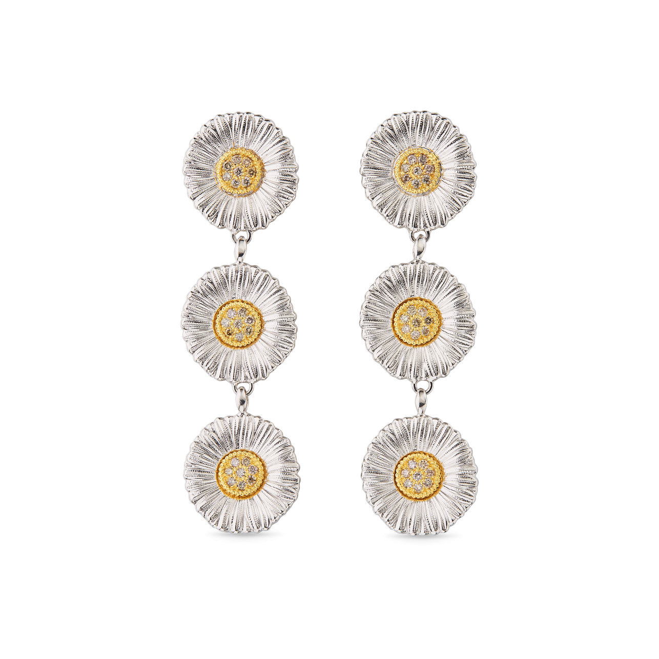 A pair of Buccellati daisy blossom triple pendant drop earrings with diamonds, set in sterling silver and yellow gold, from the "Blossoms Diamonds" collection.
