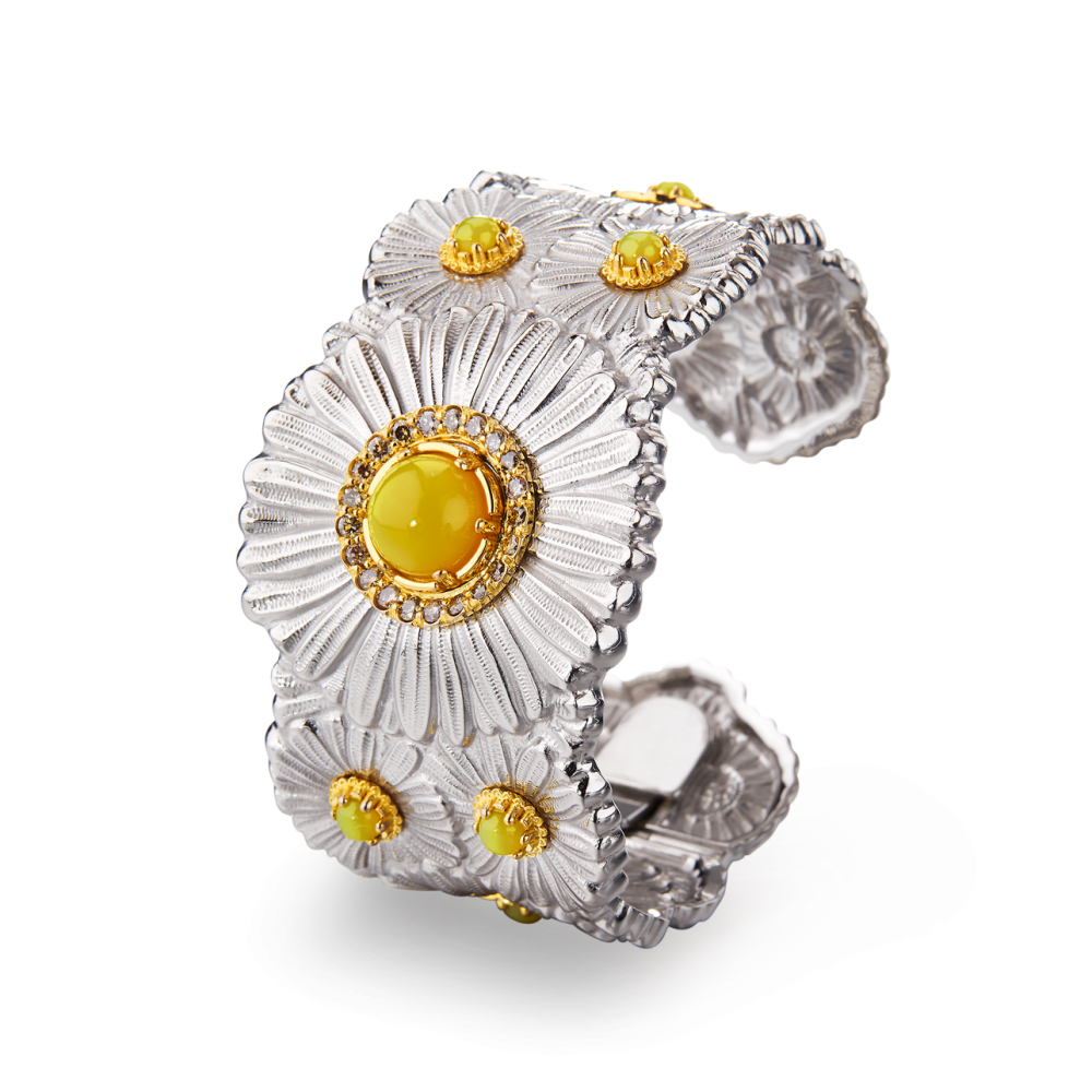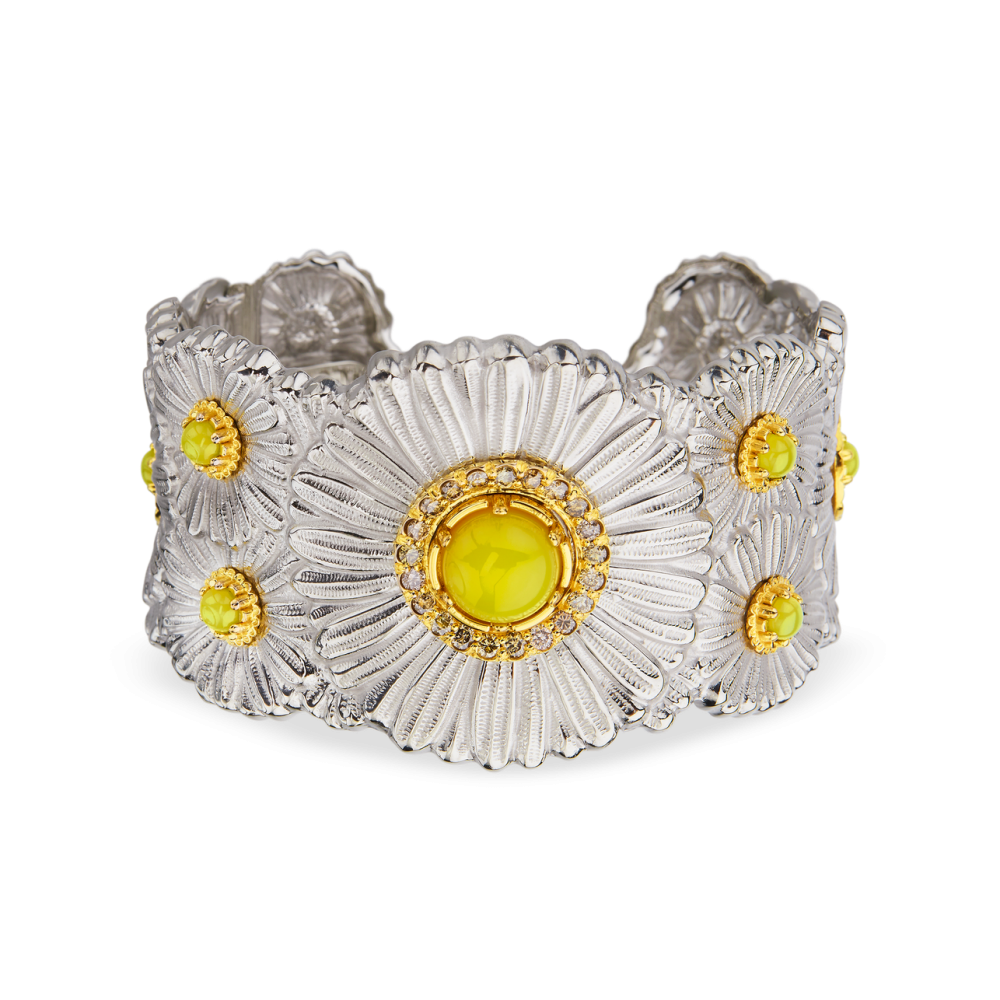 A Buccellati Daisy Blossom Collection cuff bracelet with round cabochon yellow agate and round fancy brown diamonds, set in sterling silver with yellow gold accents.
