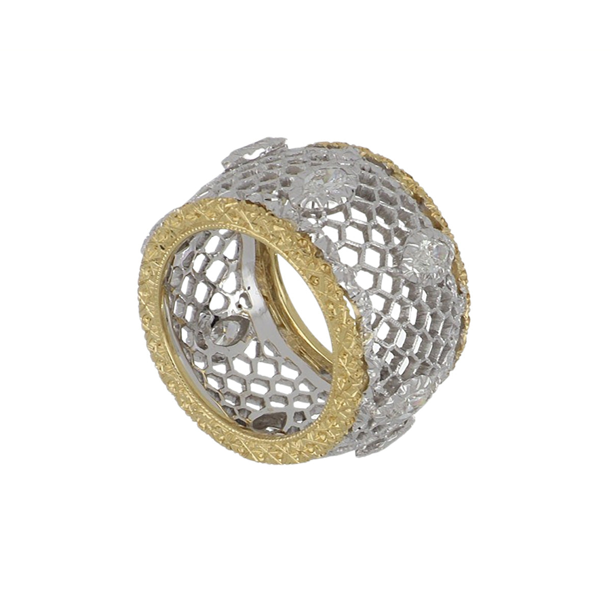 A mid-century Buccellati 18K white and yellow gold wide lace band with diamonds. Circa1950.