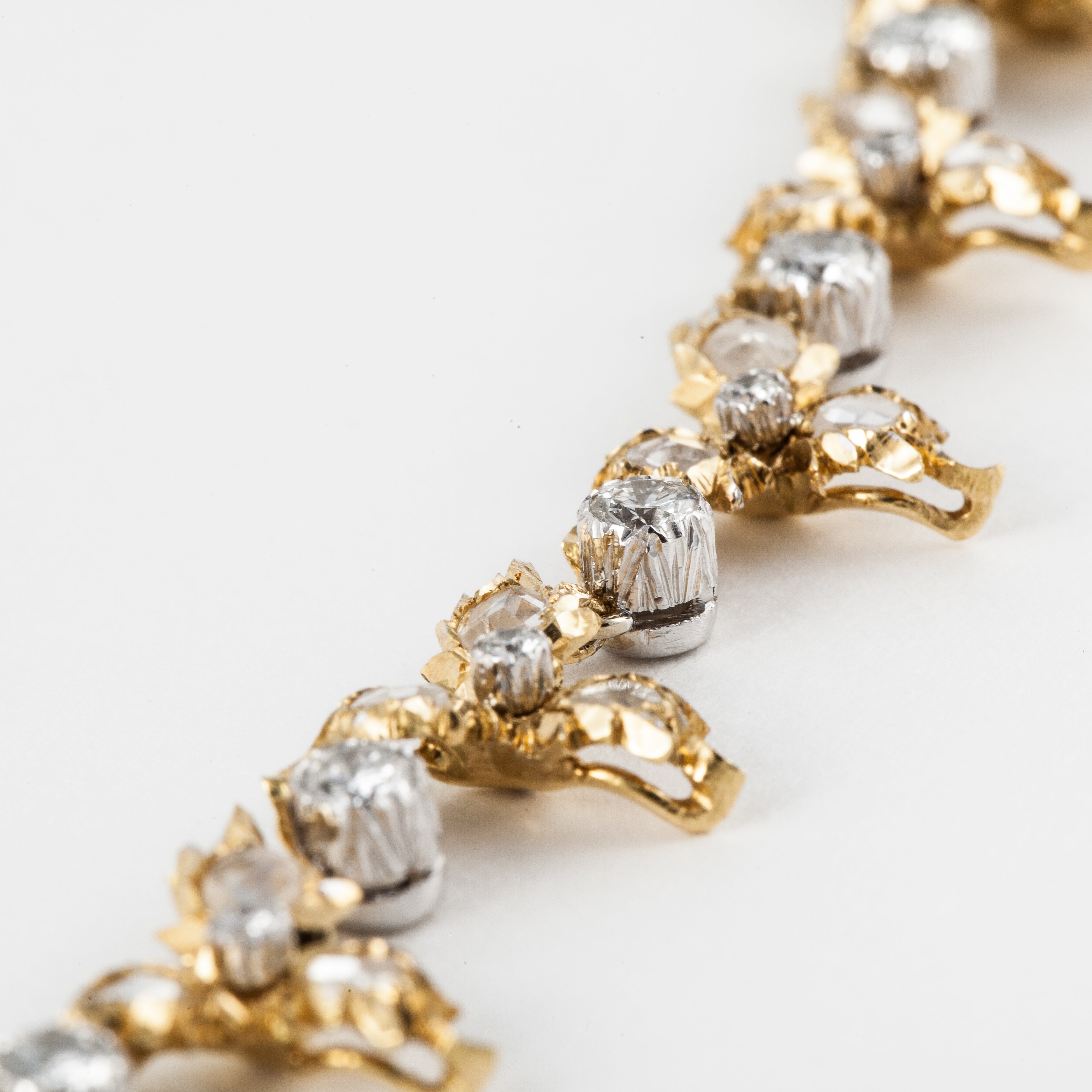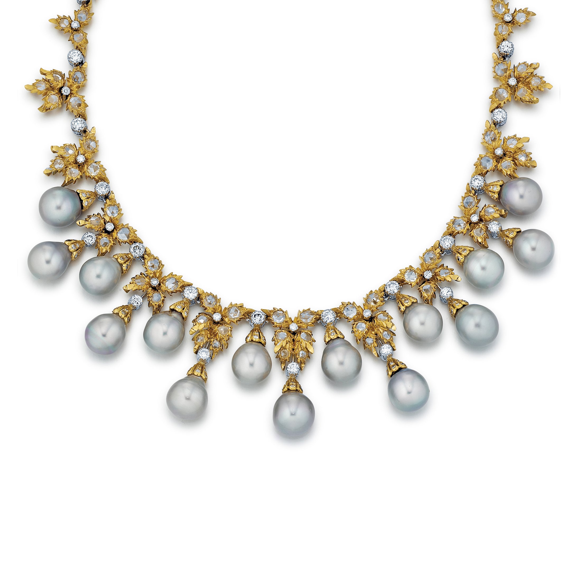 A vintage Buccellati fringe necklace with rose-cut and round brilliant-cut diamonds and cultured pearls in 18K yellow and white gold. Circa 1990s.
