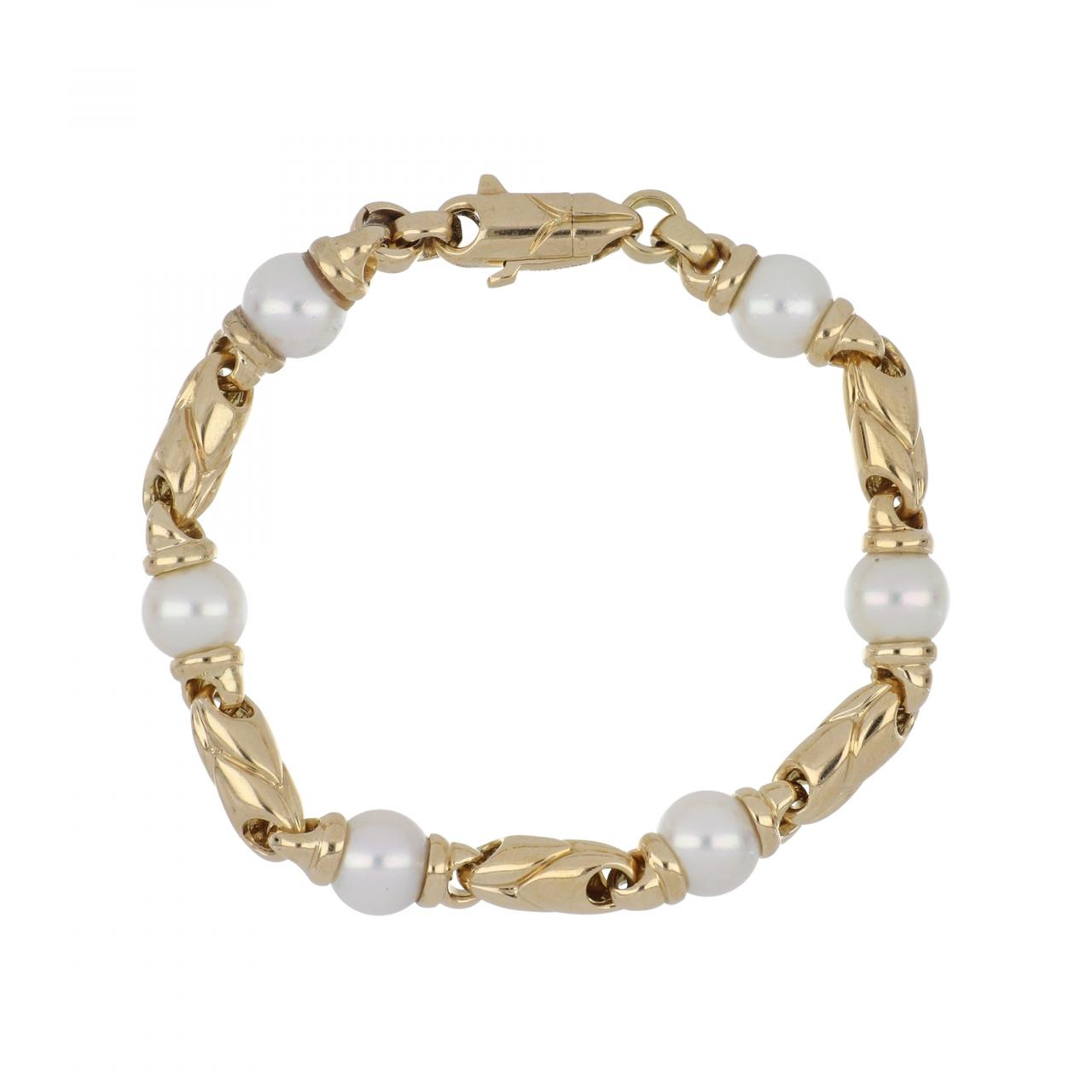 A vintage Bulgari 18K yellow gold Passo Doppio fancy link bracelet with cultured pearls. Circa 1990.