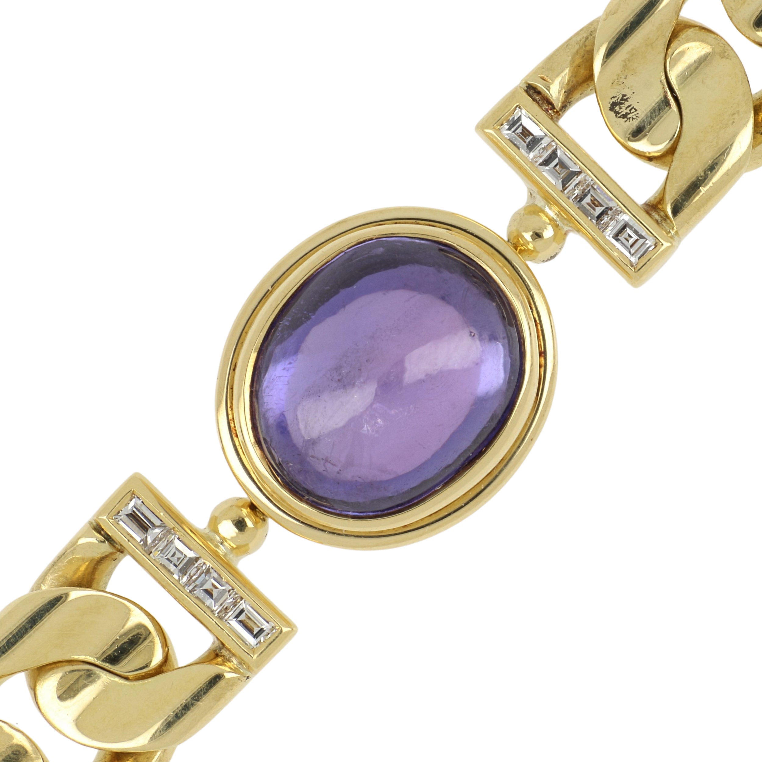 A vintage Bulgari curb link bracelet with an oval cabochon purple sapphire and straight baguette-cut diamonds, set in 18K yellow gold. Circa 1990.