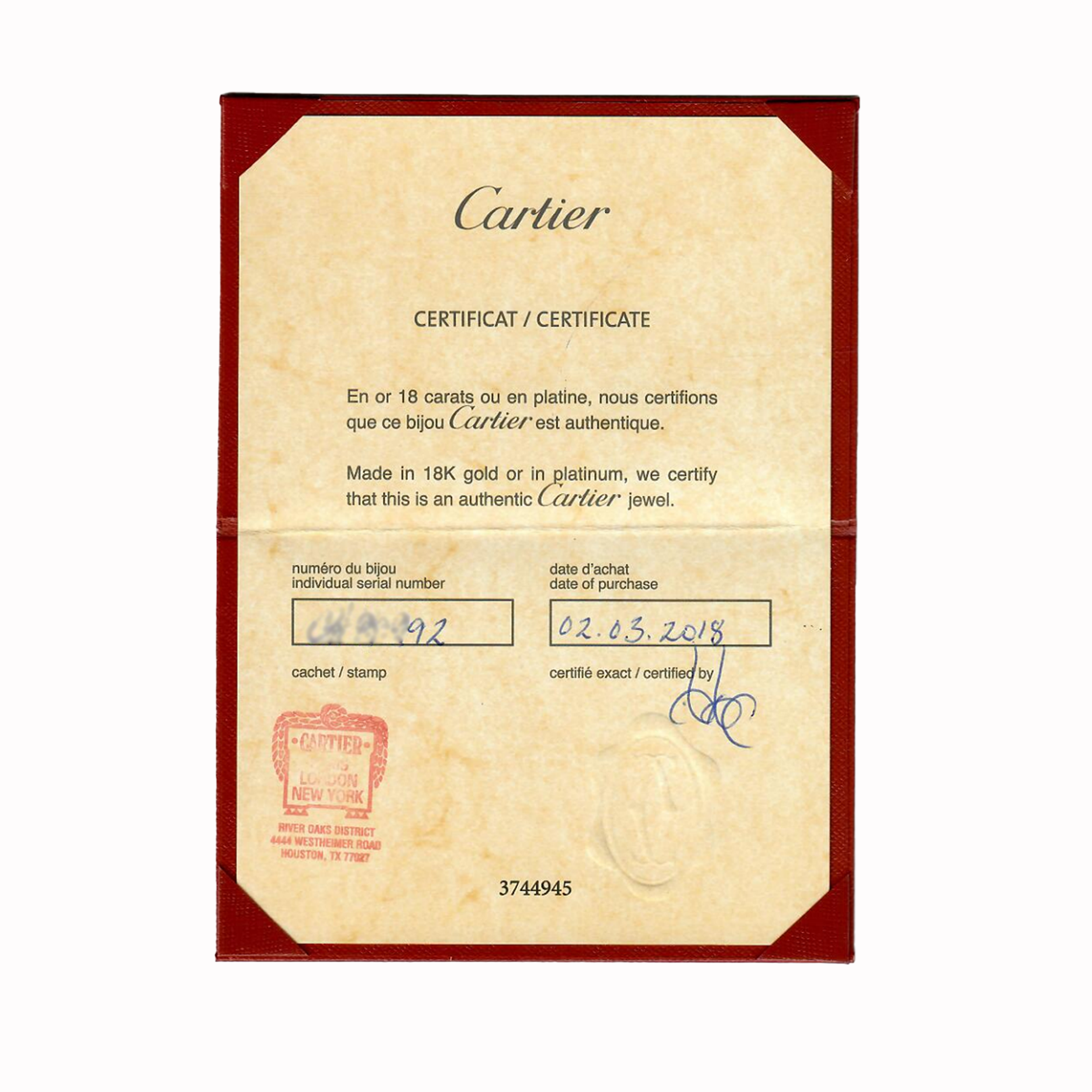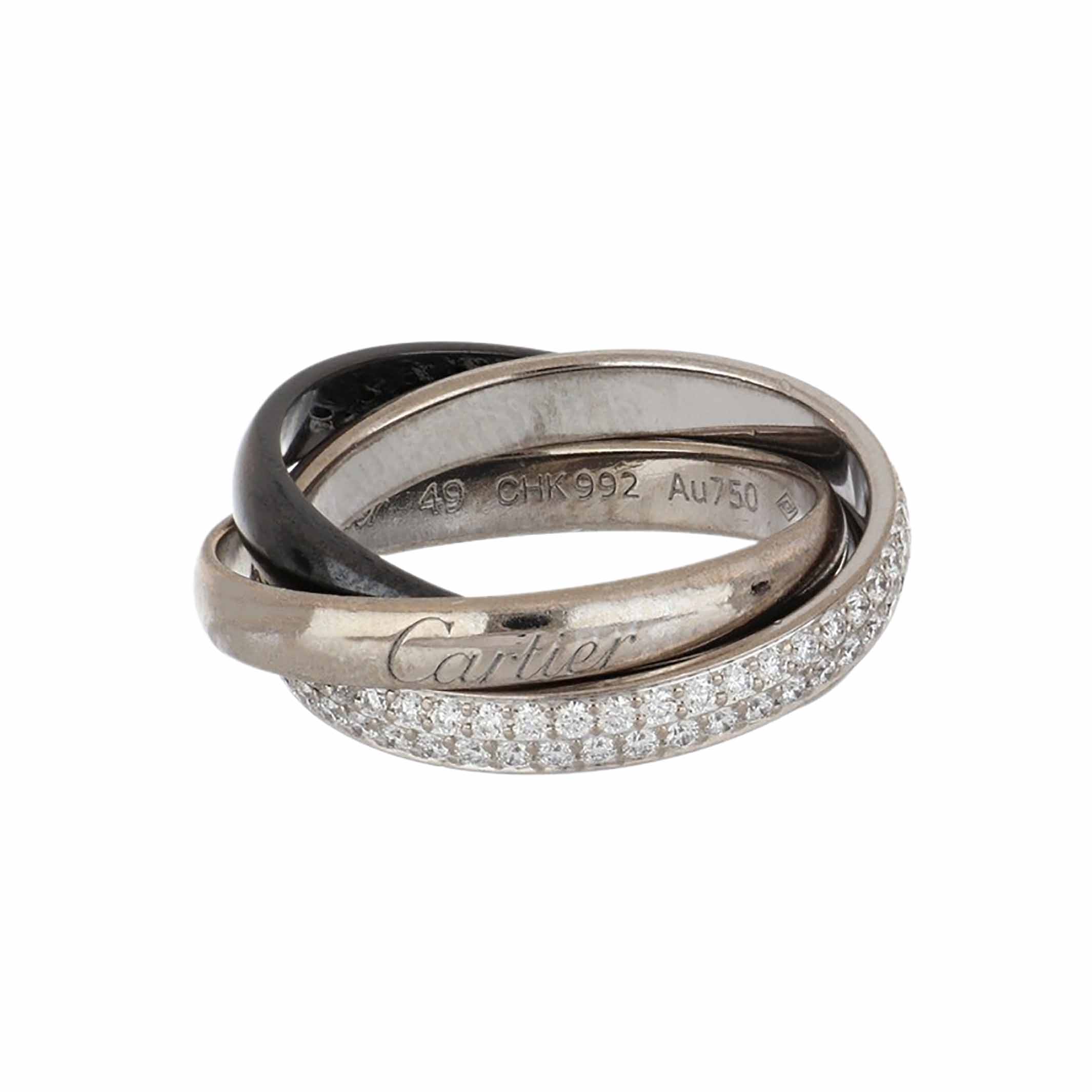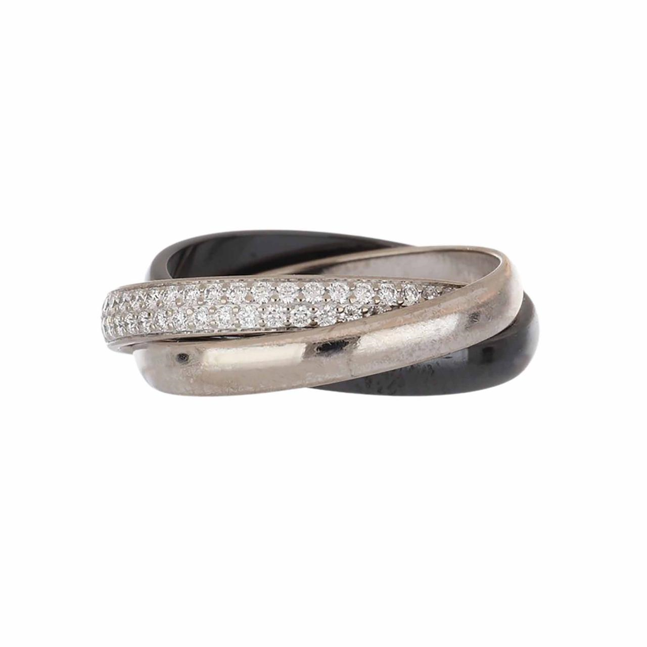 An estate Cartier 18K white gold and ceramic trinity ring with pave round brilliant-cut diamonds. Accompanied with original box, original receipt, and certificate of authenticity. Circa 2018.