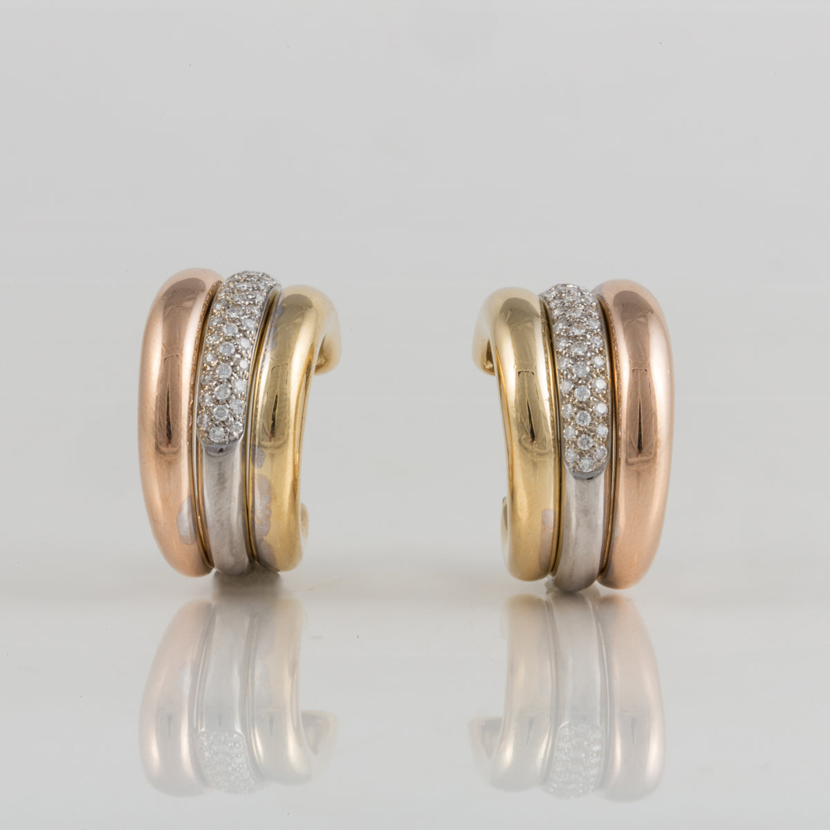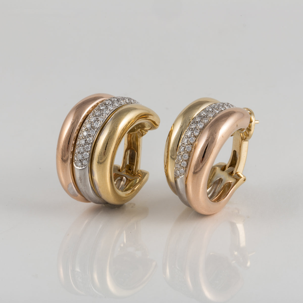 A pair of estate Cartier trinity hoop earrings with pave round brilliant-cut diamonds in 18K tri-color gold. Circa 1990