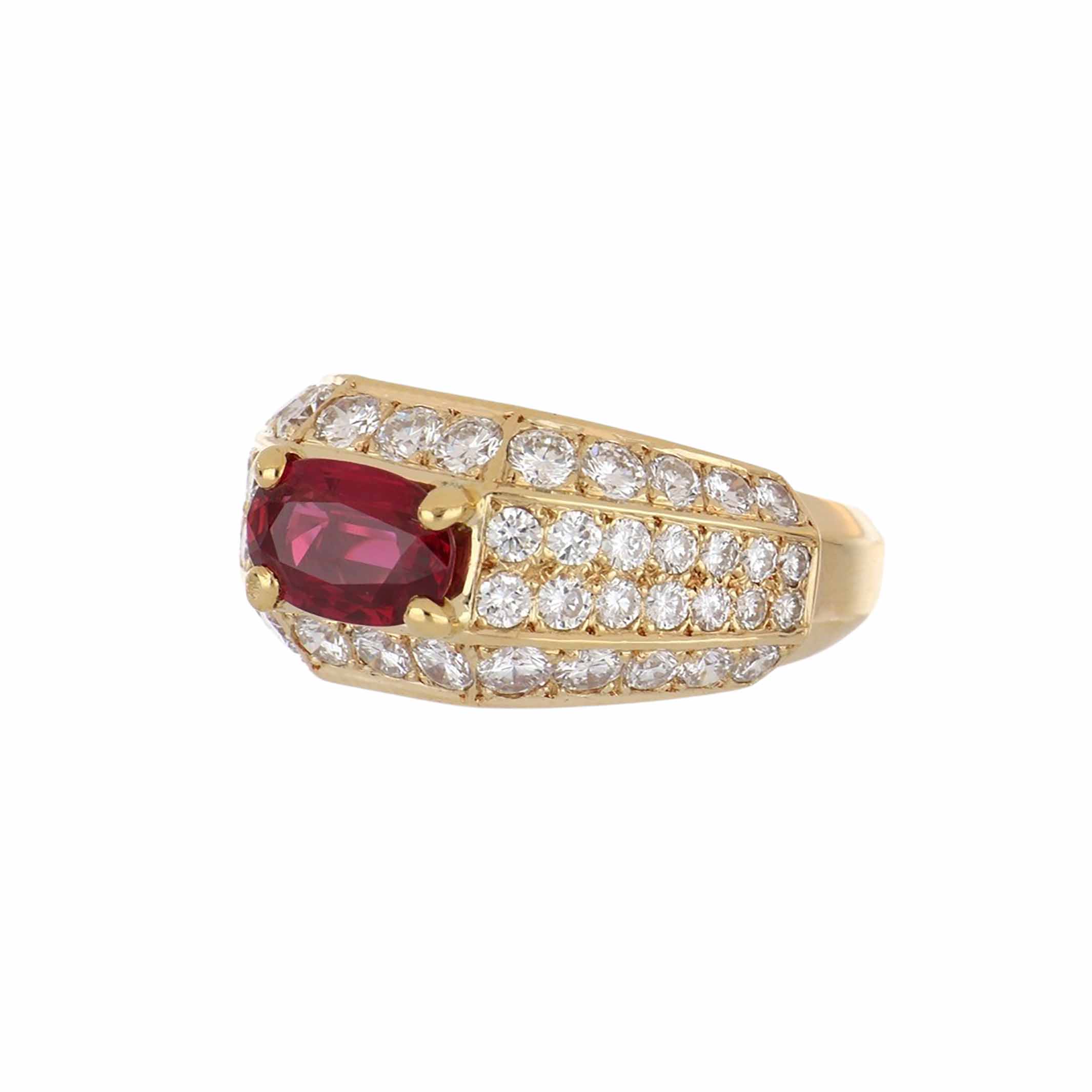 A vintage Cartier elongated cushion-cut ruby and pave round brilliant-cut diamond cocktail ring, set in 18K yellow gold. Circa 1990.