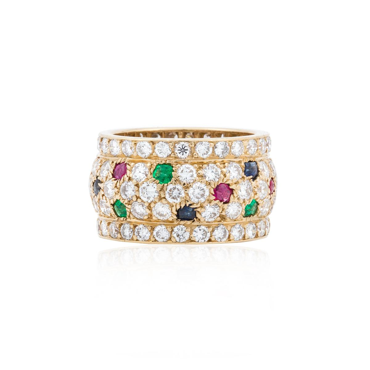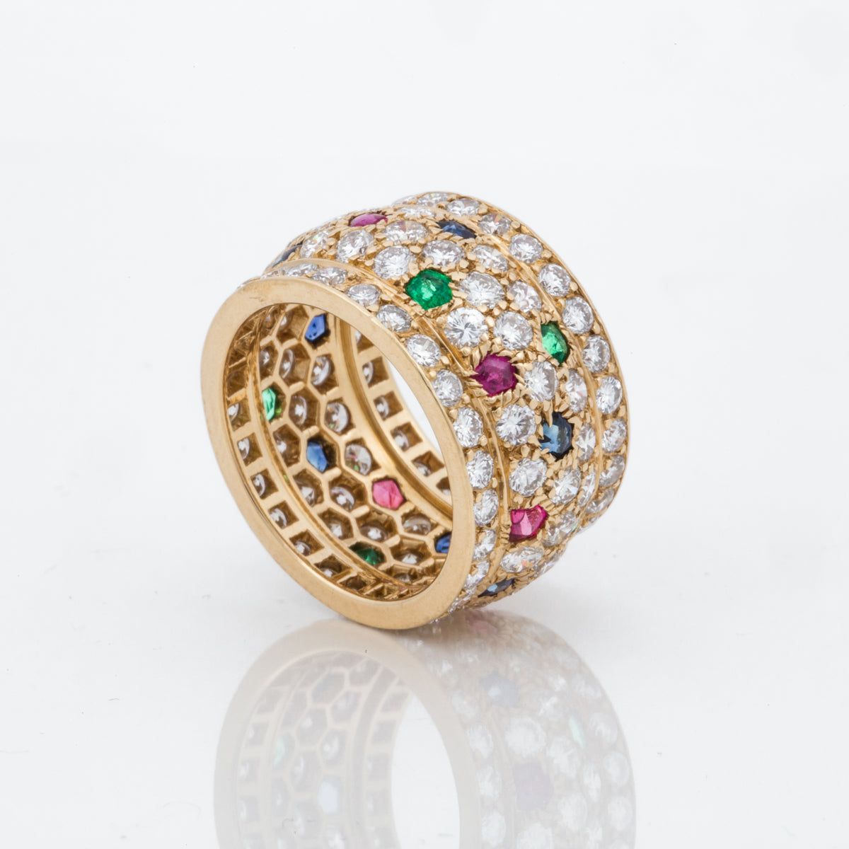 A vintage important Cartier 18K yellow gold Nigéria band with diamonds and buff-top cabochon emeralds, sapphires & rubies. Circa 1990.