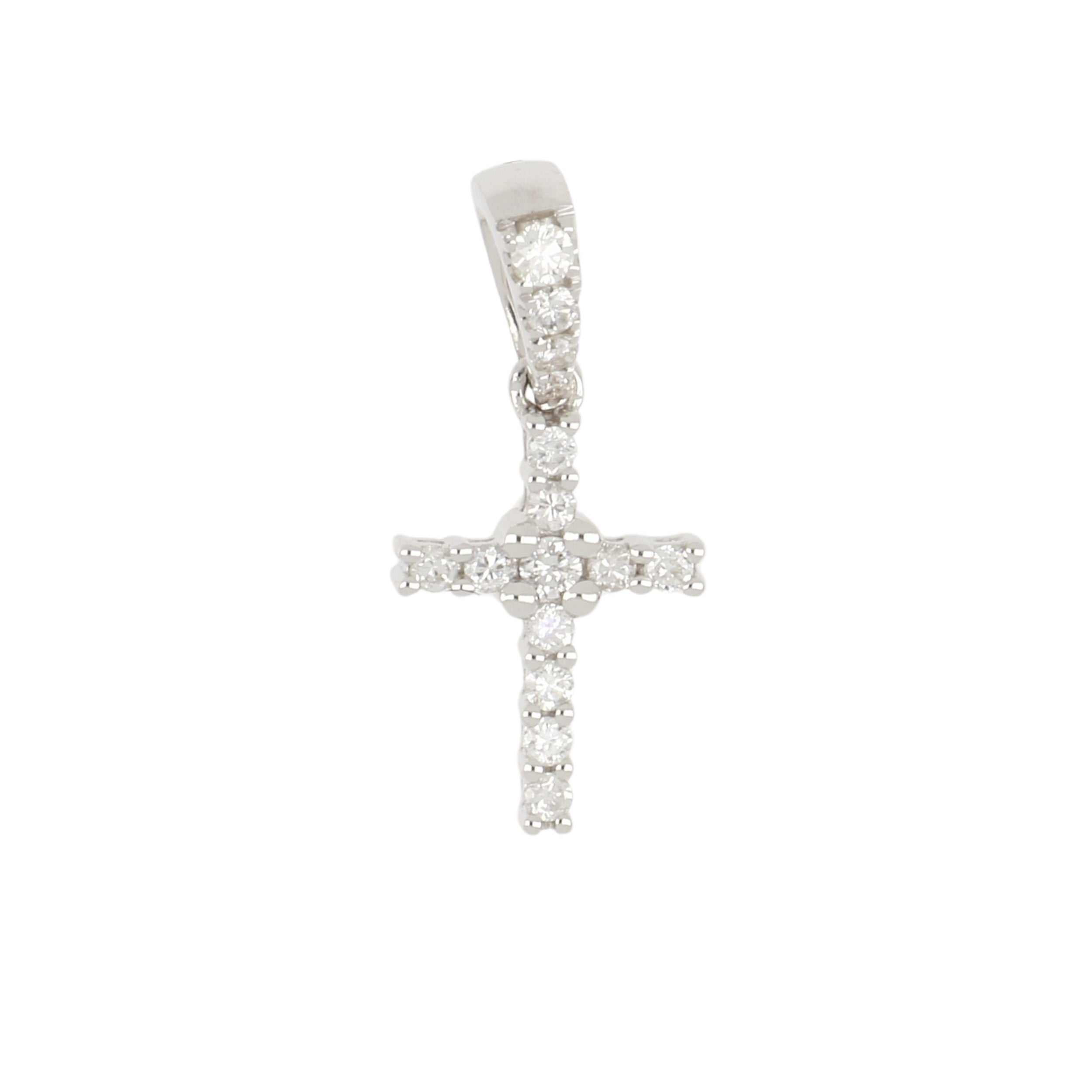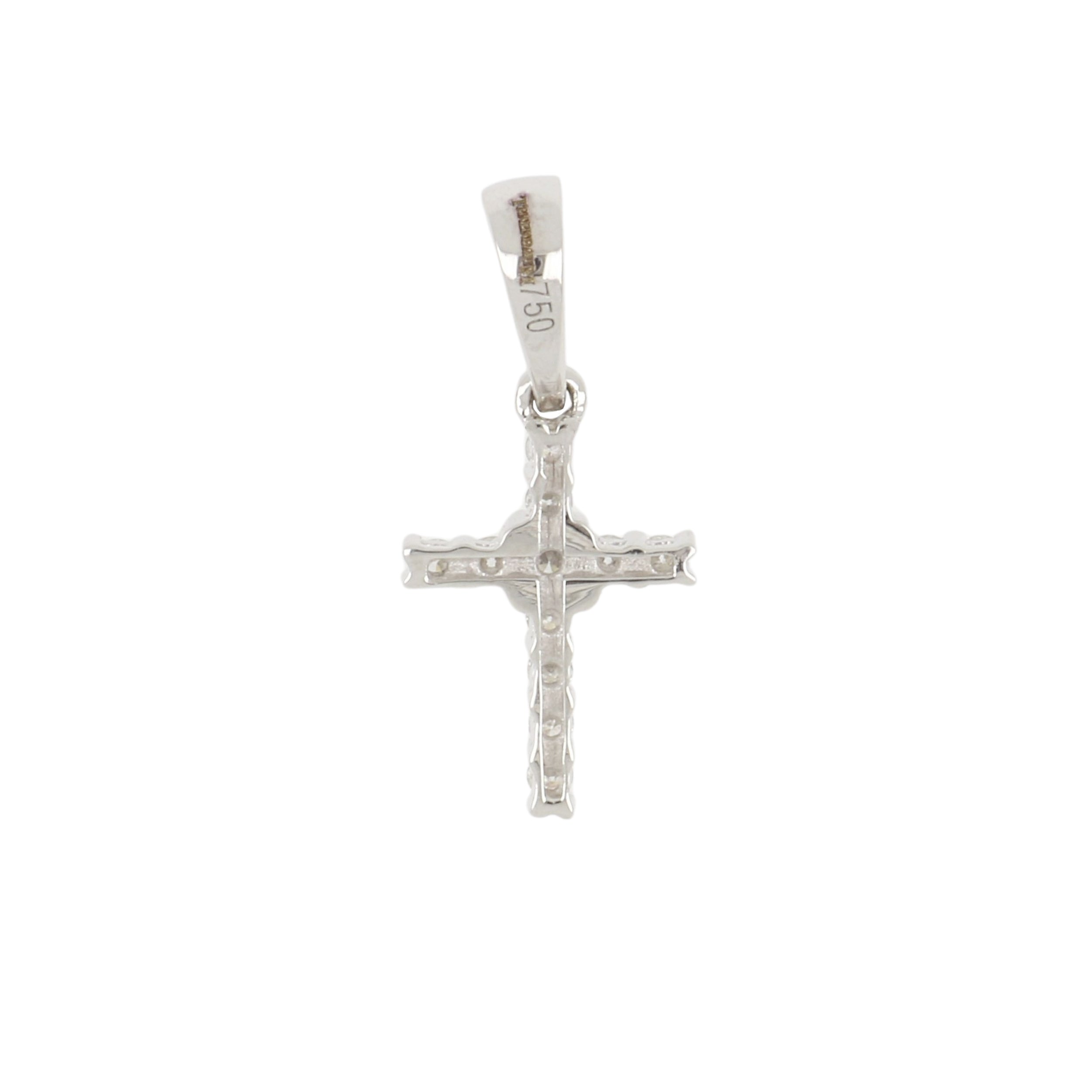 A round diamond cross with a diamond bail, set in 18K white gold.