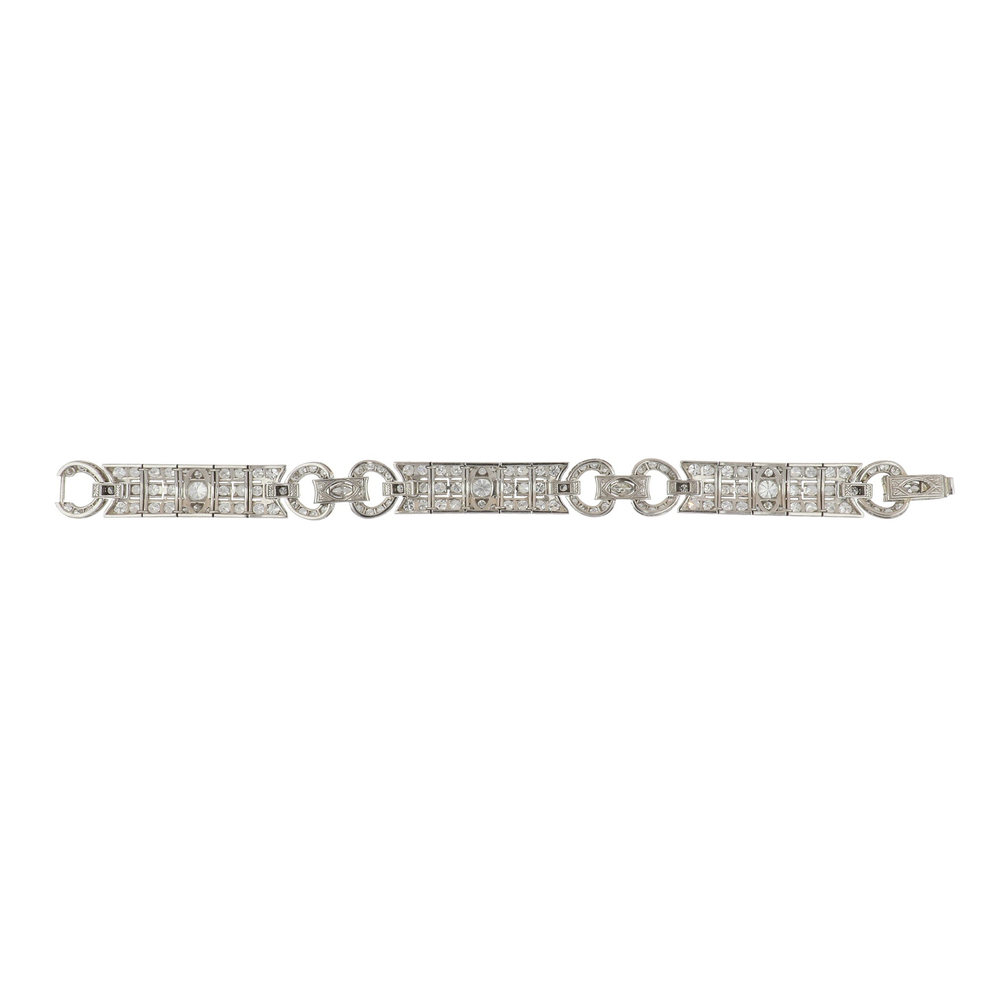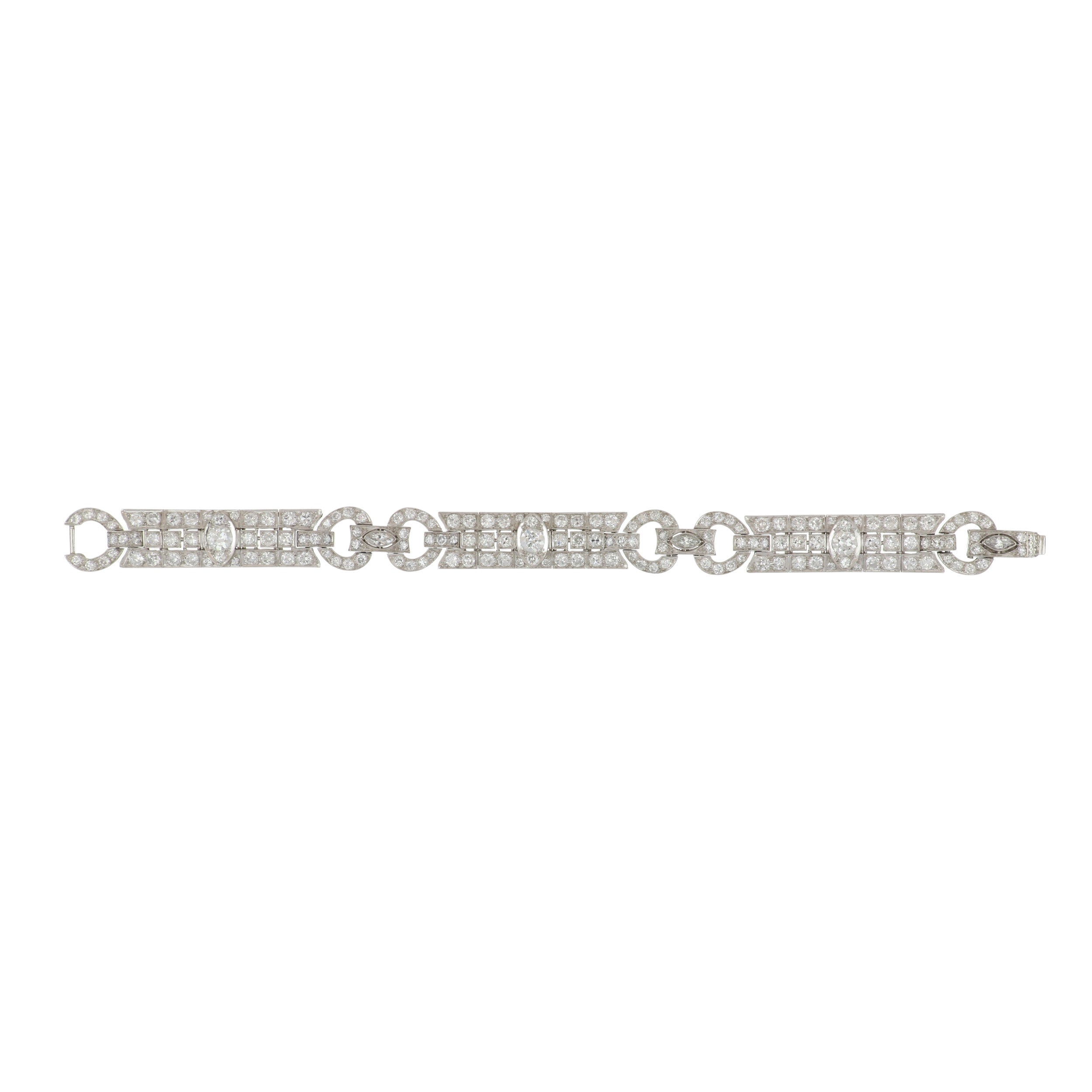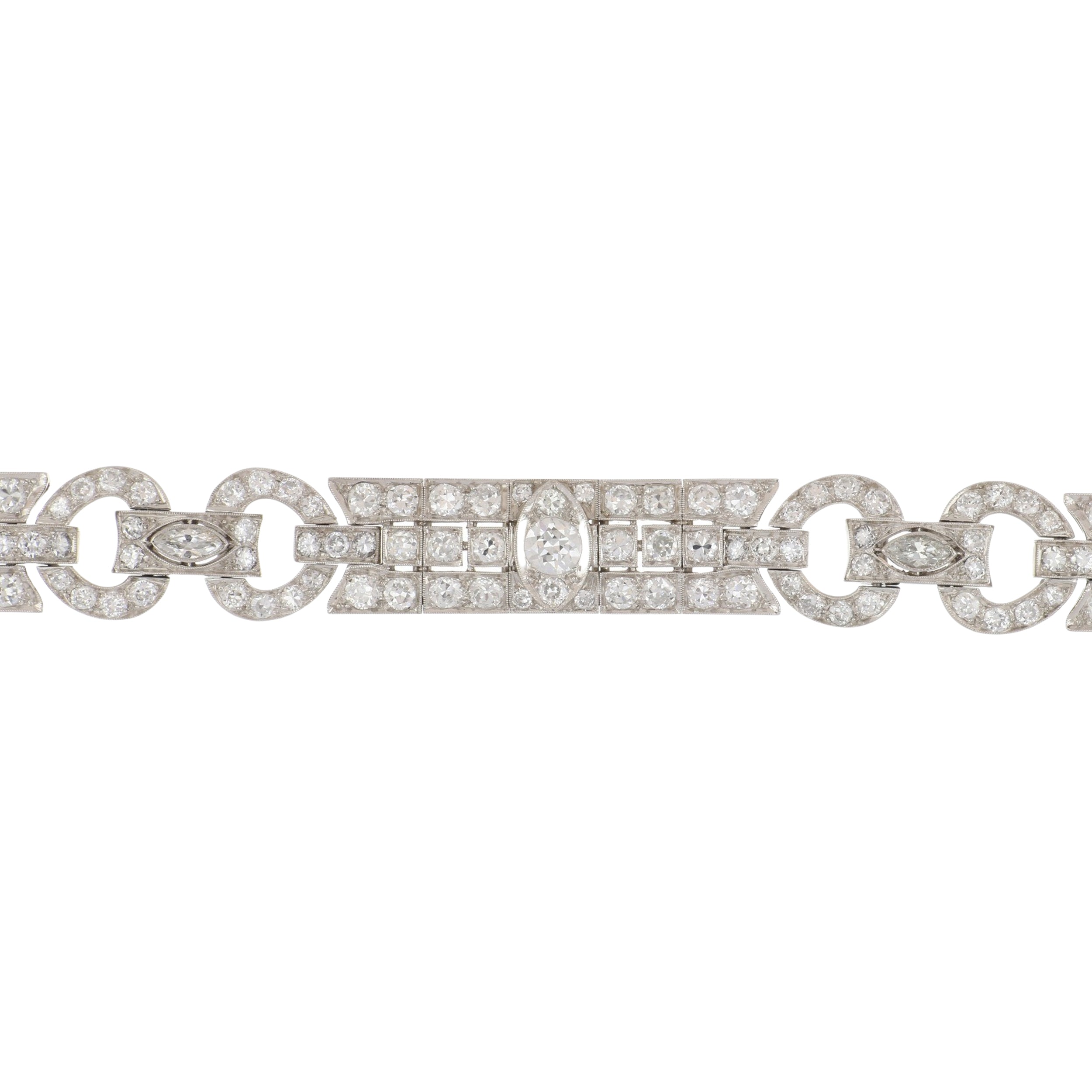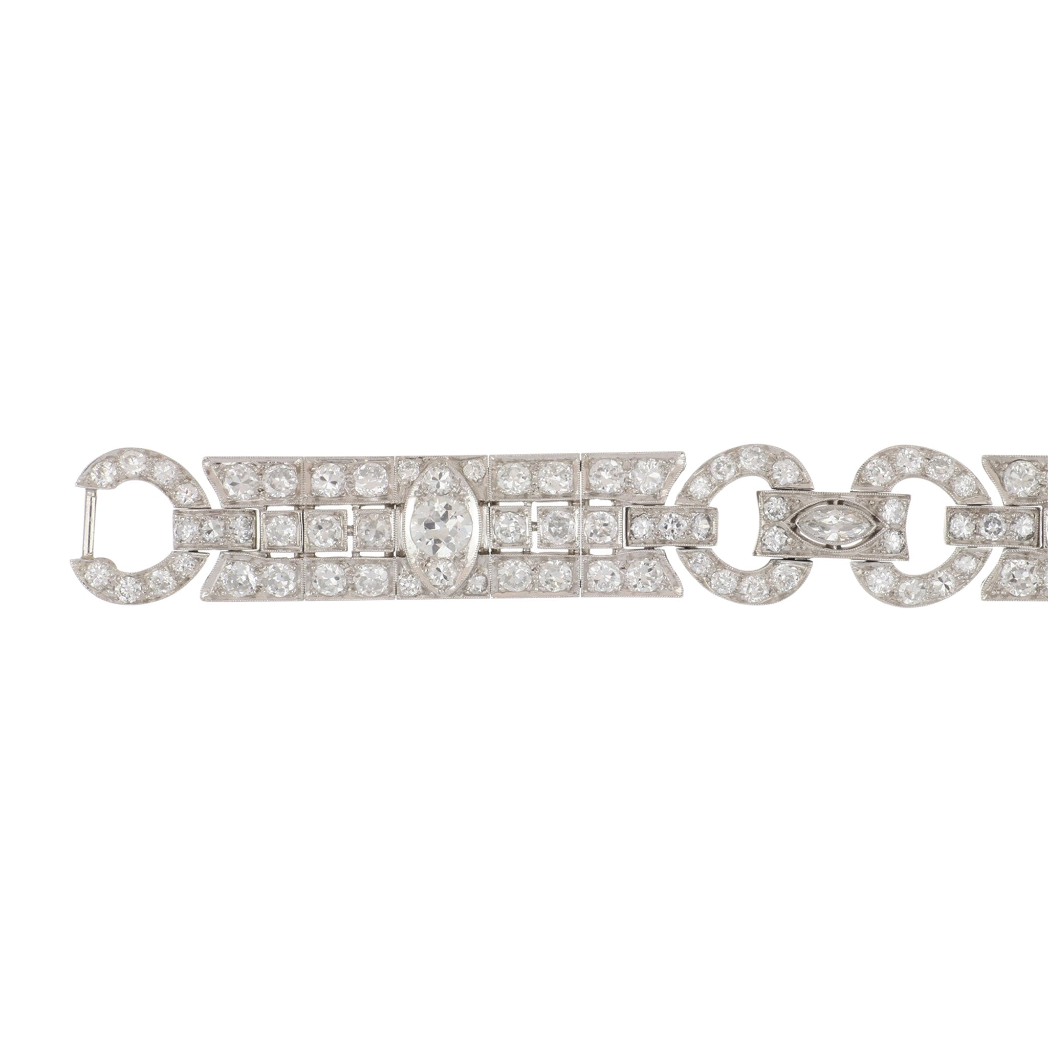 An Art Deco plaque bracelet set with Old European-cut and marquise-cut diamonds, set in platinum. Circa 1920.