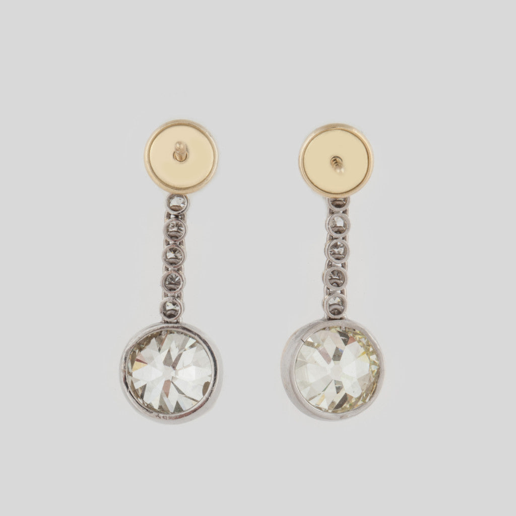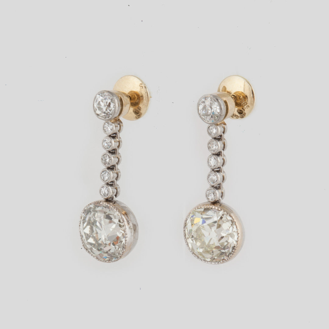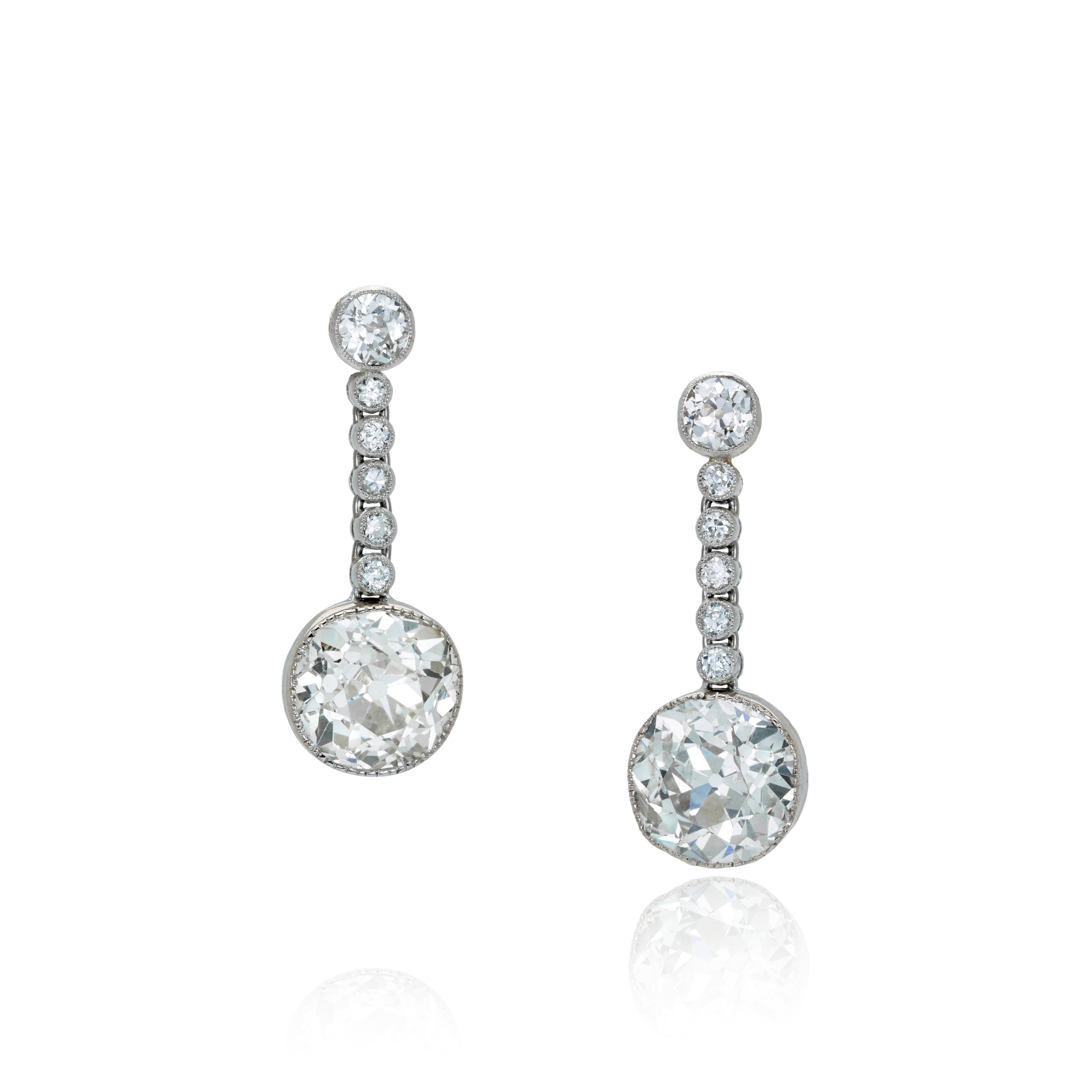A pair of Edwardian Old European-cut diamond and round brilliant-cut diamond drop earrings, set in platinum and 14K yellow gold. Circa 1910