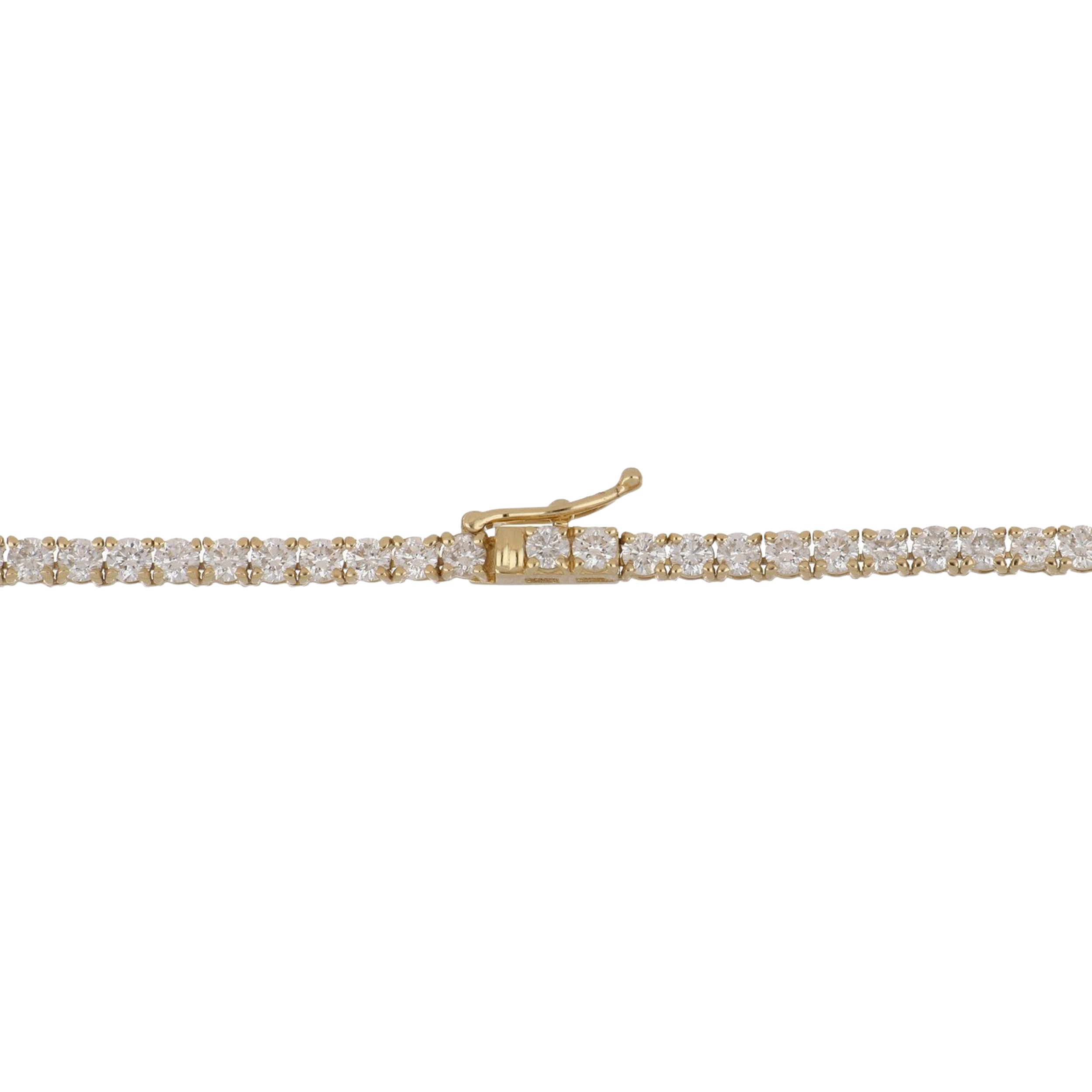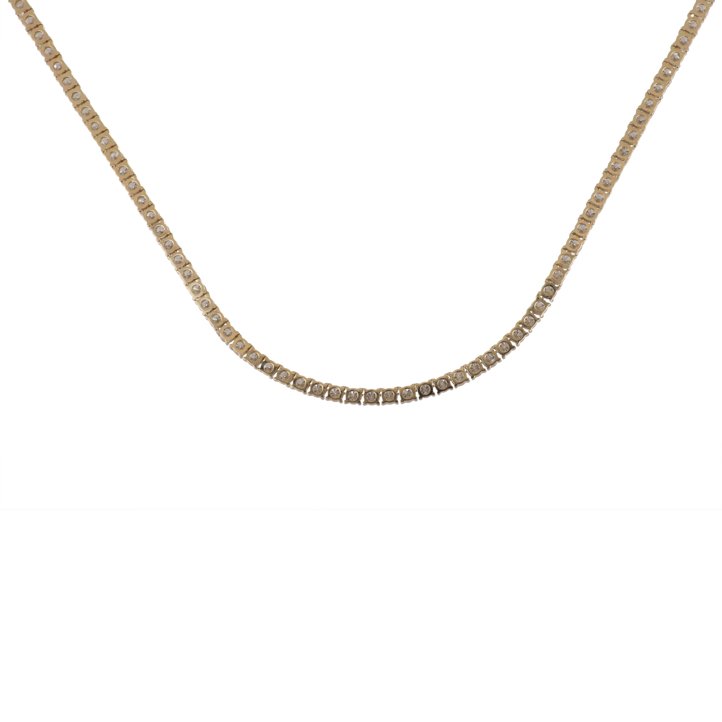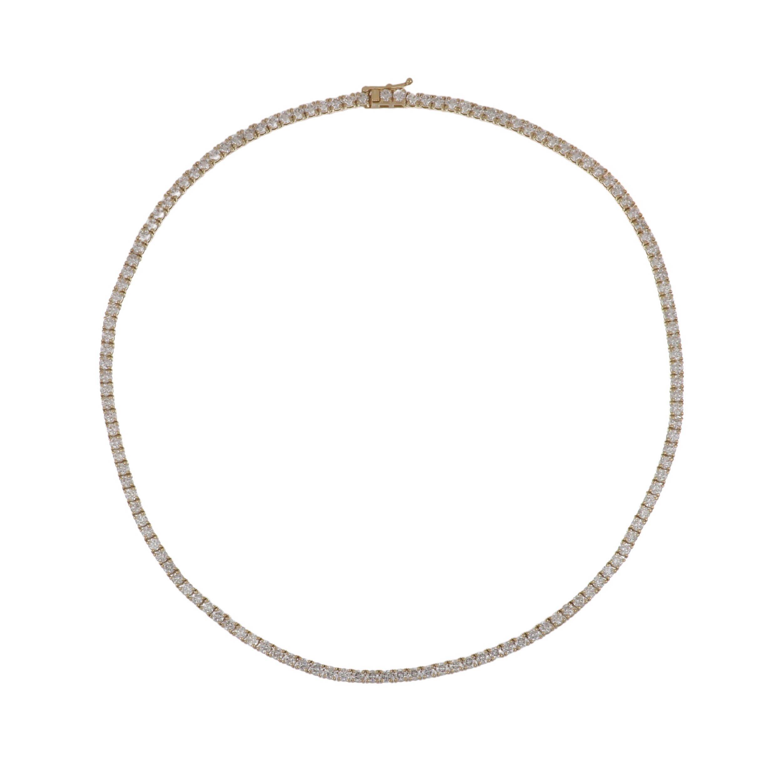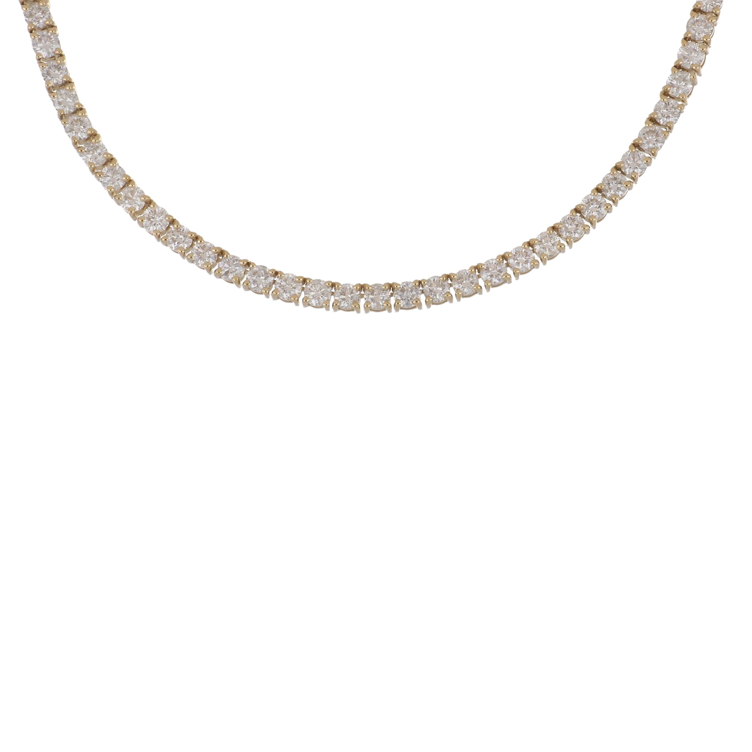 An estate four prong round brilliant-cut diamond tennis necklace, set in 14K yellow gold. Circa 2020.