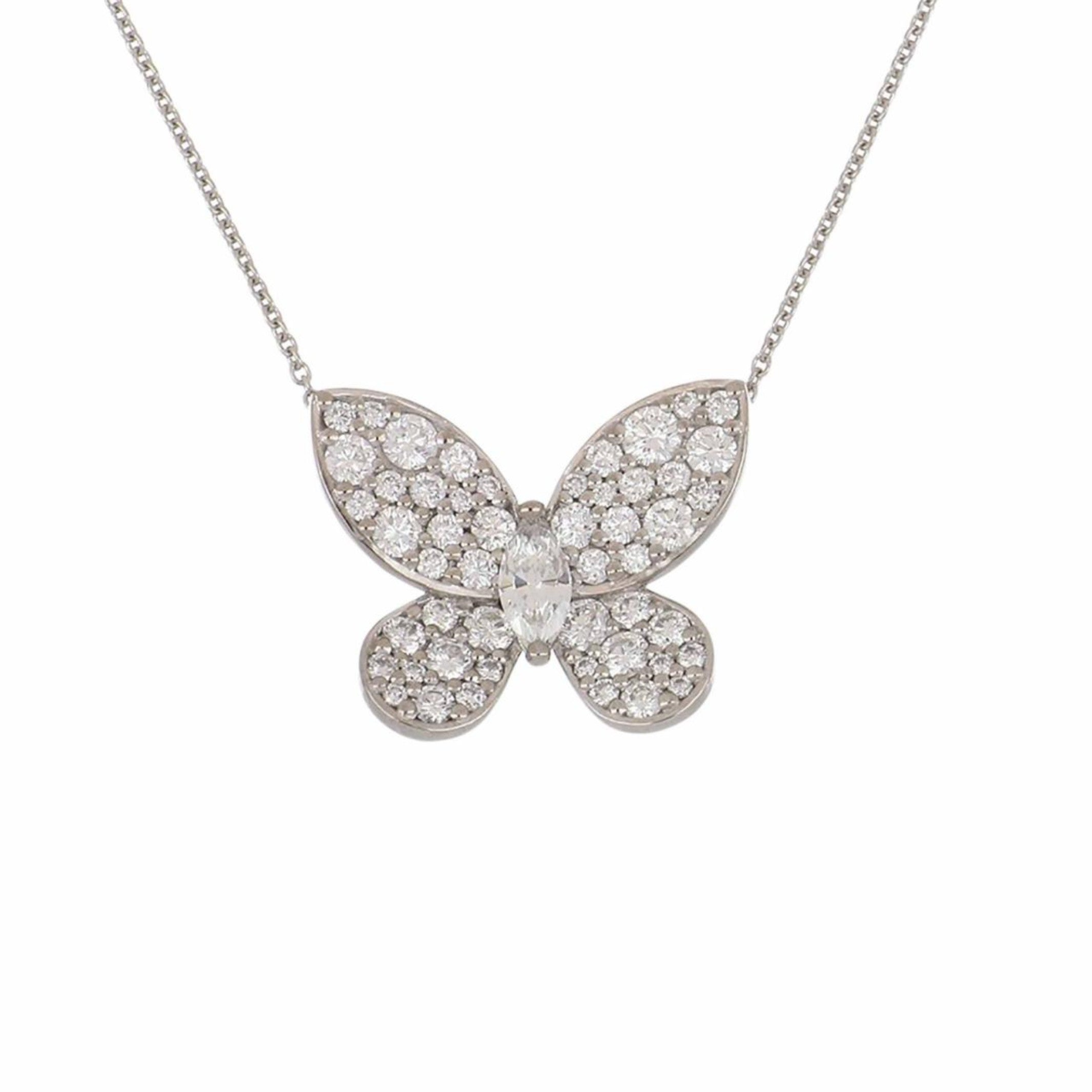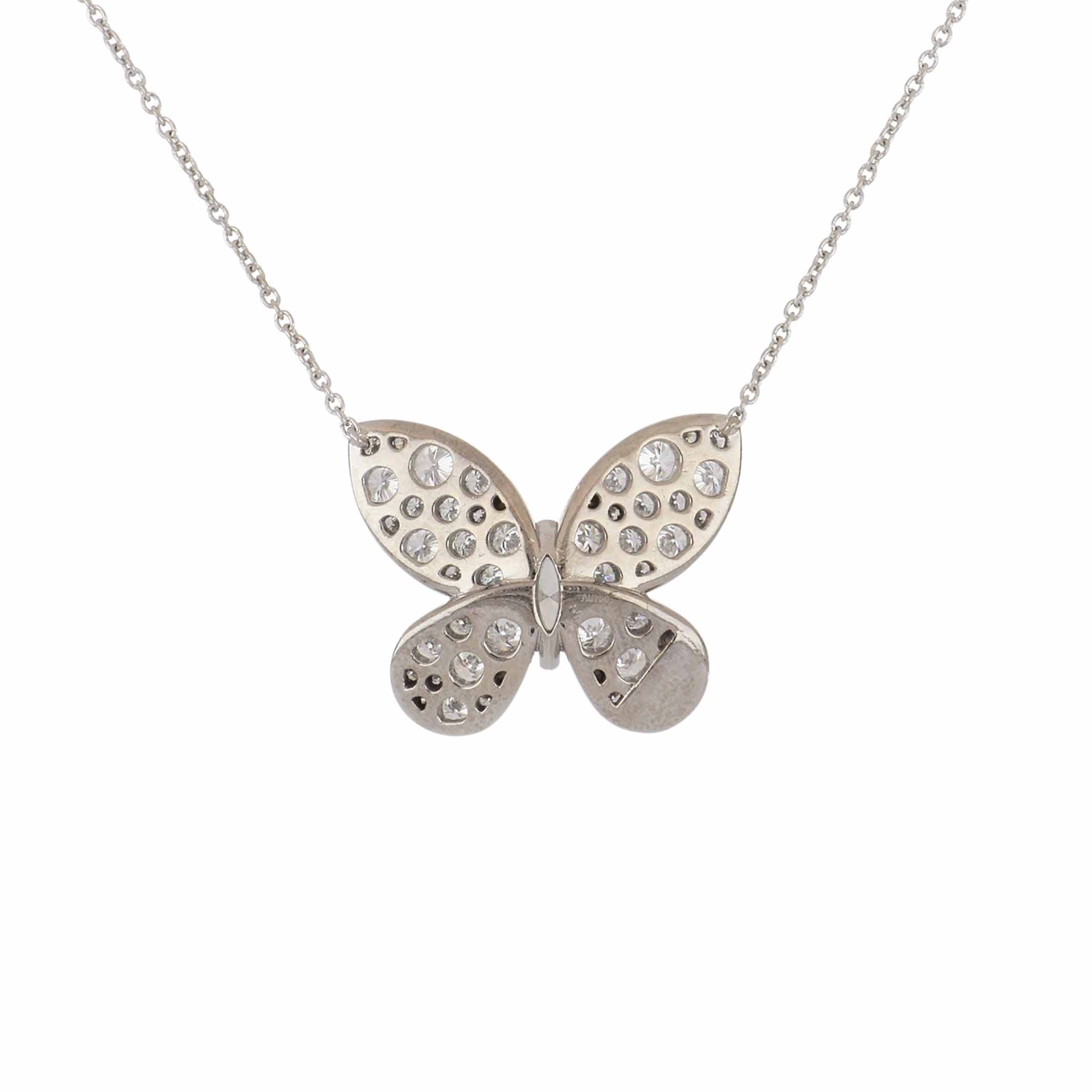 An estate Graff pave diamond butterfly pendant necklace set in 18k white gold. Circa 2020.Vintage & Estate Collection51 diamonds: 1.80 total carat weightE-F color, VVS1-VS1 clarity