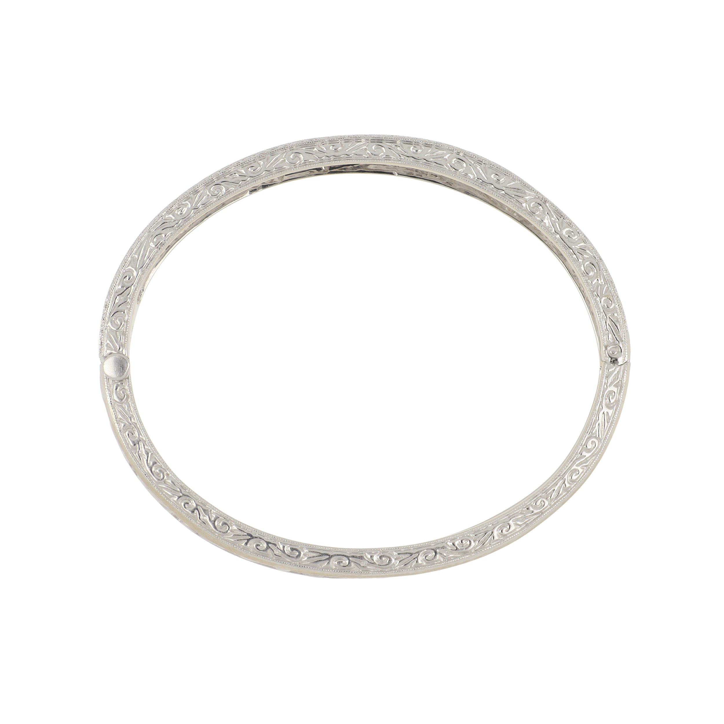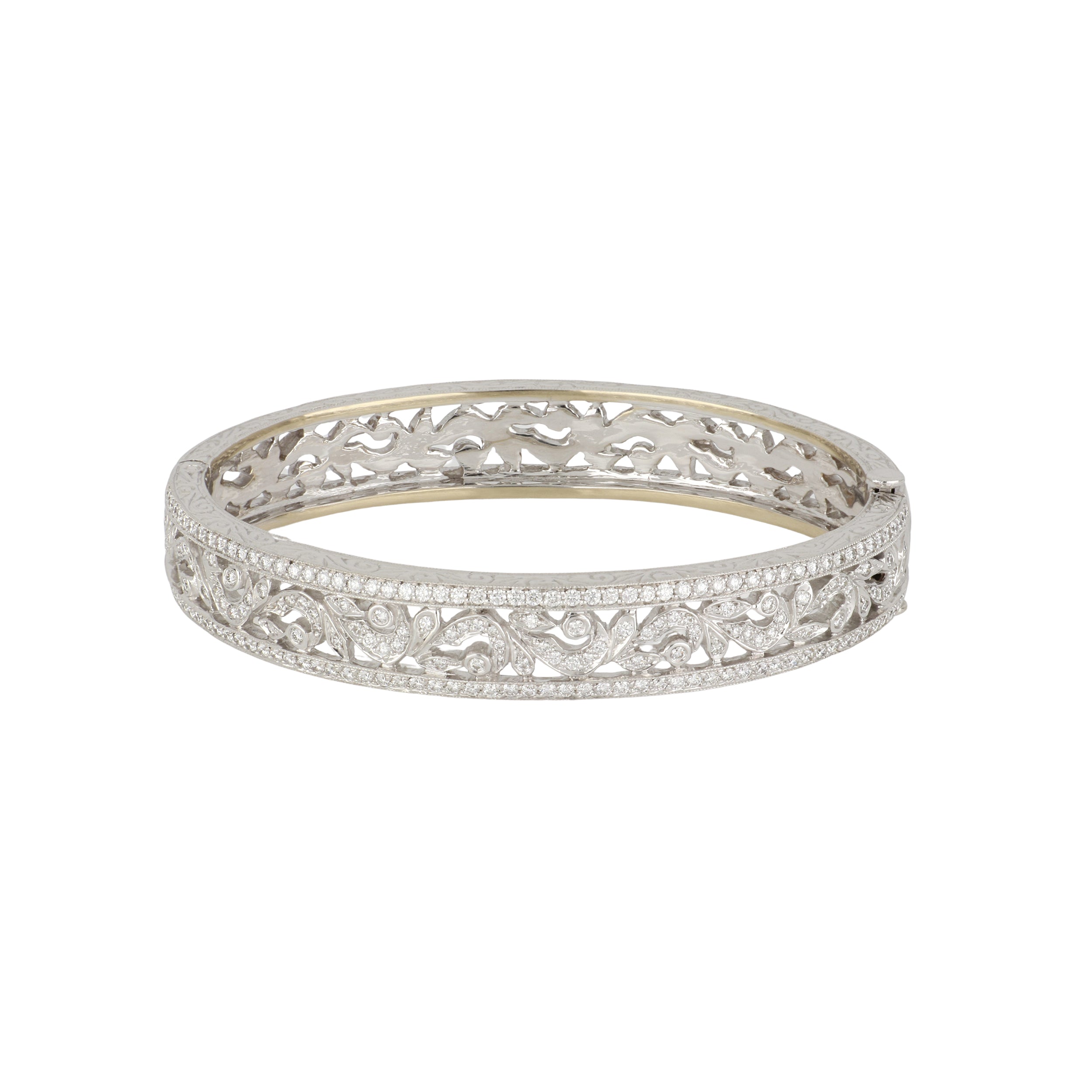 An estate Penny Preville hinged bangle bracelet with round brilliant-cut diamonds, set in 18K white gold. Circa 2000.
