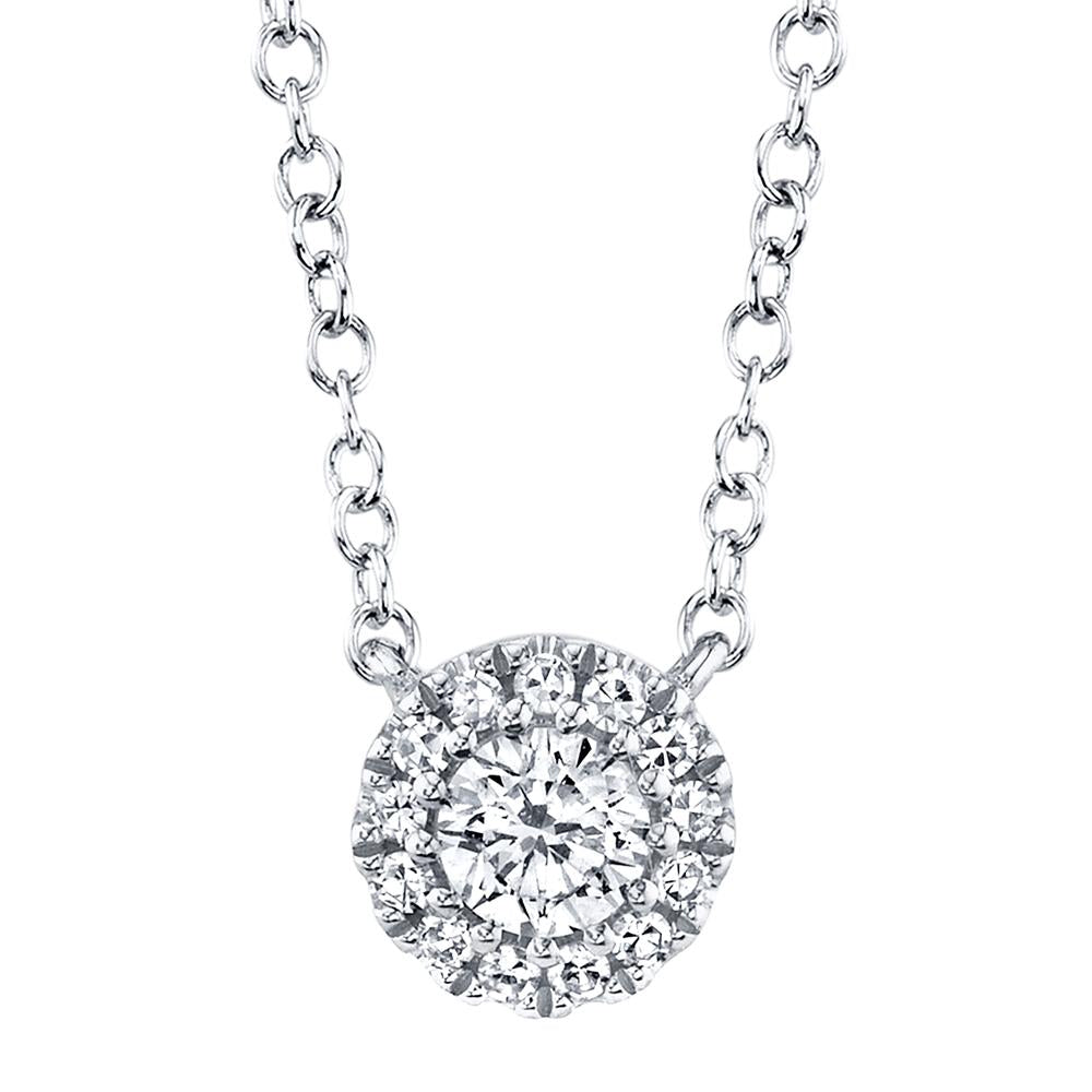 A Shy Creation round diamond halo pendant necklace, set in 14K white gold.