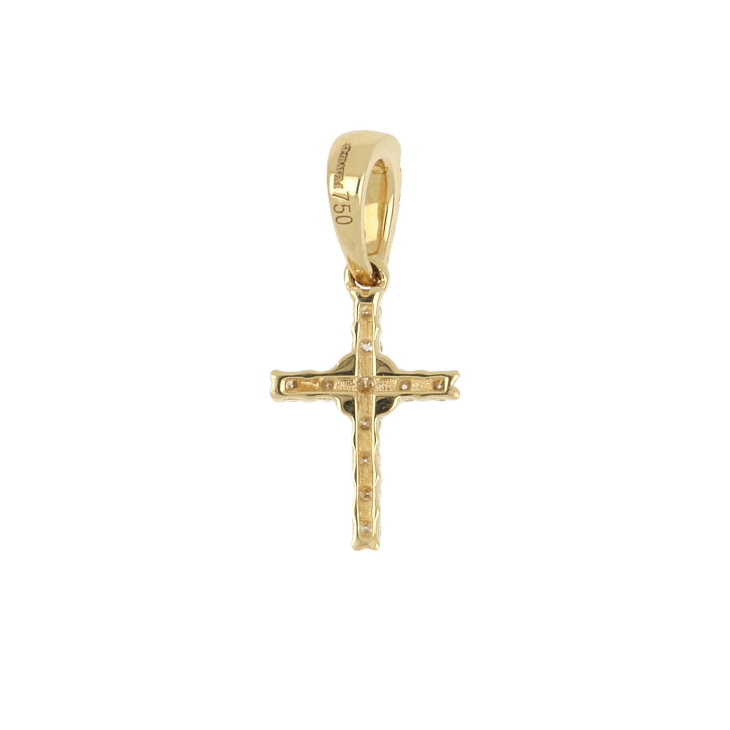 A round-cut diamond cross with a diamond bail, set in 18K yellow gold.
