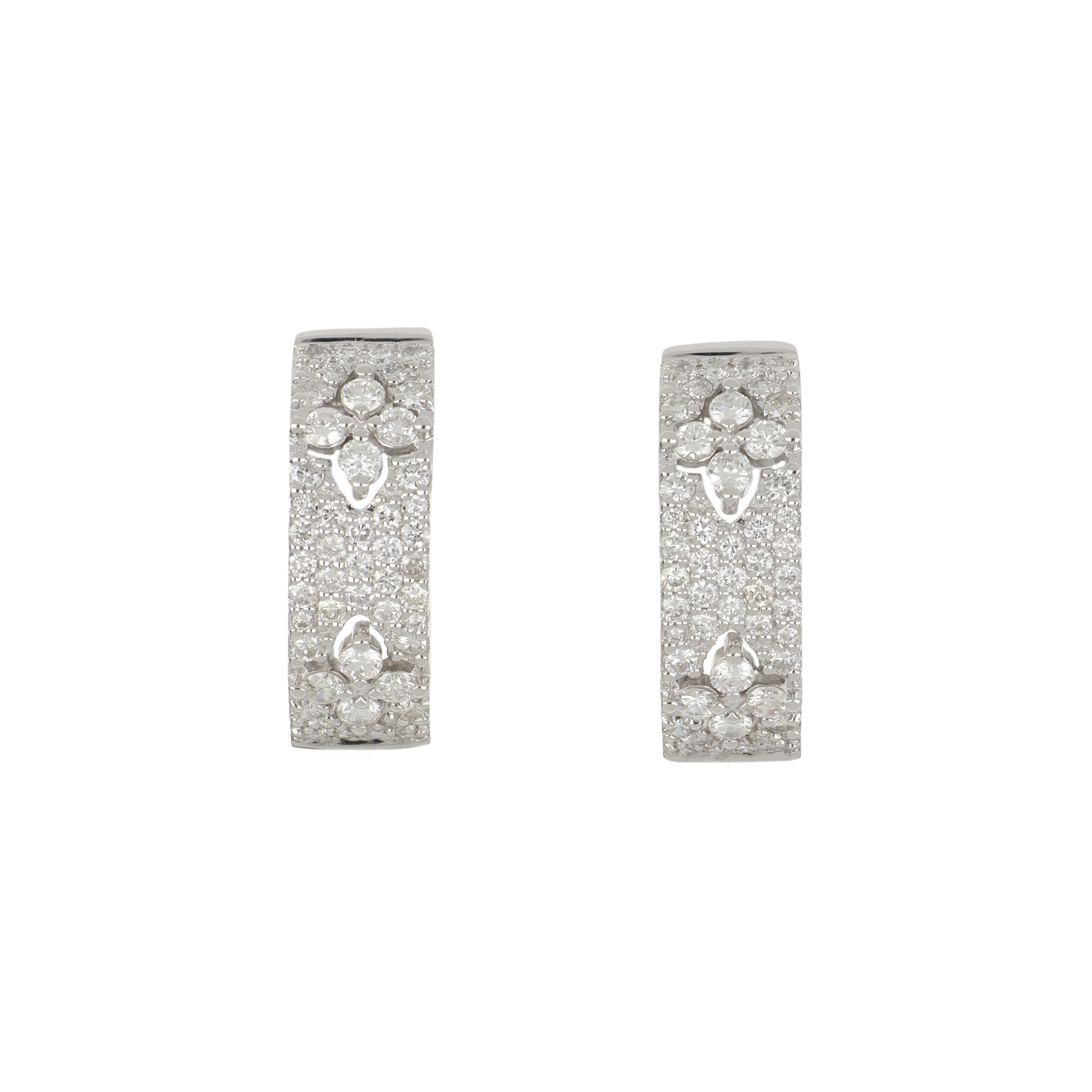 A pair of round brilliant-cut diamond cluster huggie earrings, set in 18K white gold.