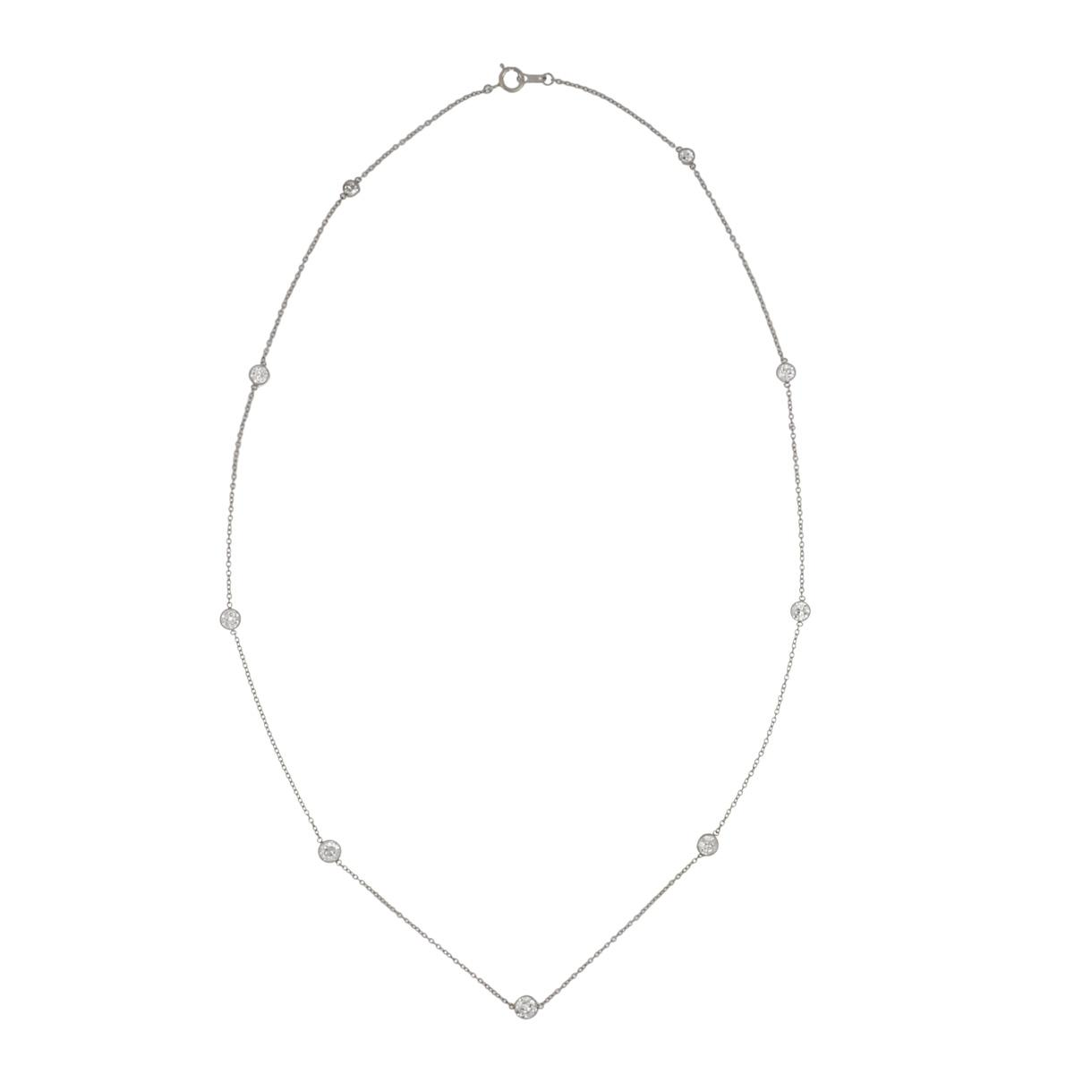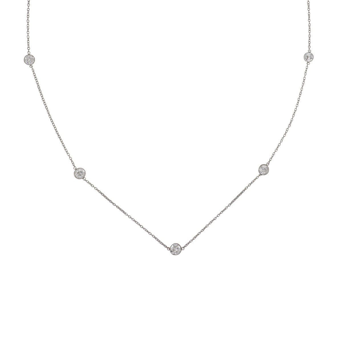 A platinum diamond by the yard necklace made with antique Old European-cut diamonds.