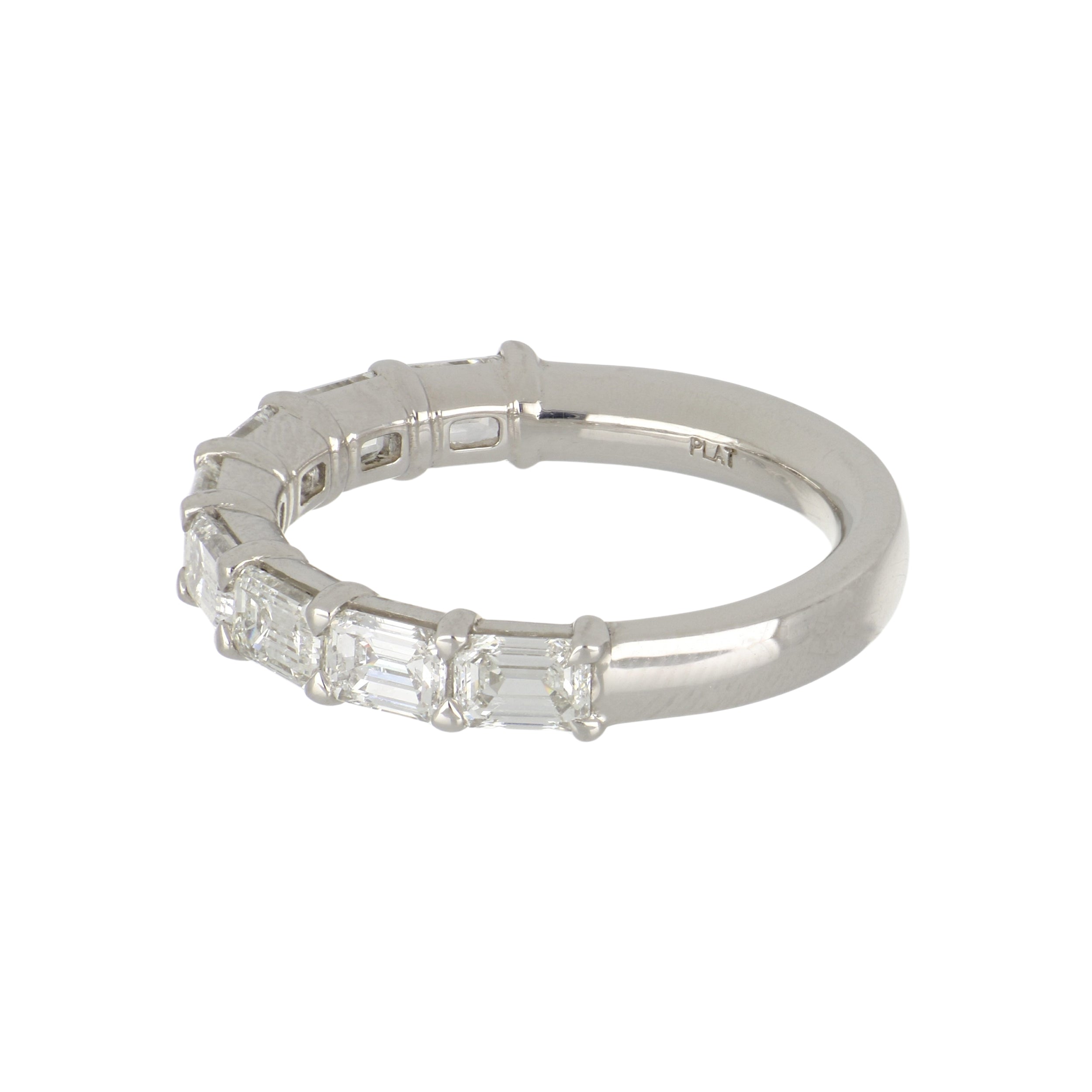 A shared prong emerald-cut diamond halfway band set horizontally in platinum.